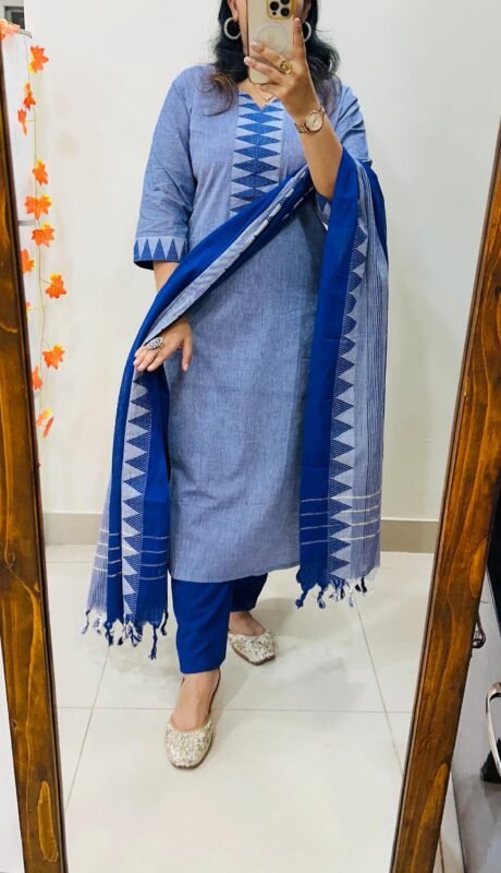 Beautiful V Neck kurti pant dupatta set in Premium Cotton with Sequin Detailing work in yoke paired with fine Cotton dupatta
