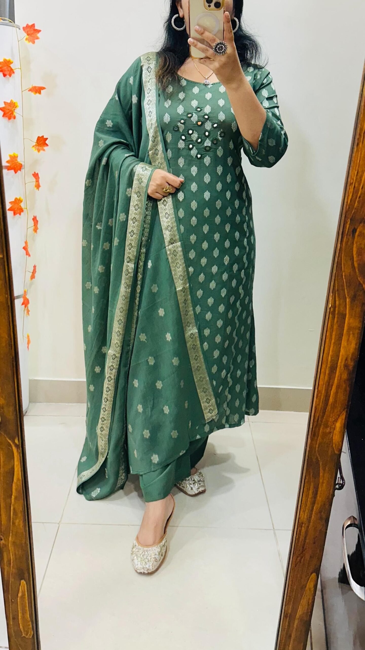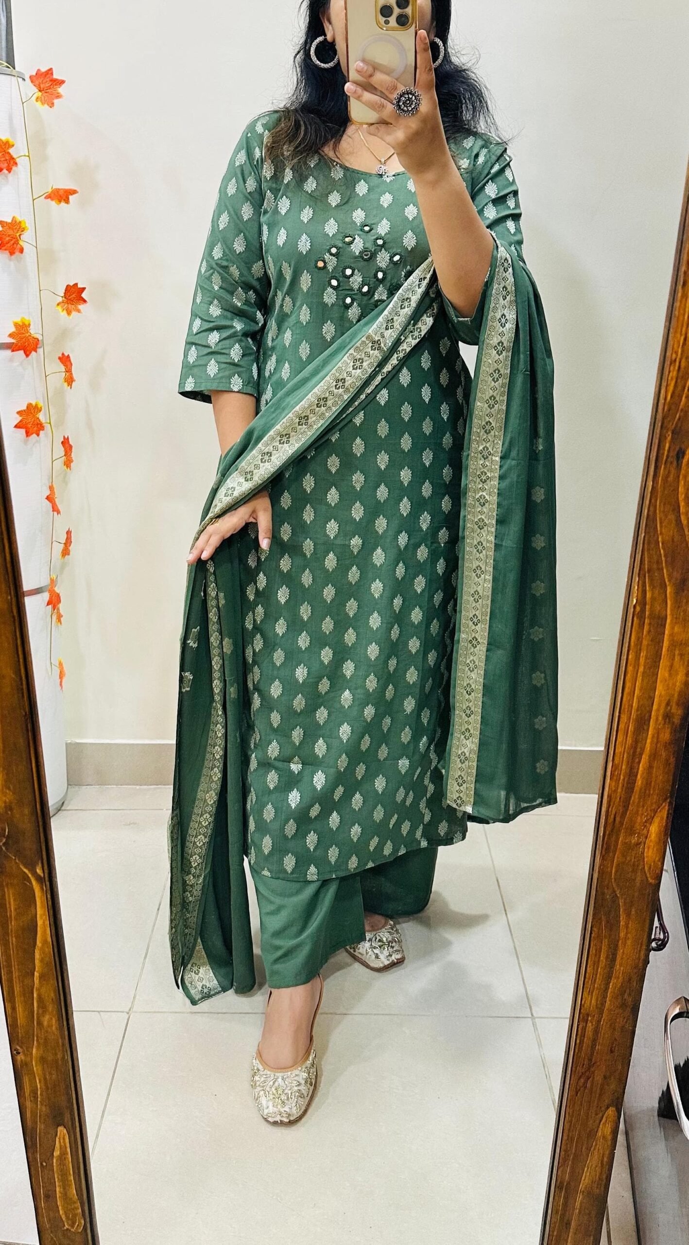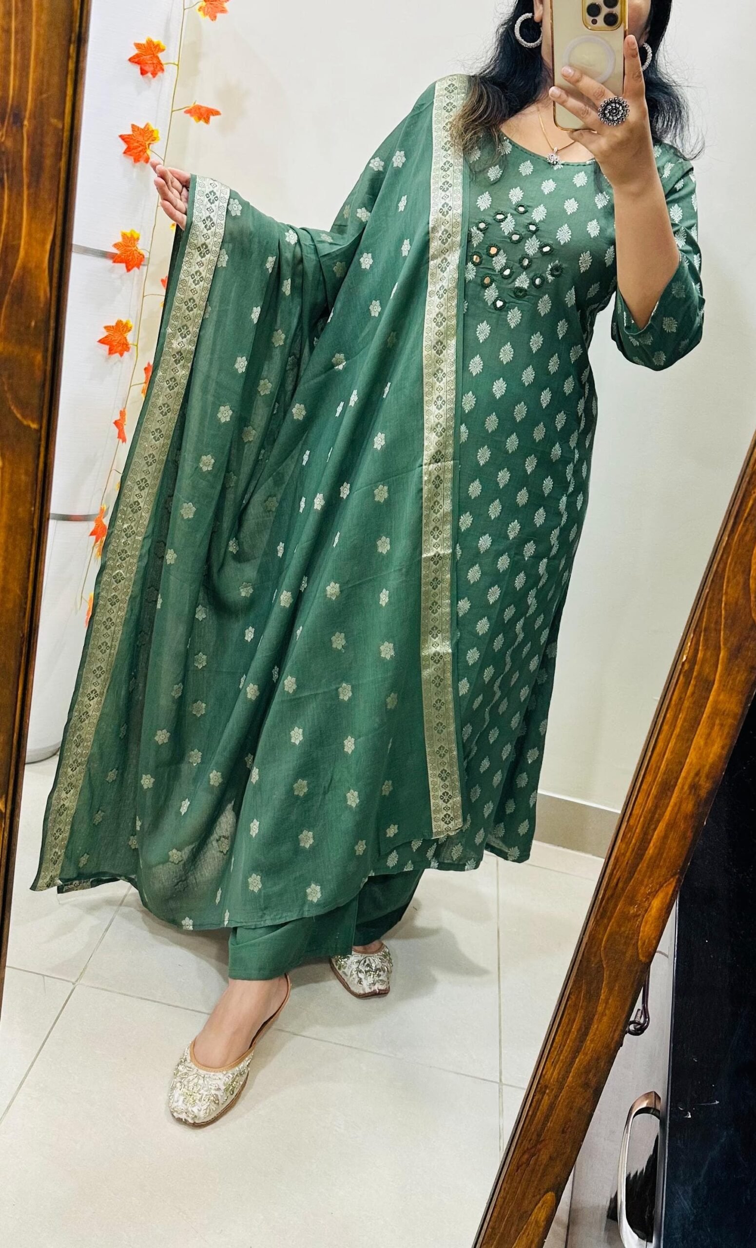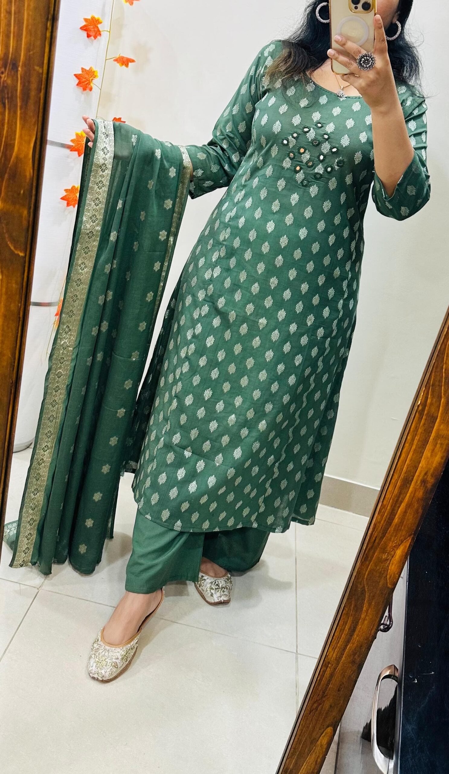 The outfit is a traditional Indian Ethnic wear,suitable for Festive or semi formal occasions