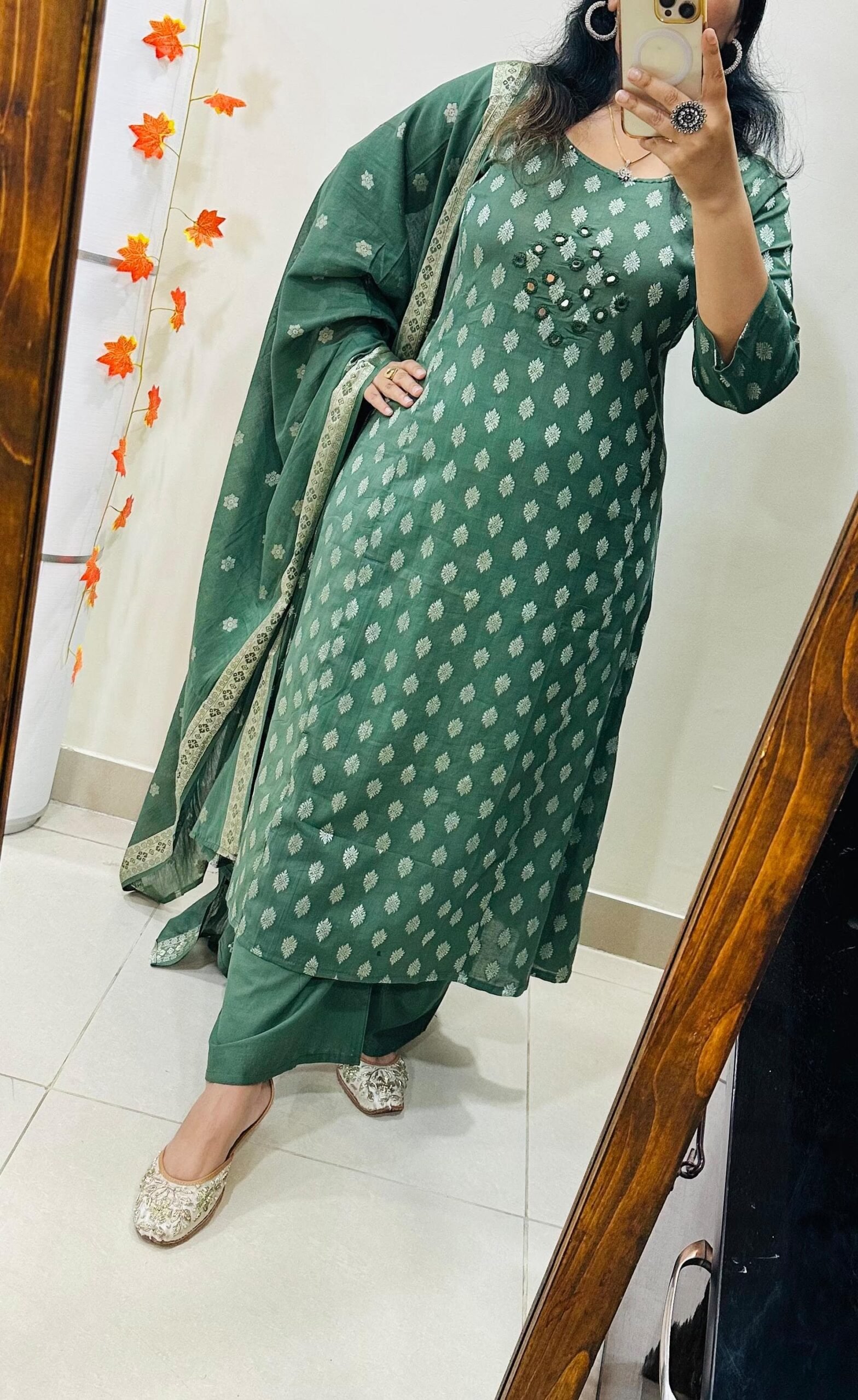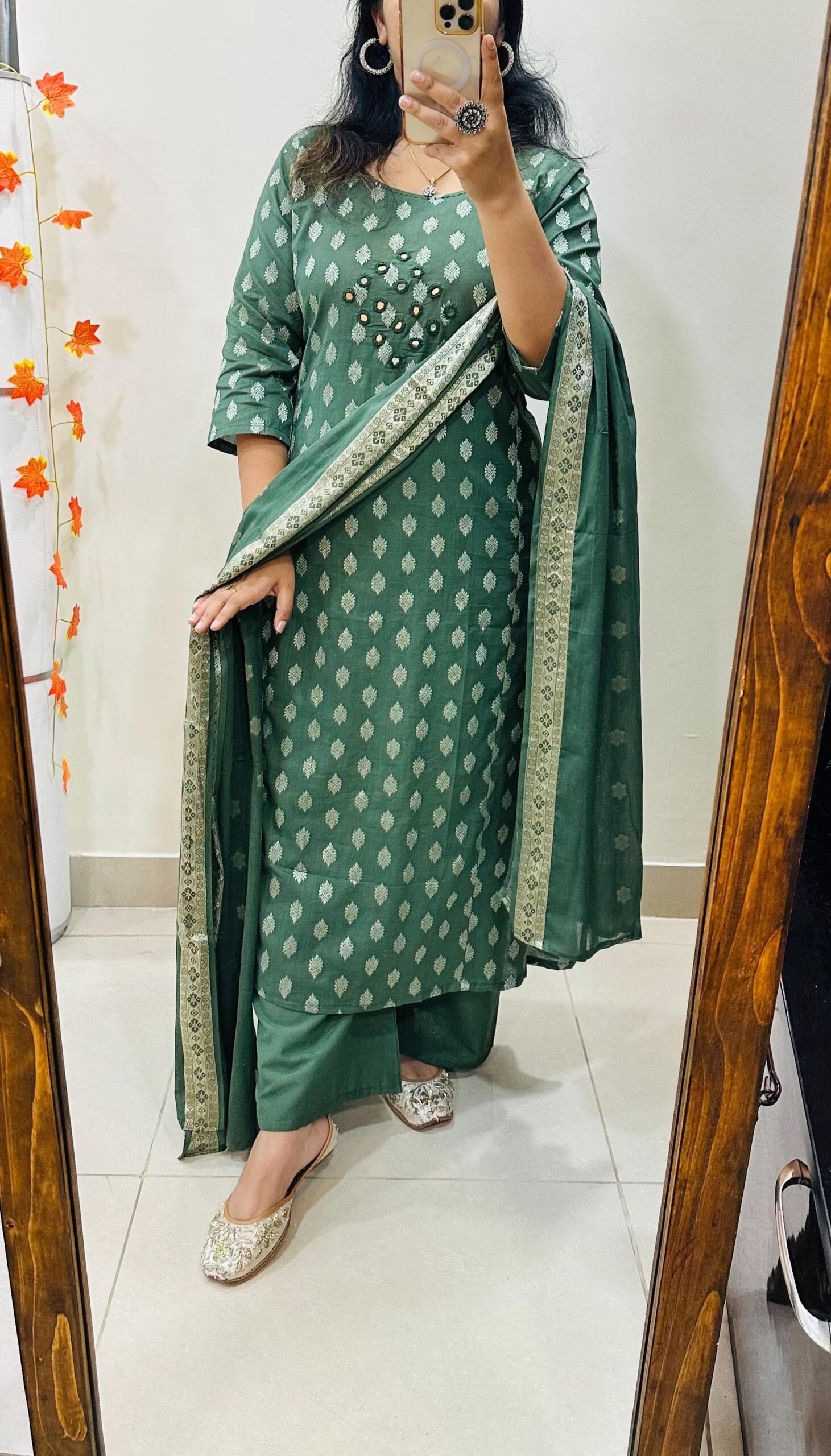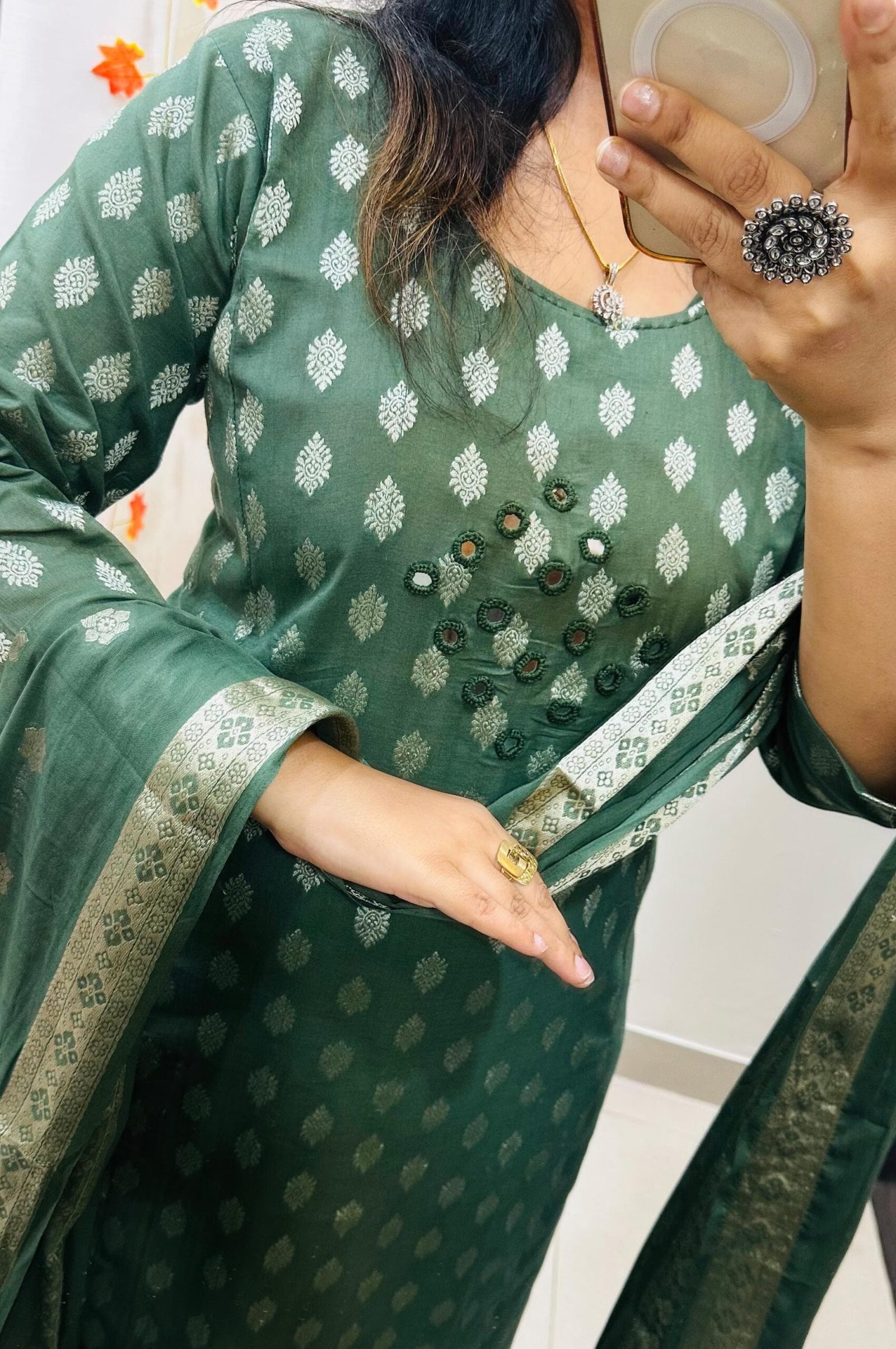 Beautiful kurti palazzo dupatta set in Premium Fine Cotton with weaving Work and heavy original Mirror work in yoke with detailing thread sequin in neckline paired with fine mulmul dupatta