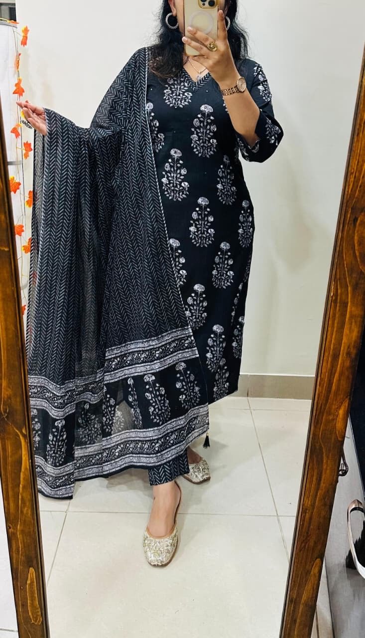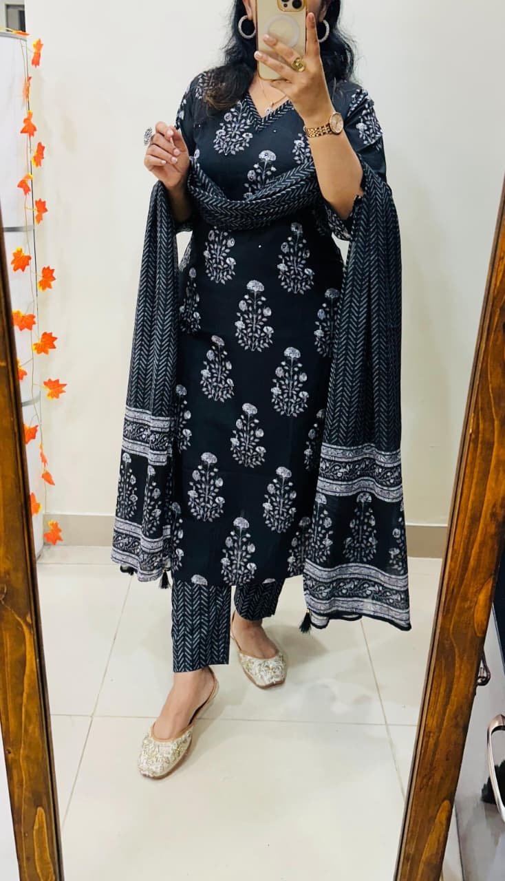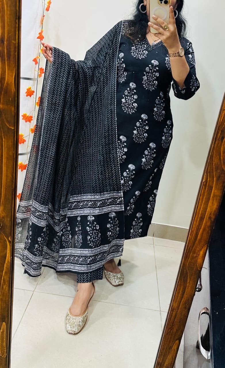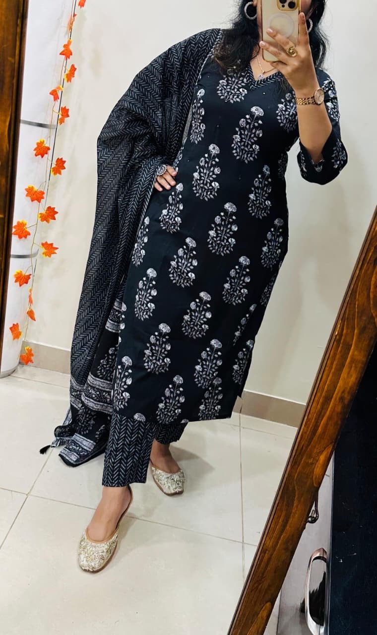 Beautiful designer black and white floral printed kurti pant dupatta set in Premium Azrakh Cotton with heavy sequin detailing work in yoke paired with fine azrak cotton dupatta with tussels