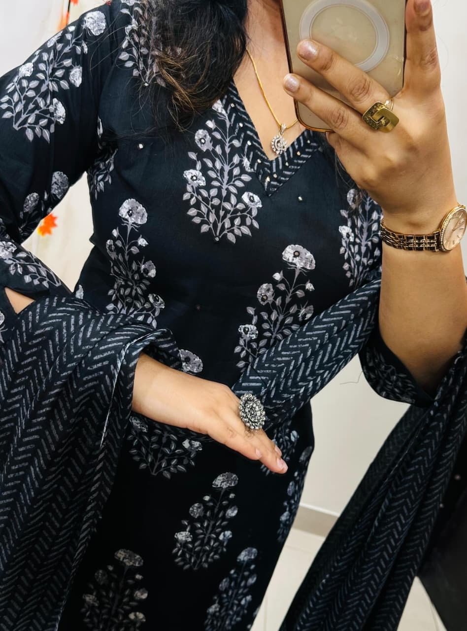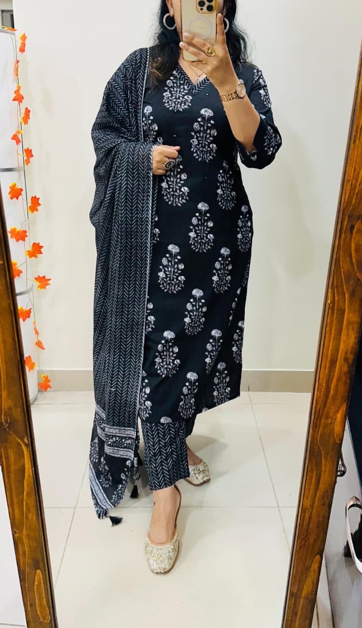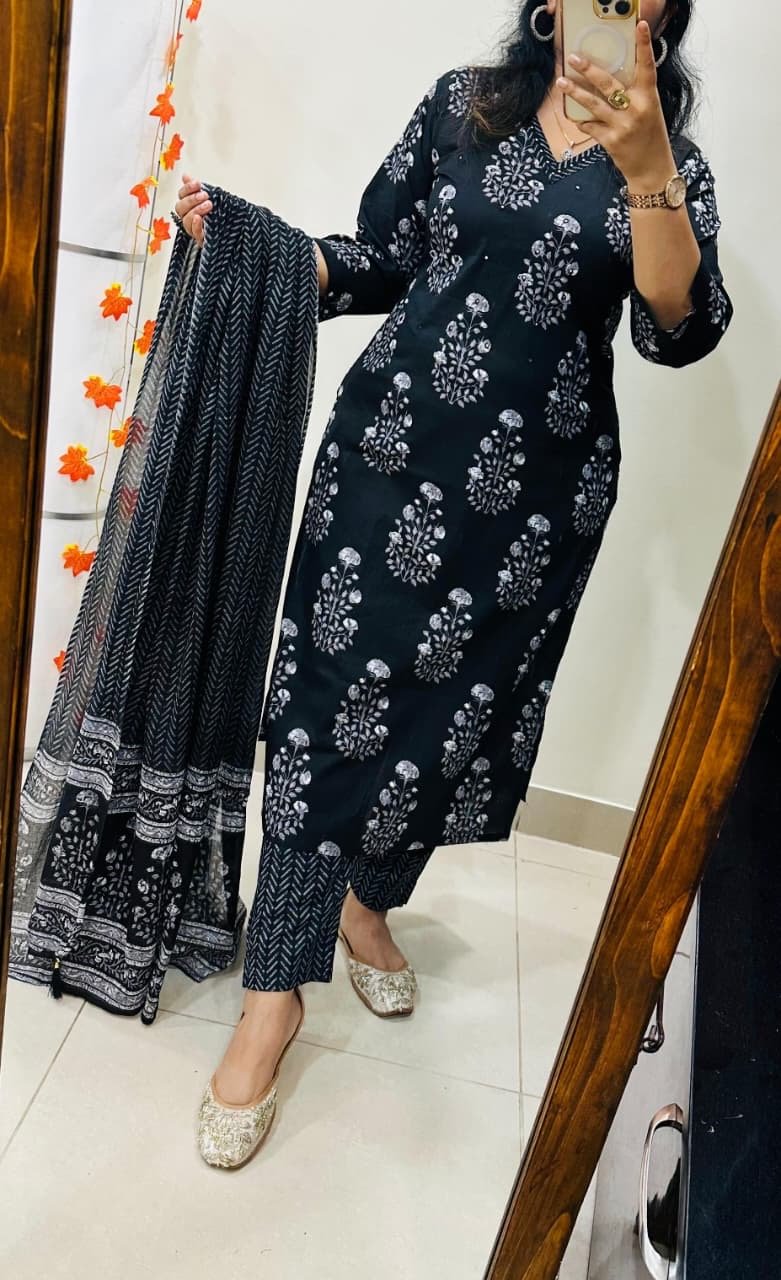 Beautiful designer black and white floral printed kurti pant dupatta set in Premium Azrakh Cotton with heavy sequin detailing work in yoke paired with fine azrak cotton dupatta with tussels
