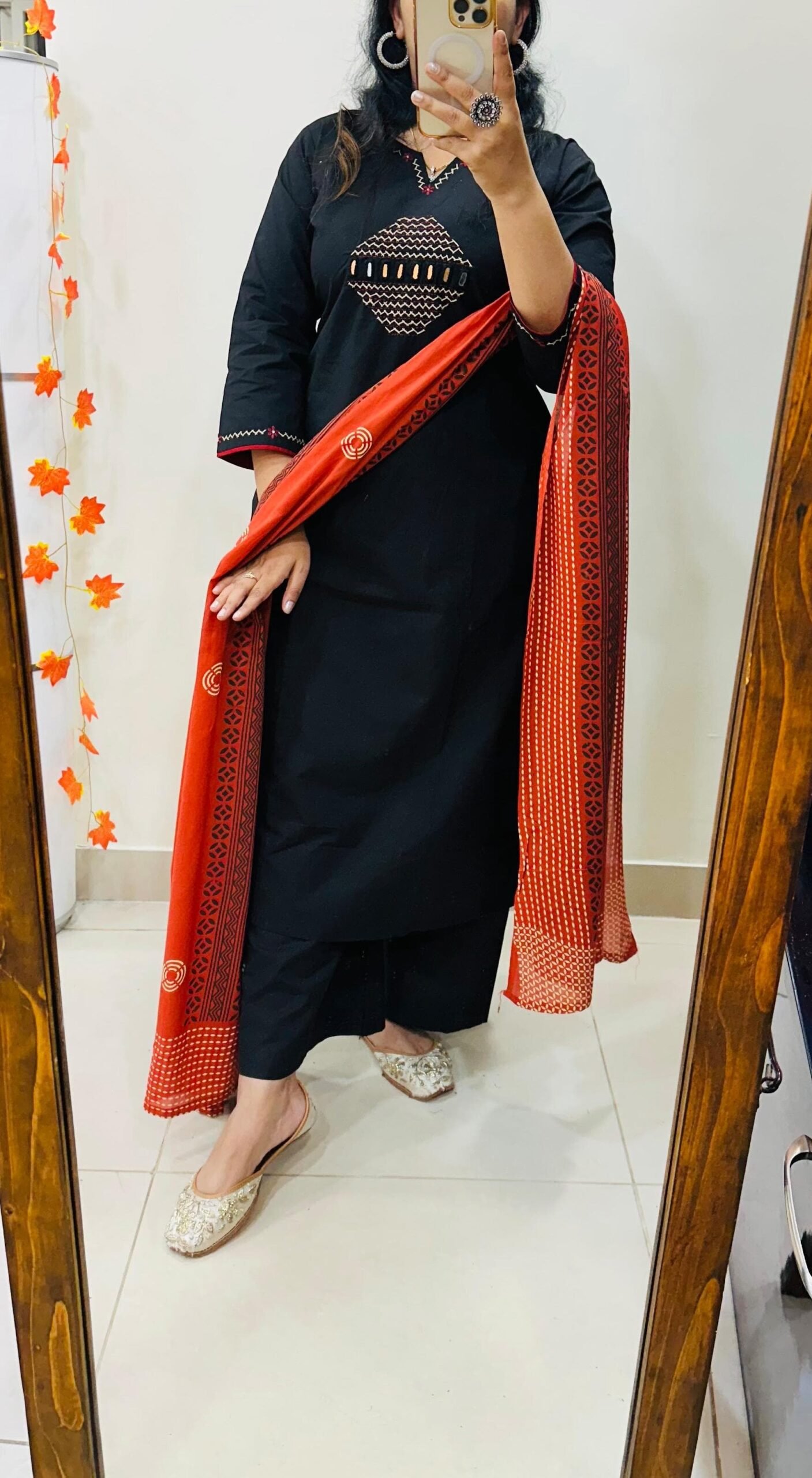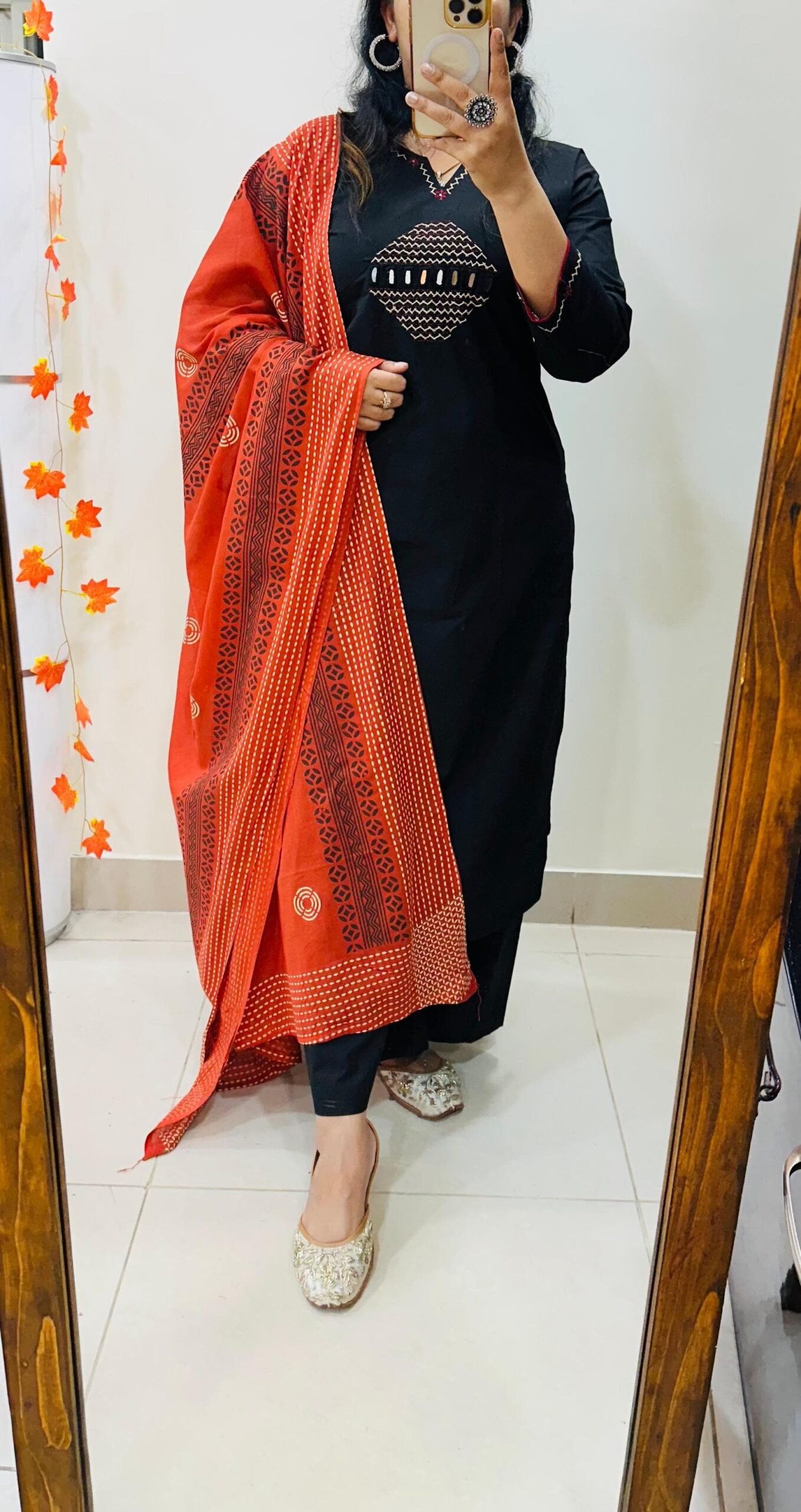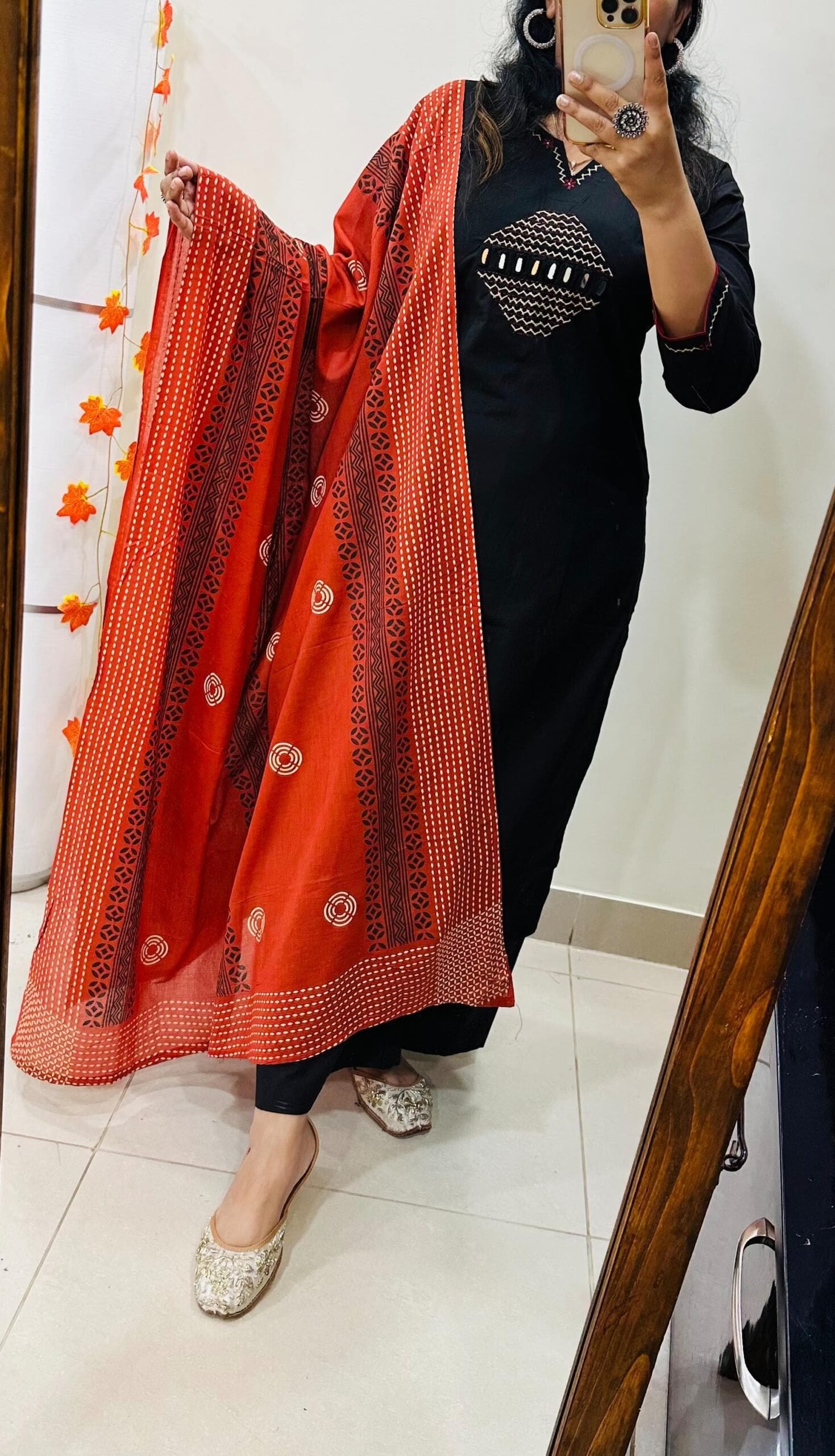 Beautiful Designer kurti palazzo dupatta set in Premium Dhabu Cotton with thread embroidery in neckline & sleeves with real mirror work in yoke paired with block prints cotton dupatta
