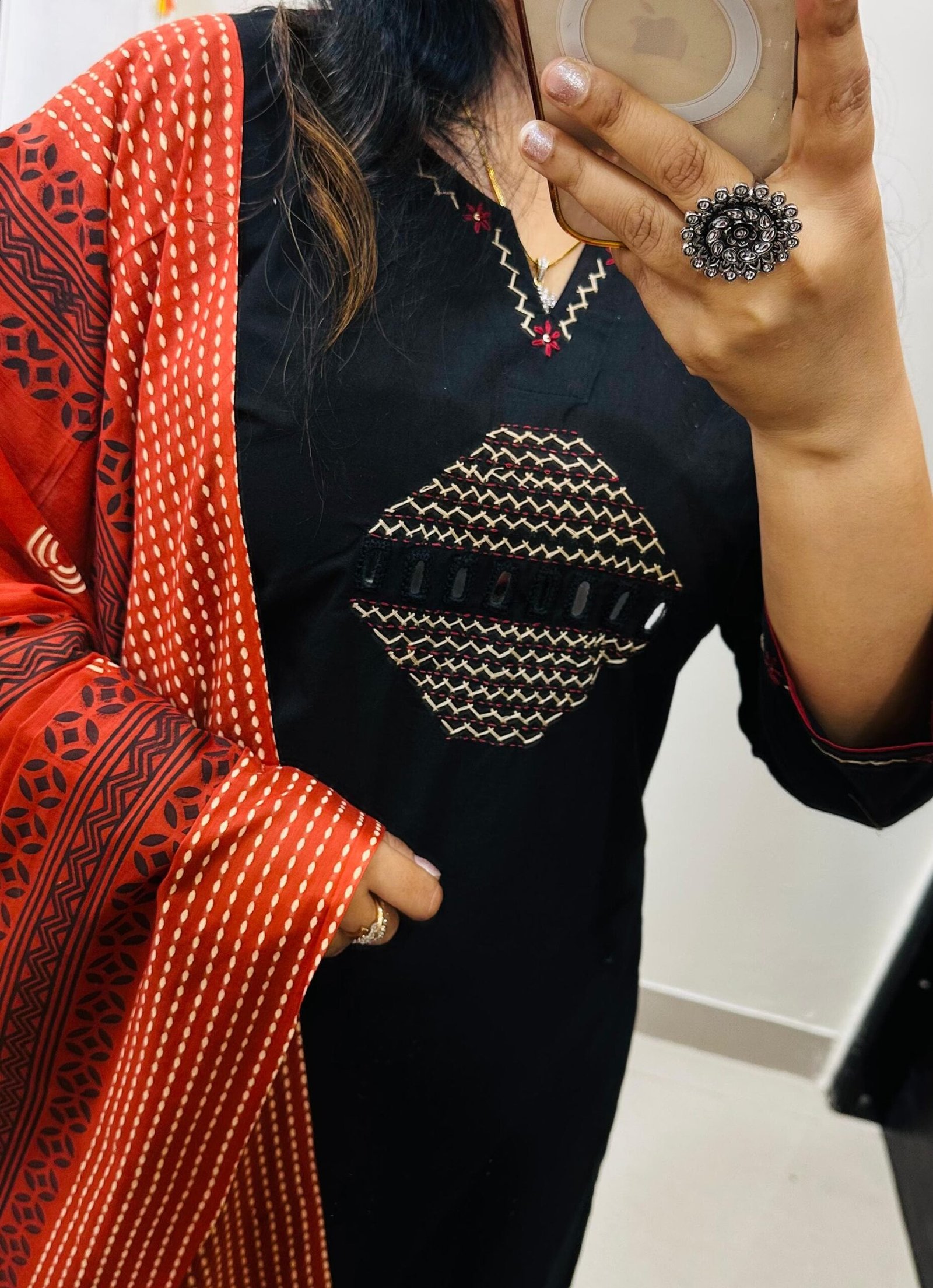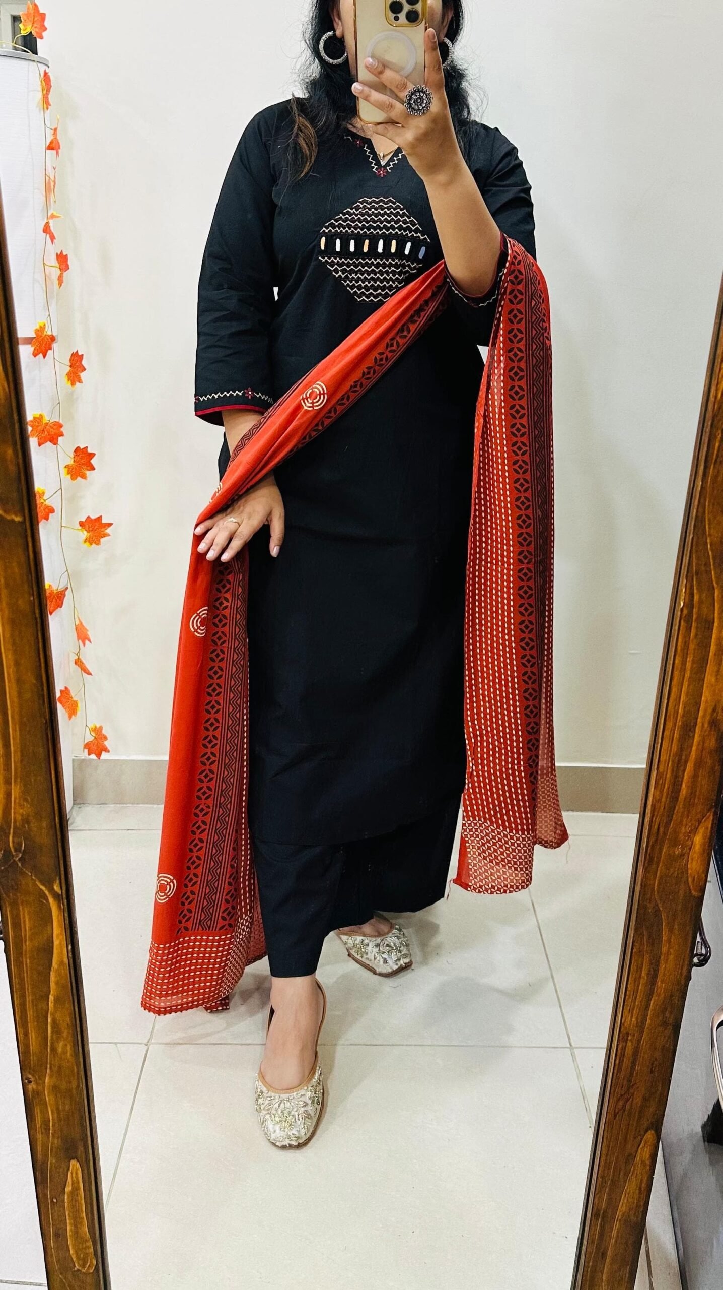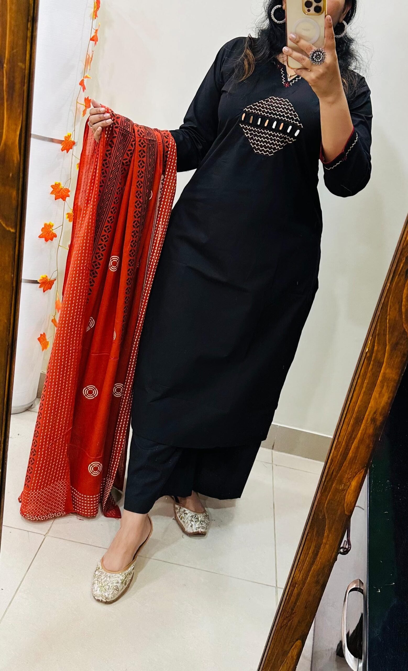 Beautiful Designer kurti palazzo dupatta set in Premium Dhabu Cotton with thread embroidery in neckline & sleeves with real mirror work in yoke paired with block prints cotton dupatta