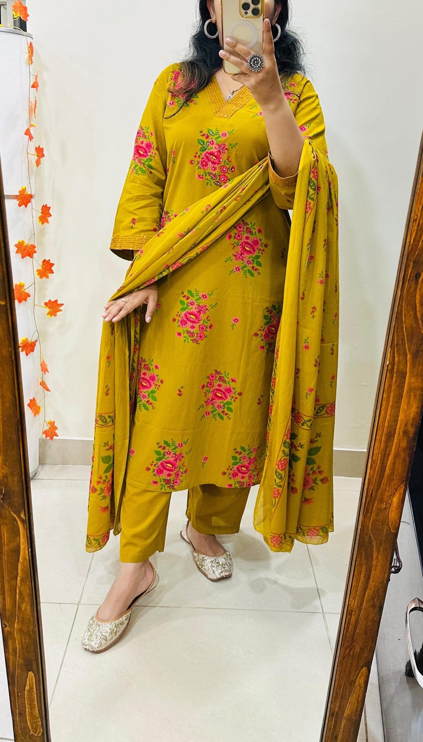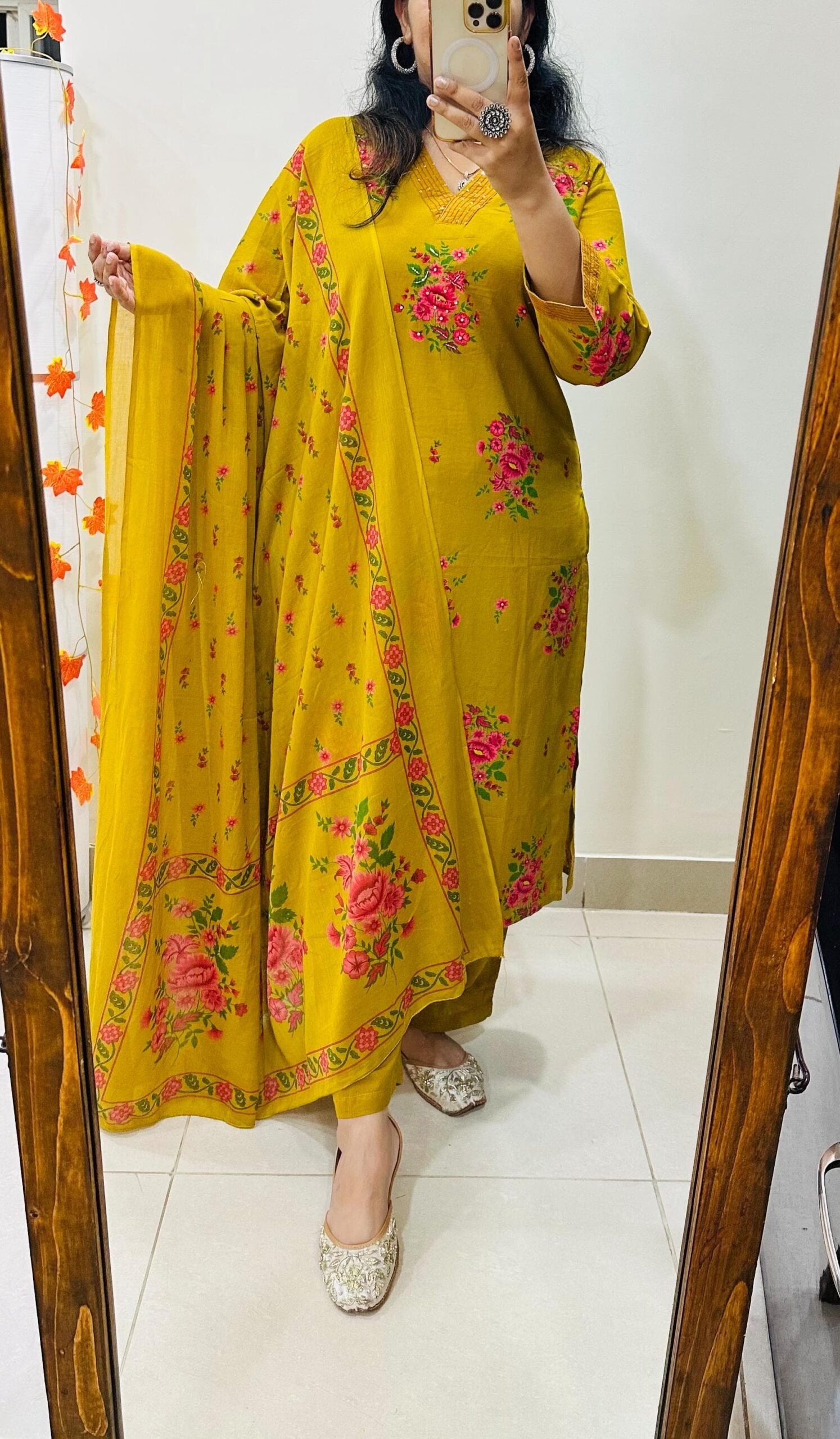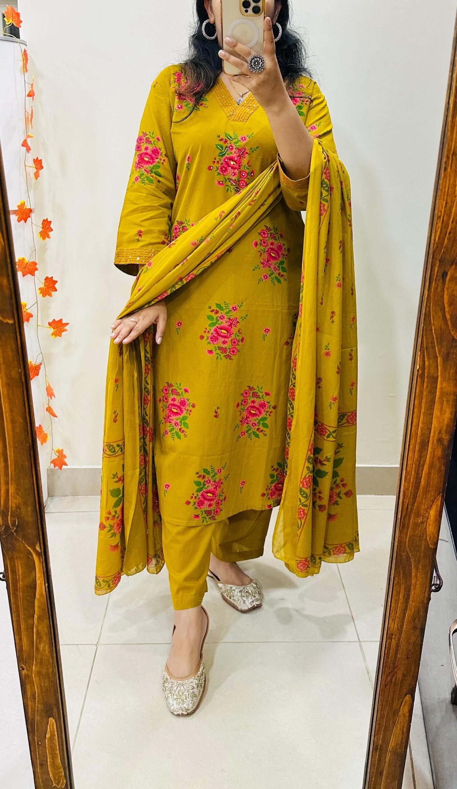 Beautiful kurti pant dupatta set in Premium Fine Cotton with sequin and adda patra Work detailing in yoke and sleeves paired with fine mulmul Cotton dupatta