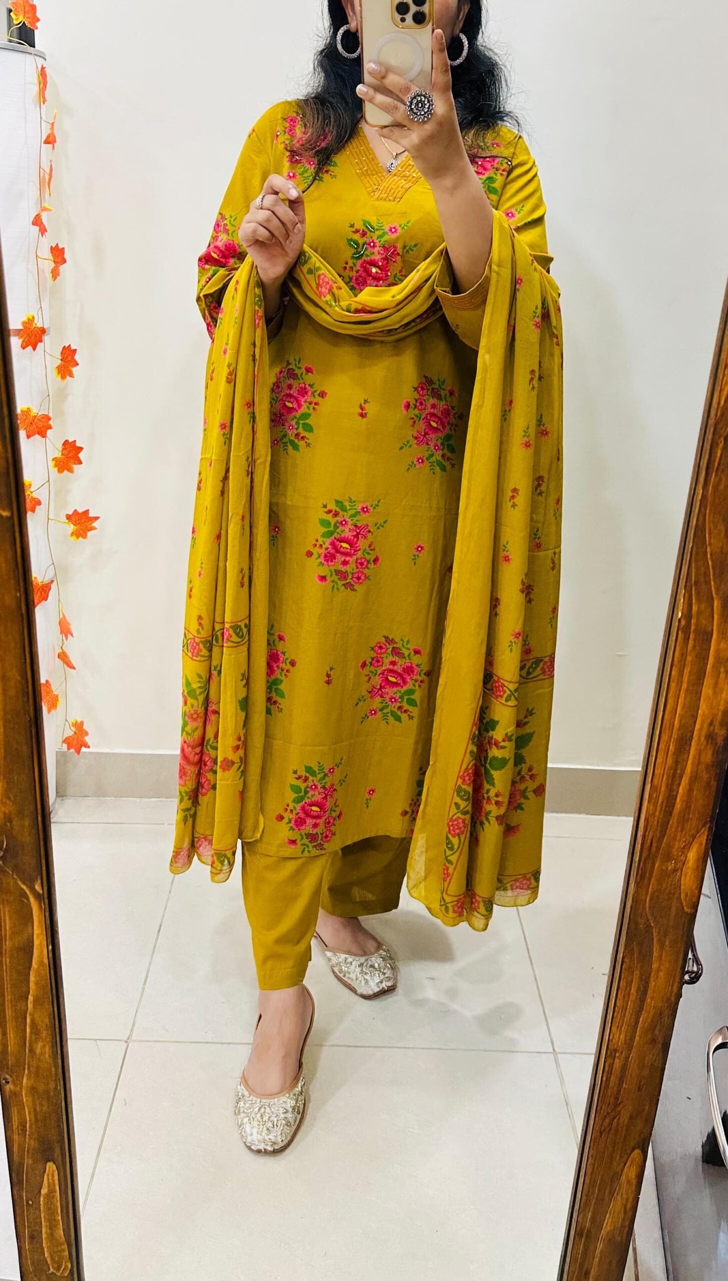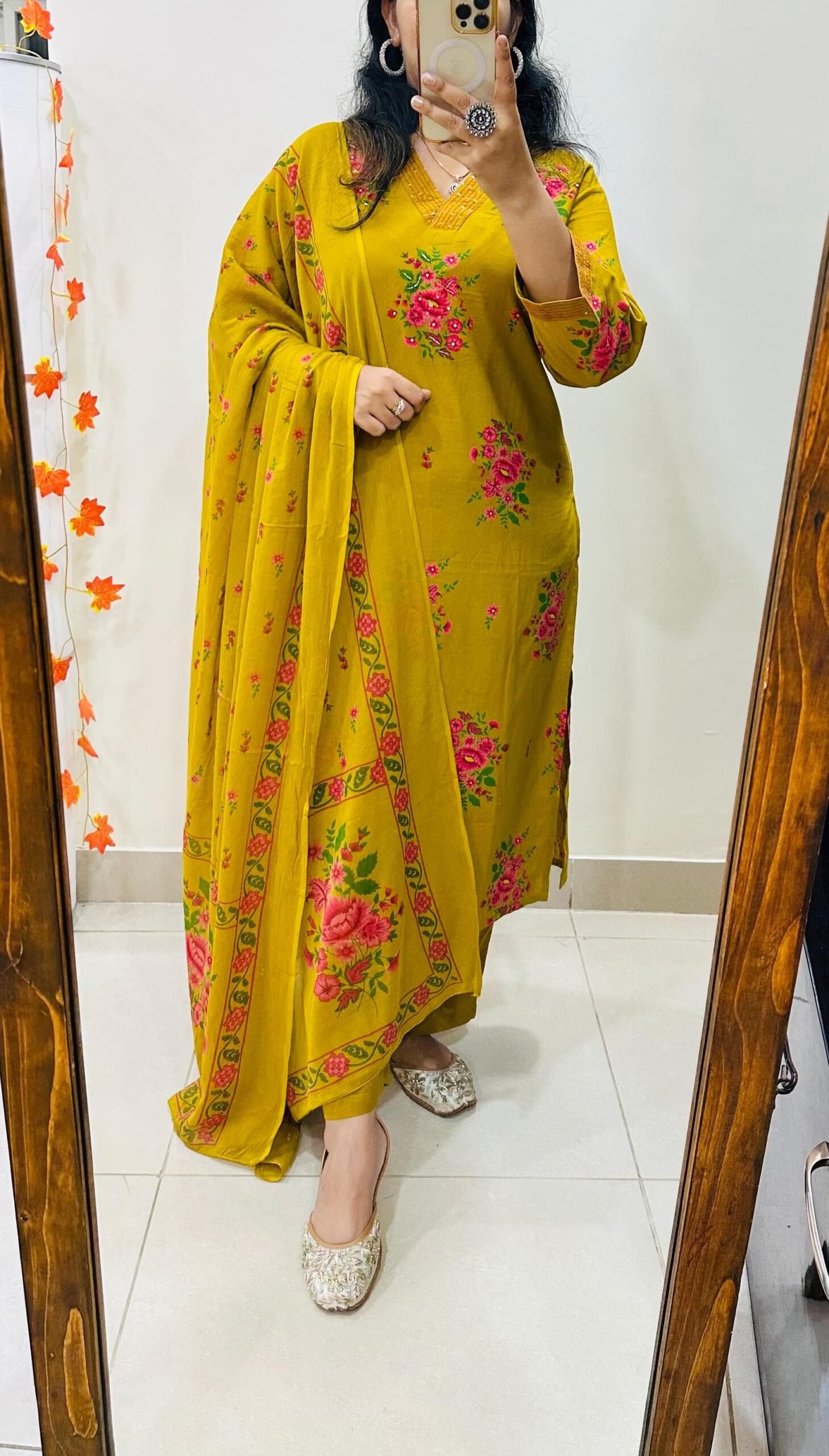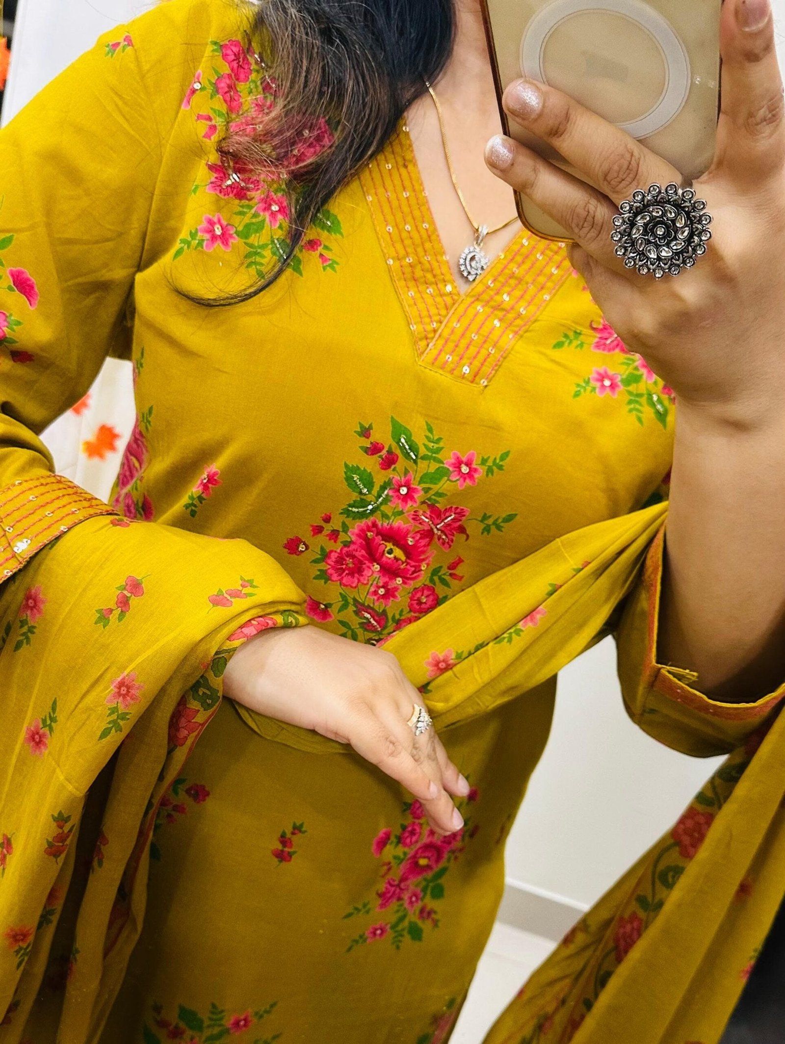 Beautiful kurti pant dupatta set in Premium Fine Cotton with sequin and adda patra Work detailing in yoke and sleeves paired with fine mulmul Cotton dupatta