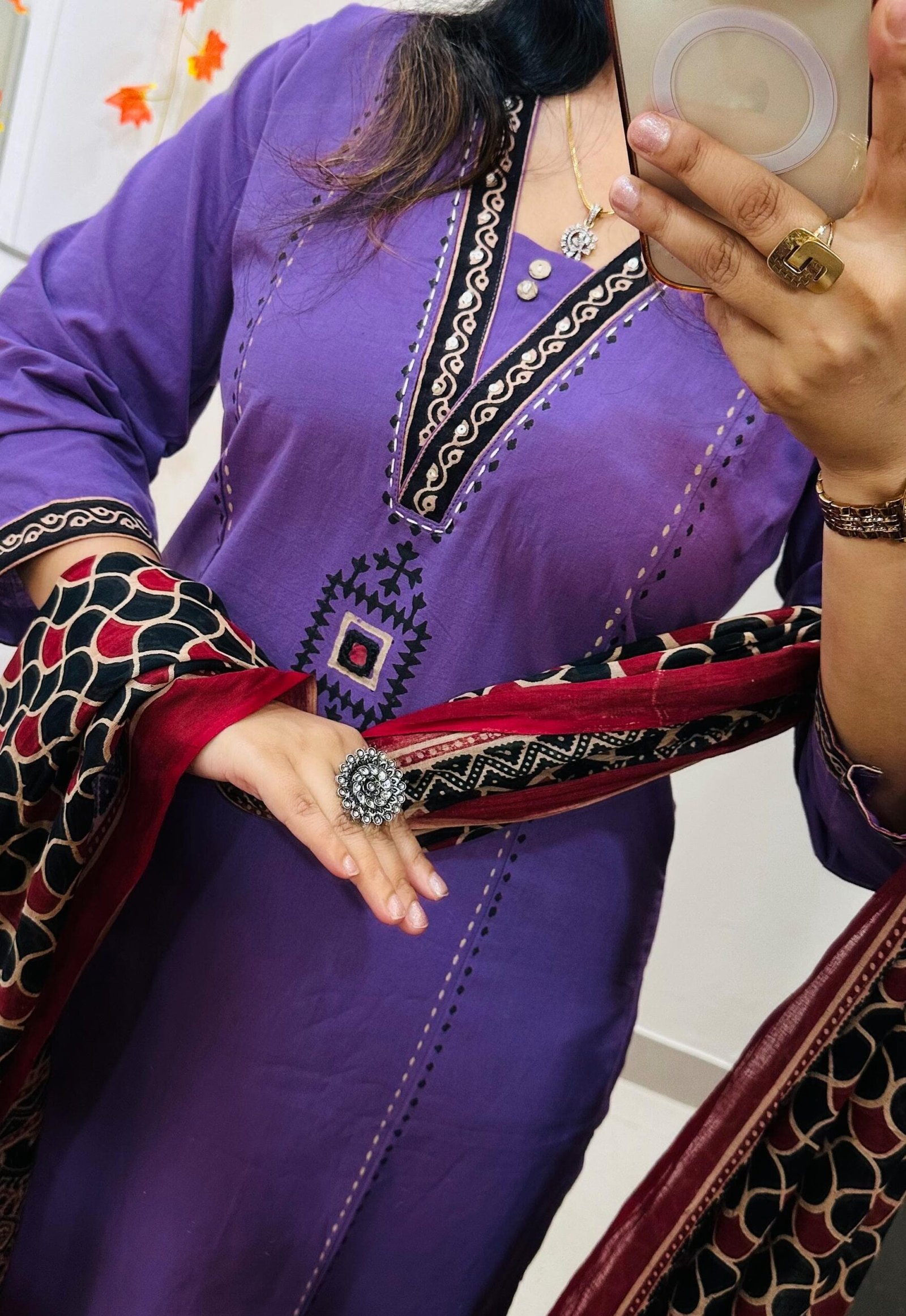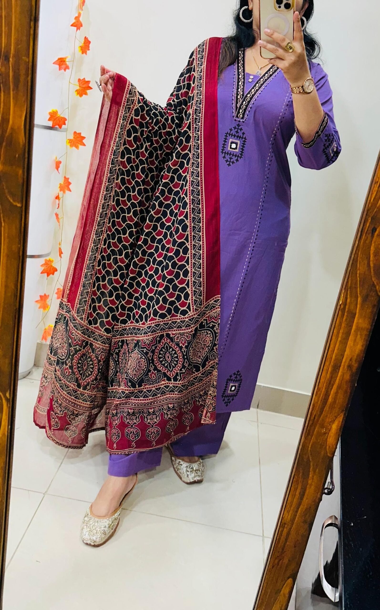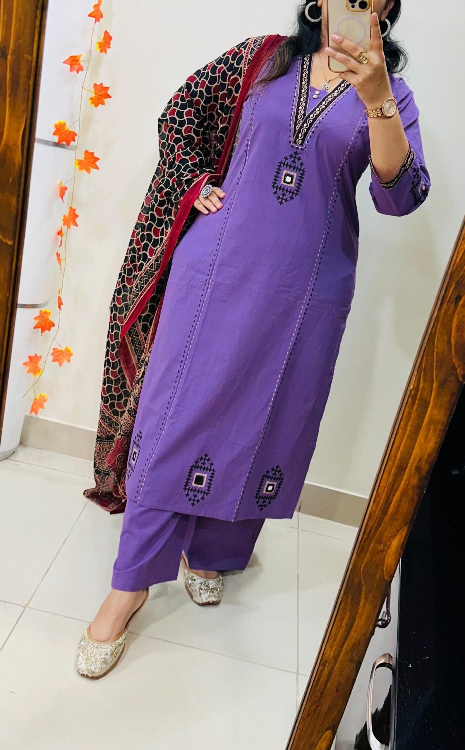 Stylish Ethnic Kurti Pant Dupatta Set in Rich Dhabu cotton fabric with Beautiful block print with original mirror work in yoke and bottom of kurti sleeves and back of kurti paired with fine cotton dupatta… 🎉🎉