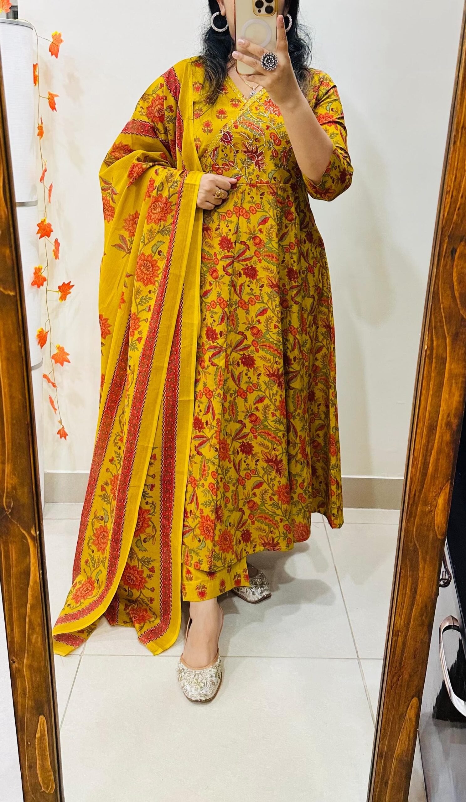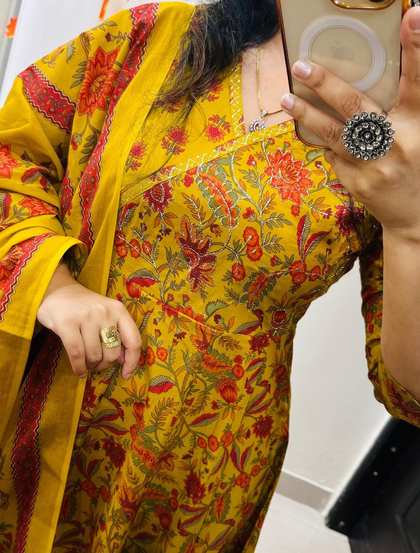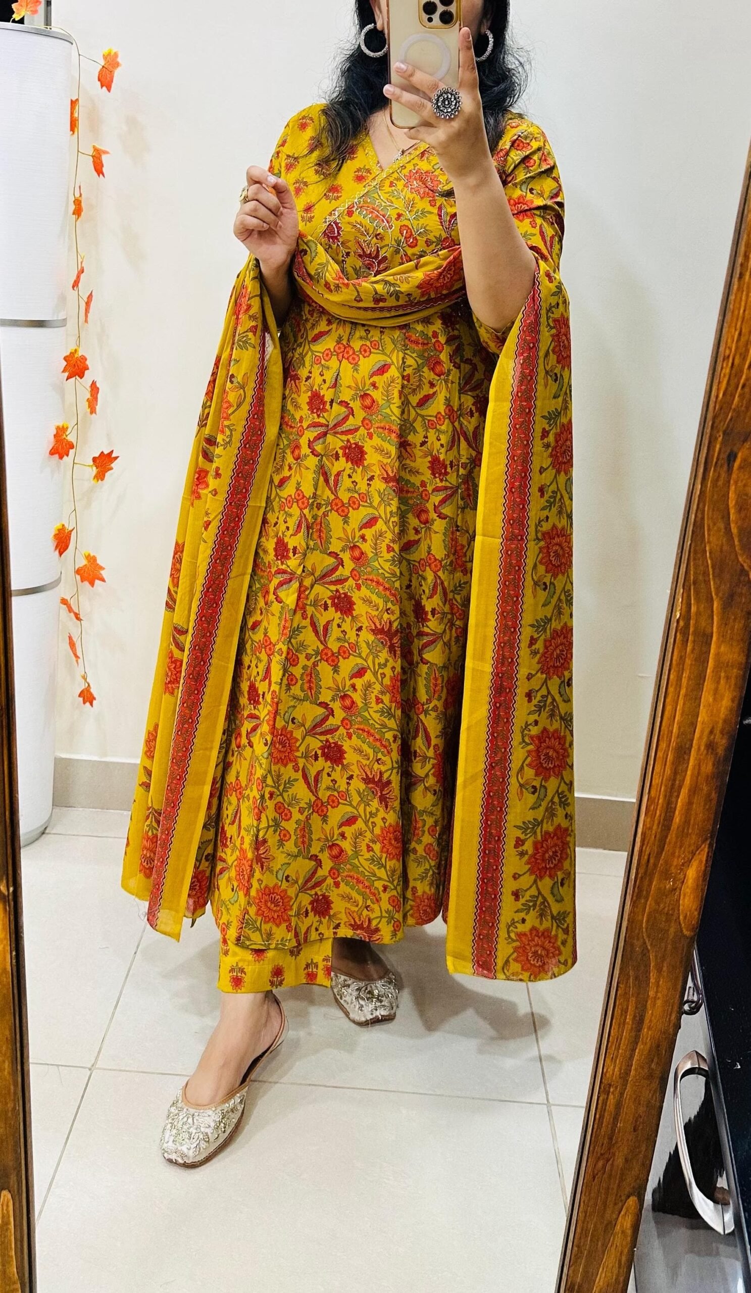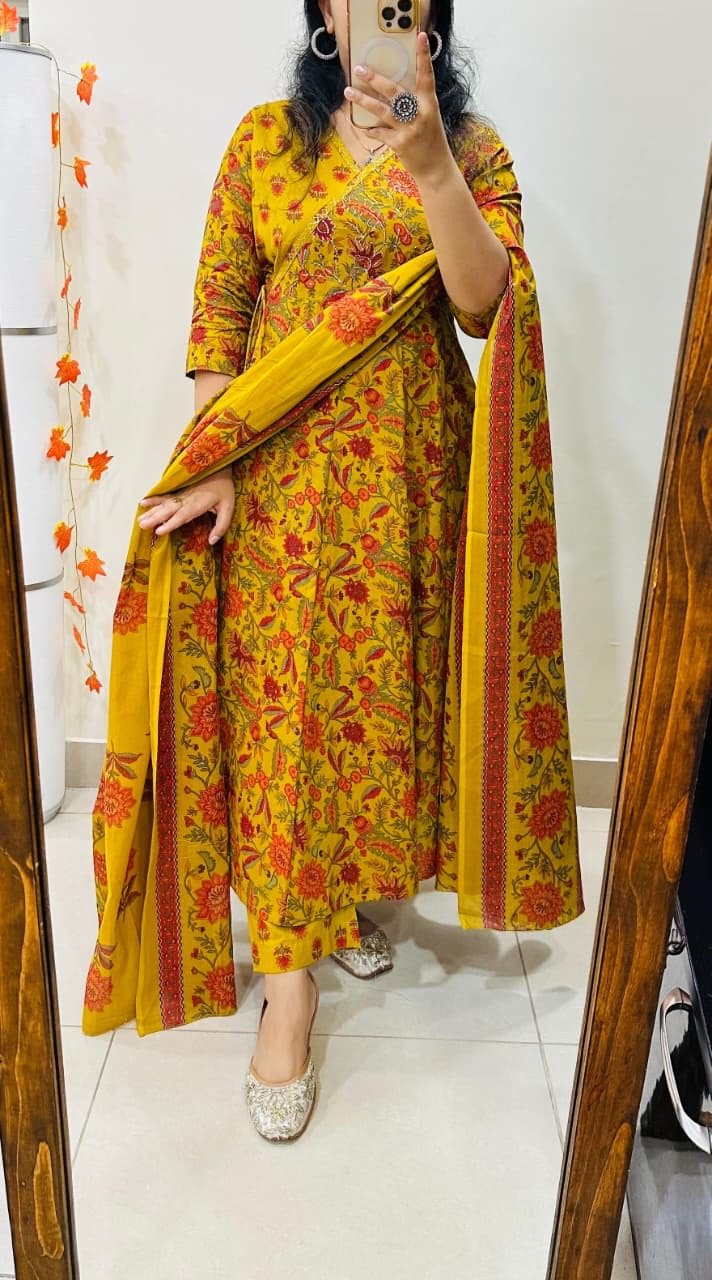 Designer Mughal Theme in Idaho style Floral Kali Kurti Pant dupatta set in Premium fine Cotton Fabric with badla adda work on yoke and side fashion tassels giving gorgeous look… 💥💥