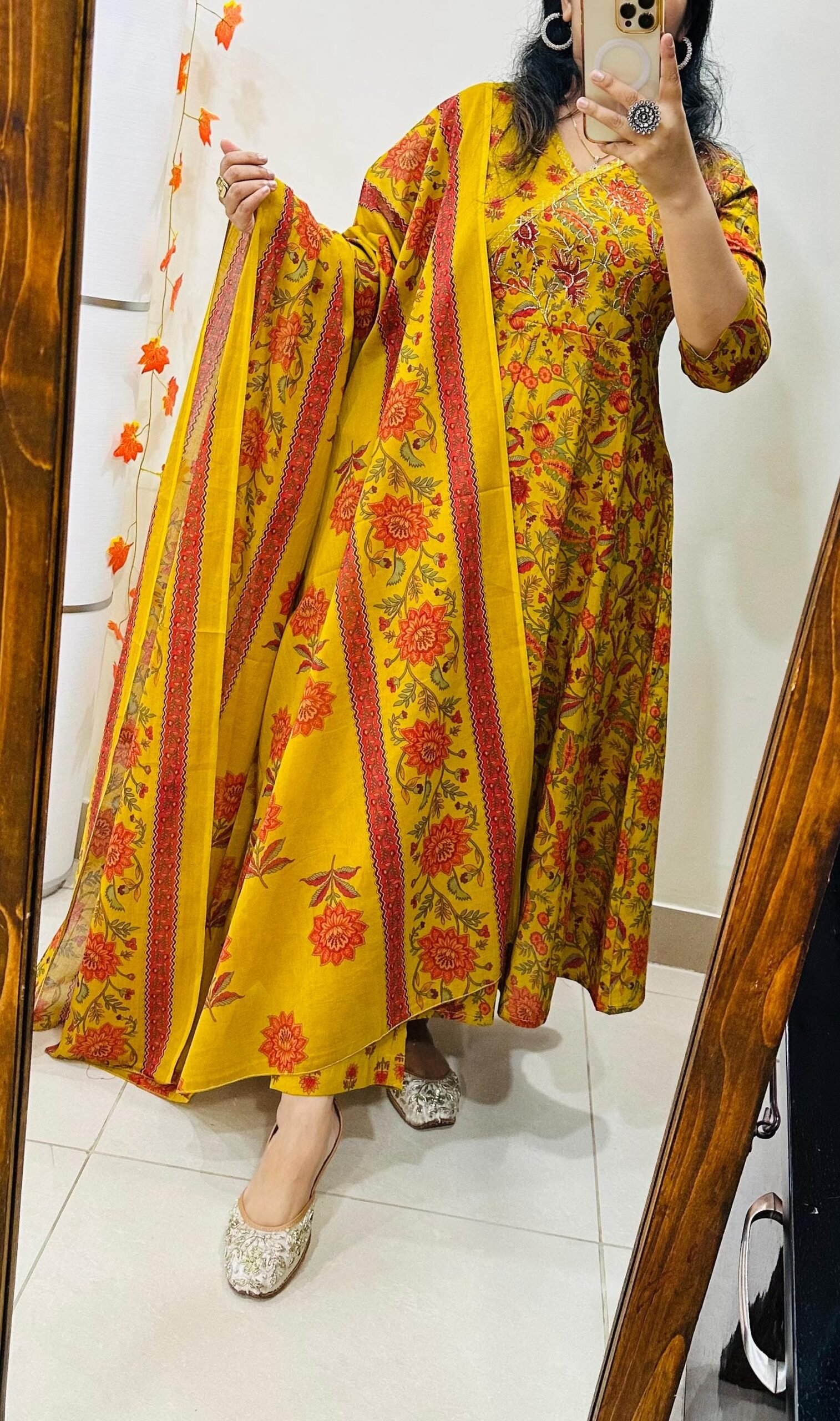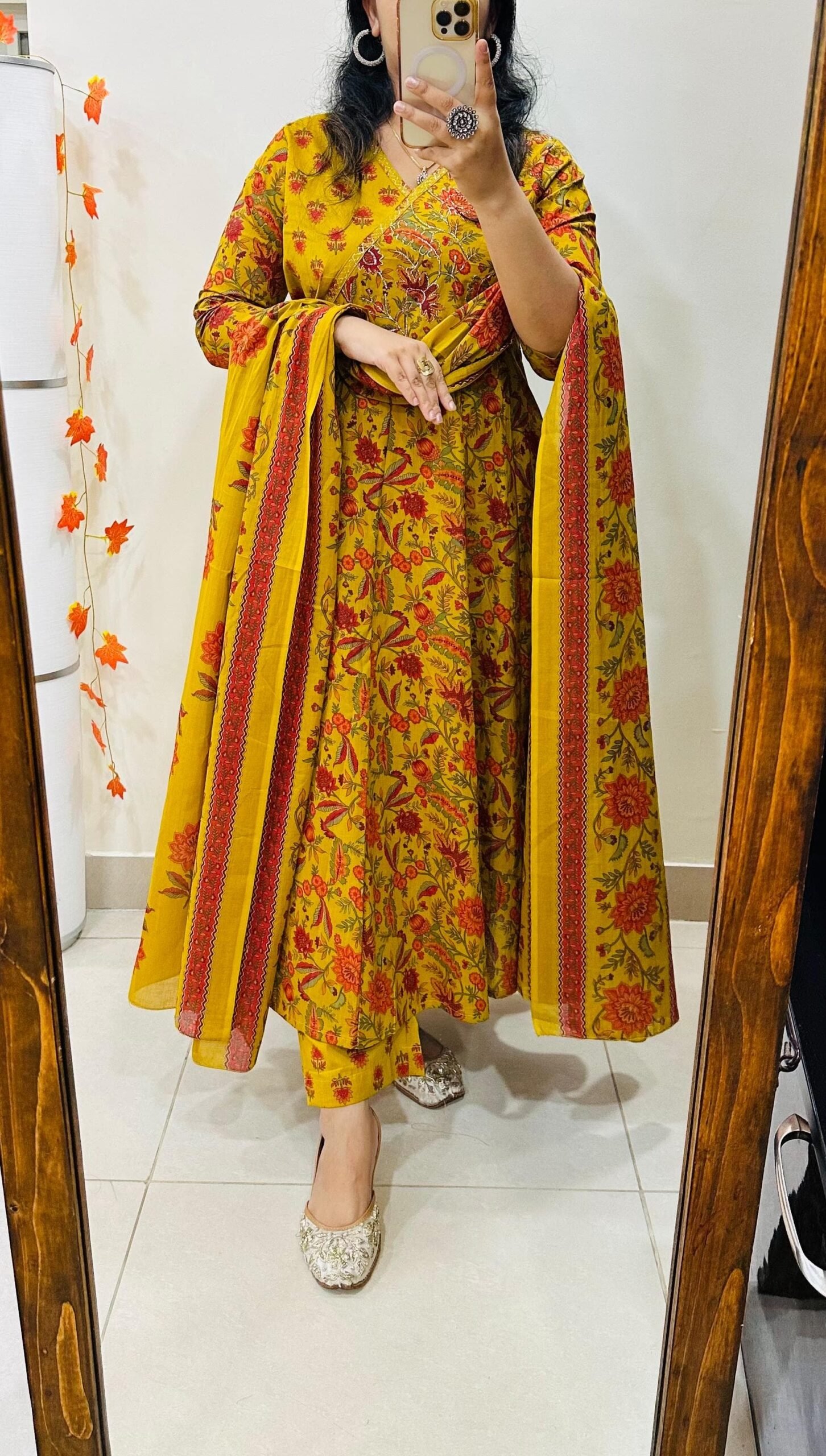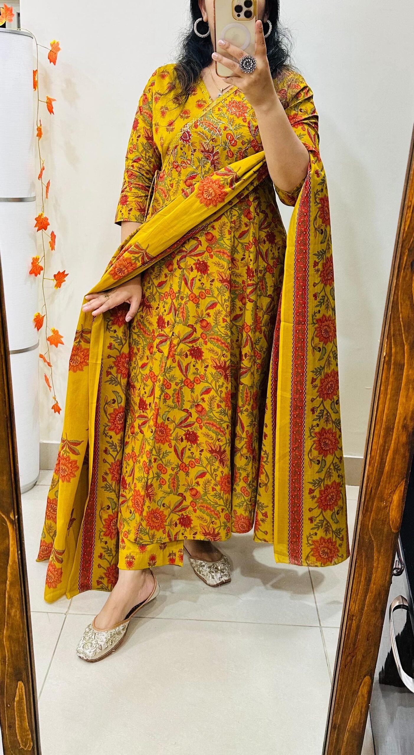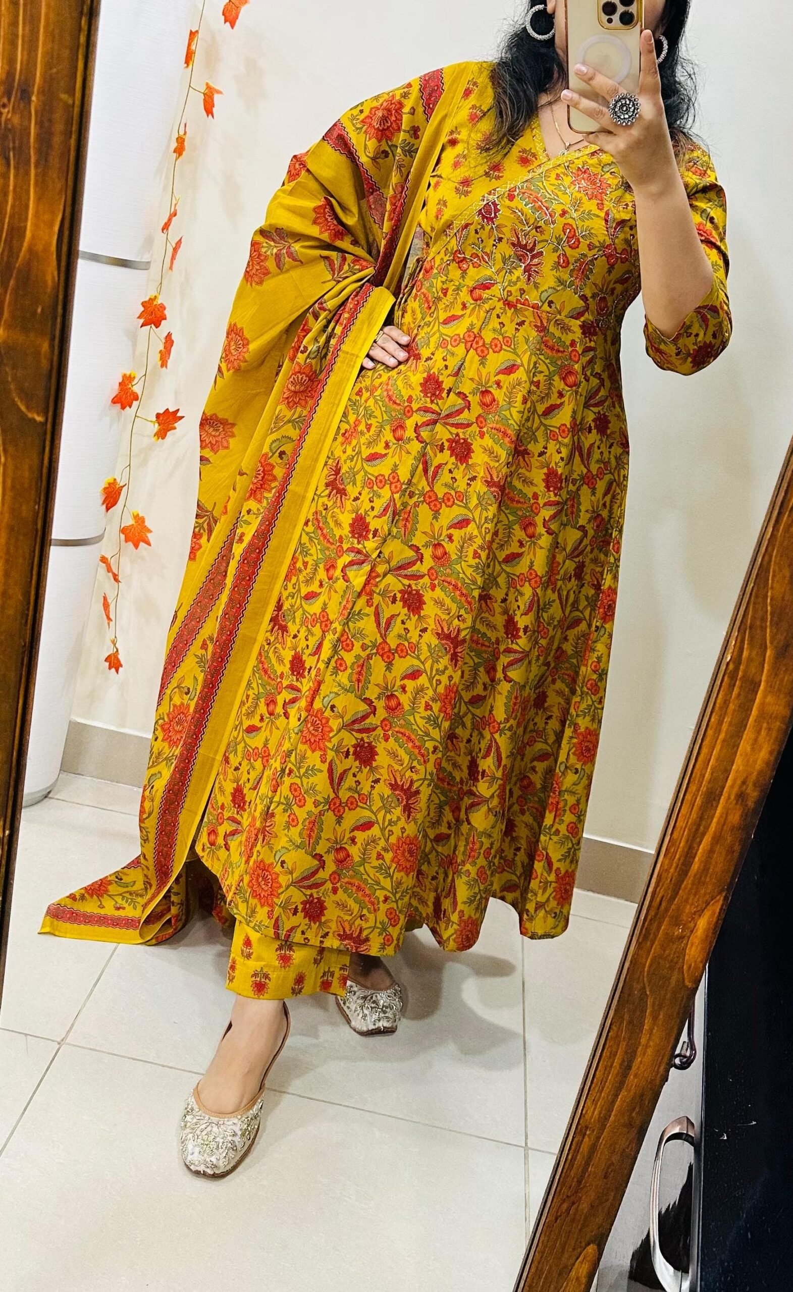 Designer Mughal Theme in Idaho style Floral Kali Kurti Pant dupatta set in Premium fine Cotton Fabric with badla adda work on yoke and side fashion tassels giving gorgeous look… 💥💥