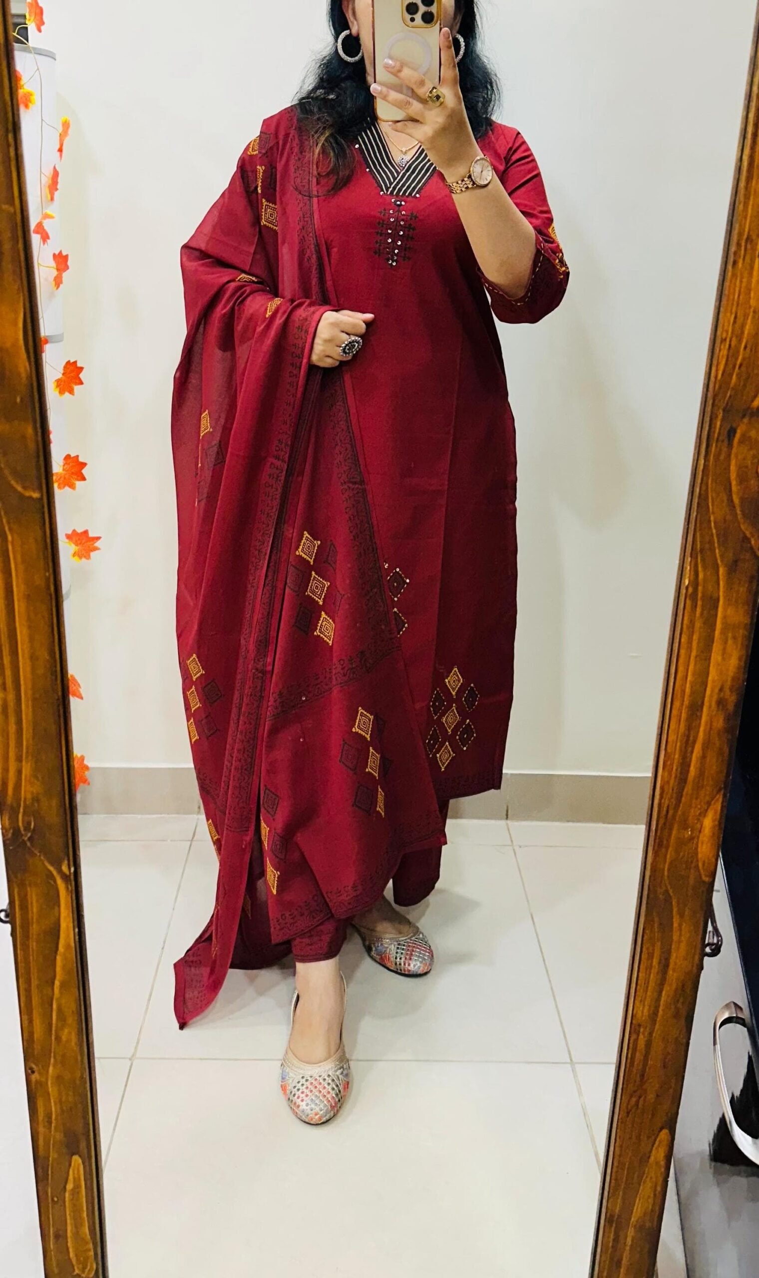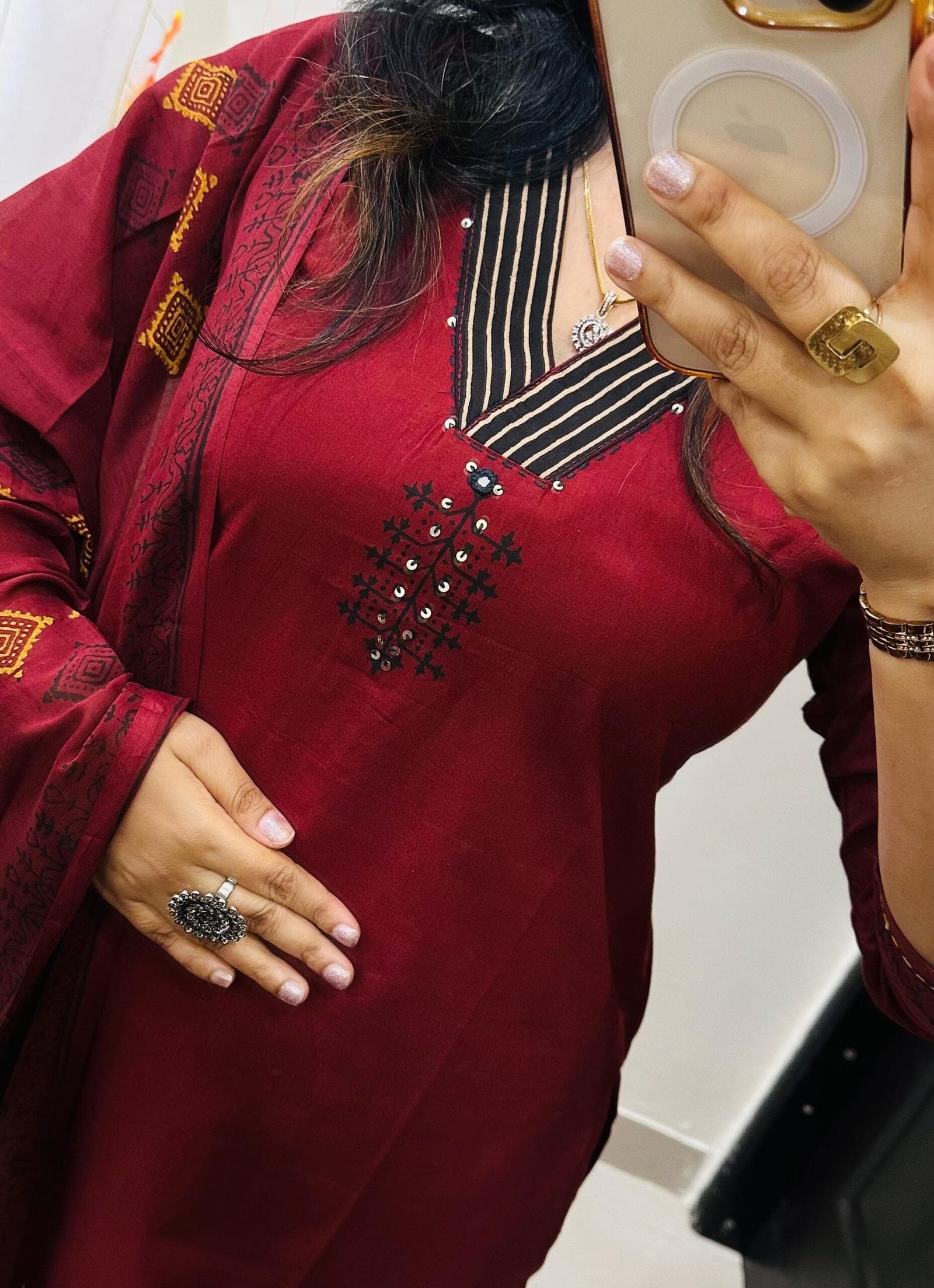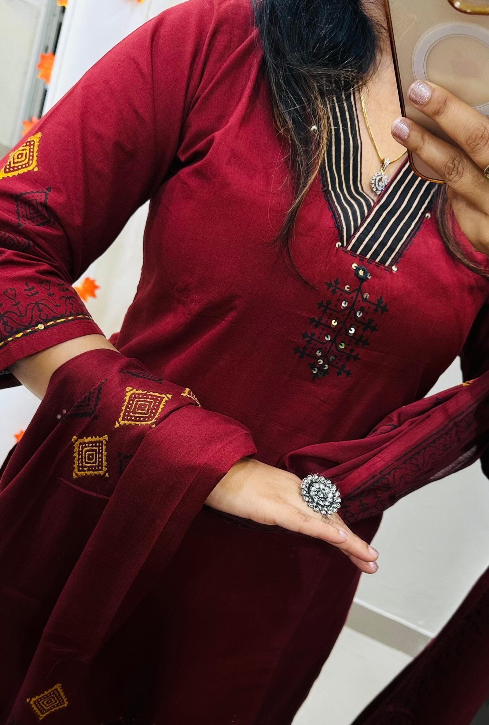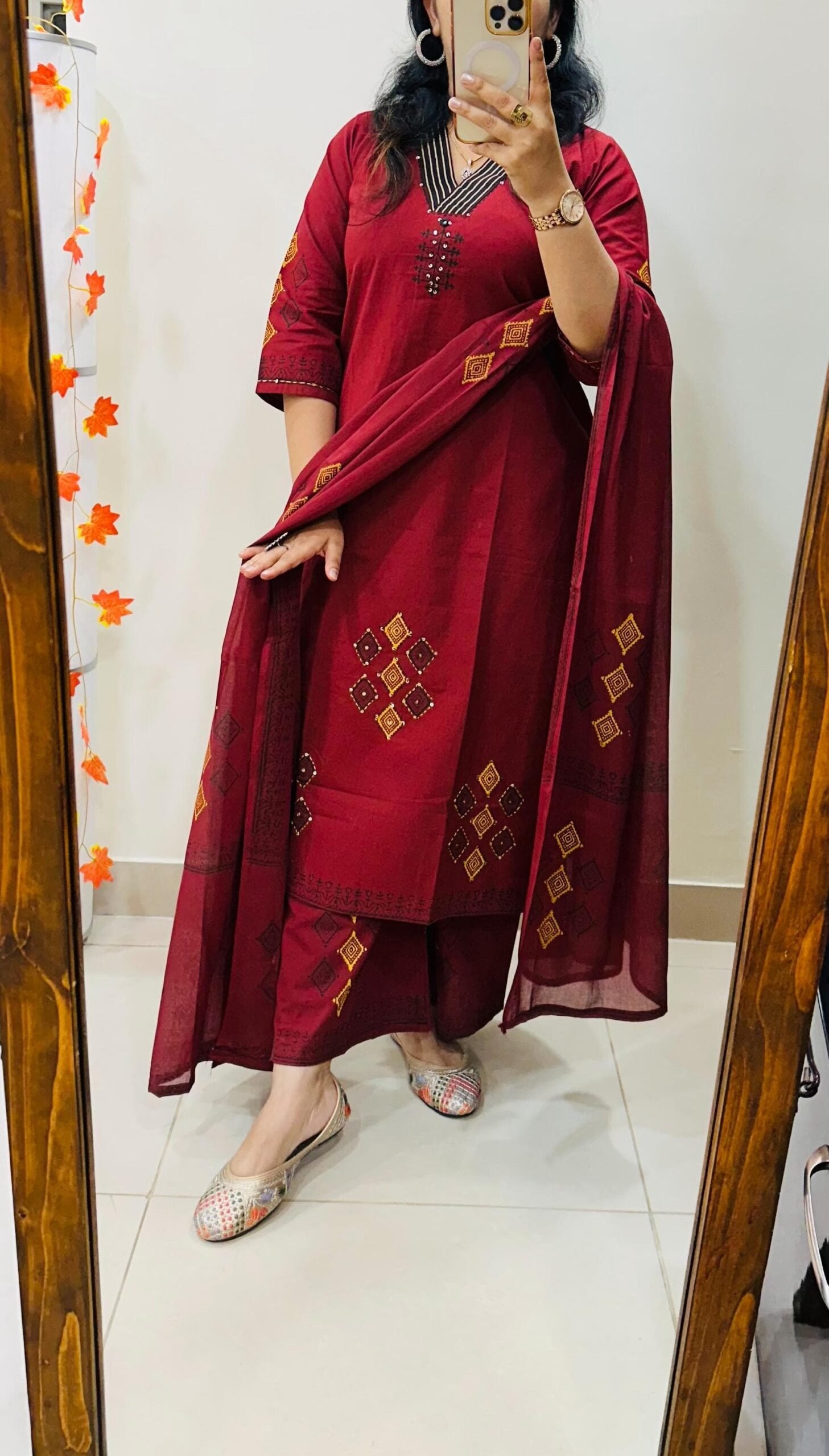 Beautiful Straight kurti palazzo dupatta set in Premium Rich Dhabu Cotton with block prints design and Original Mirror and sequin Work in yoke paired with block print Cotton dupatta