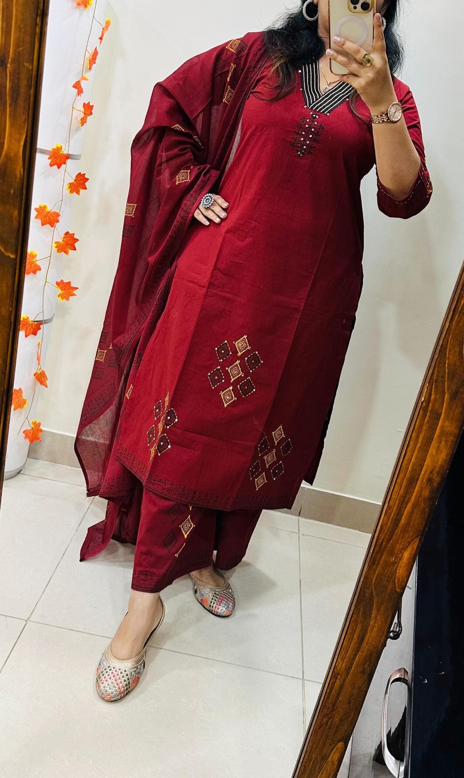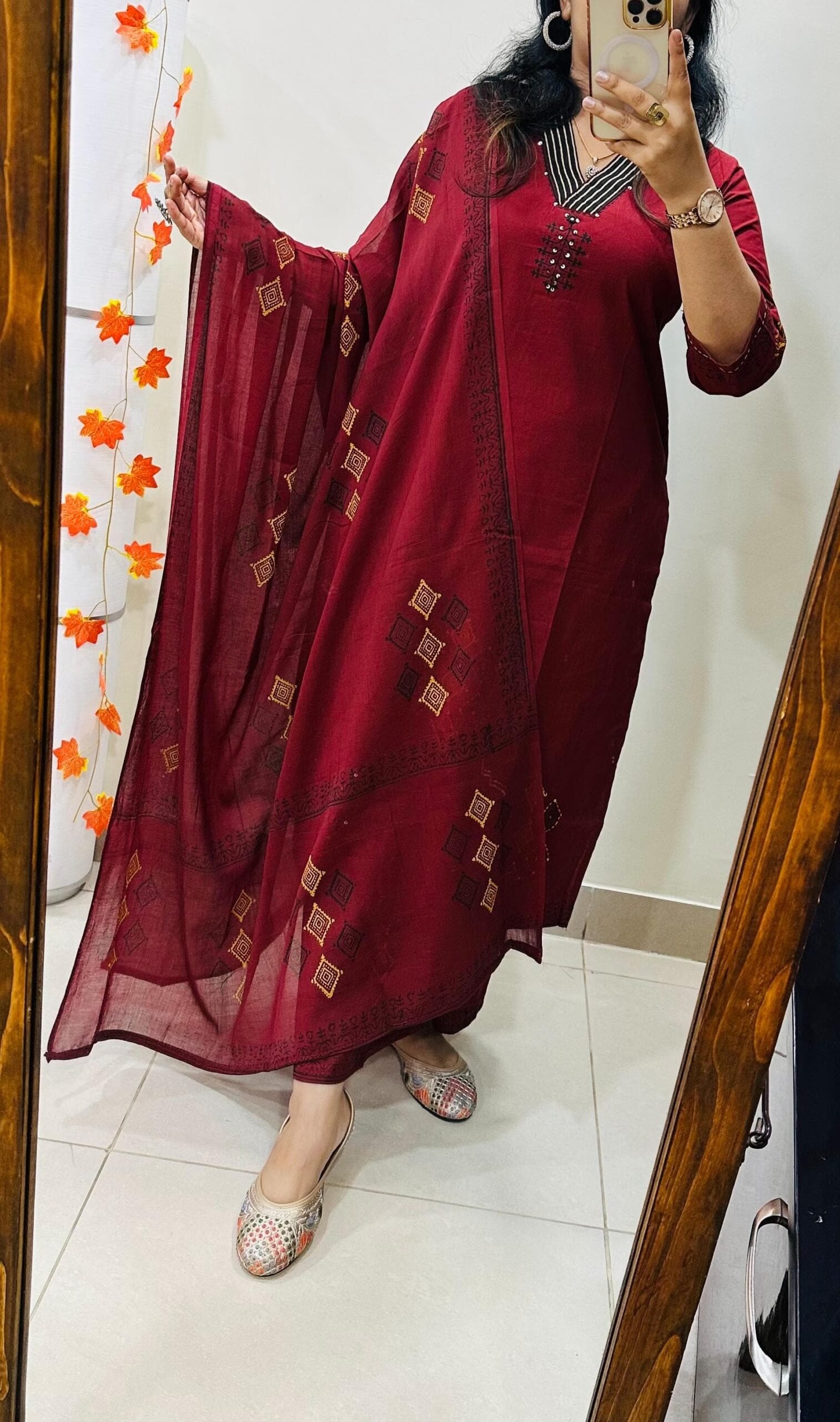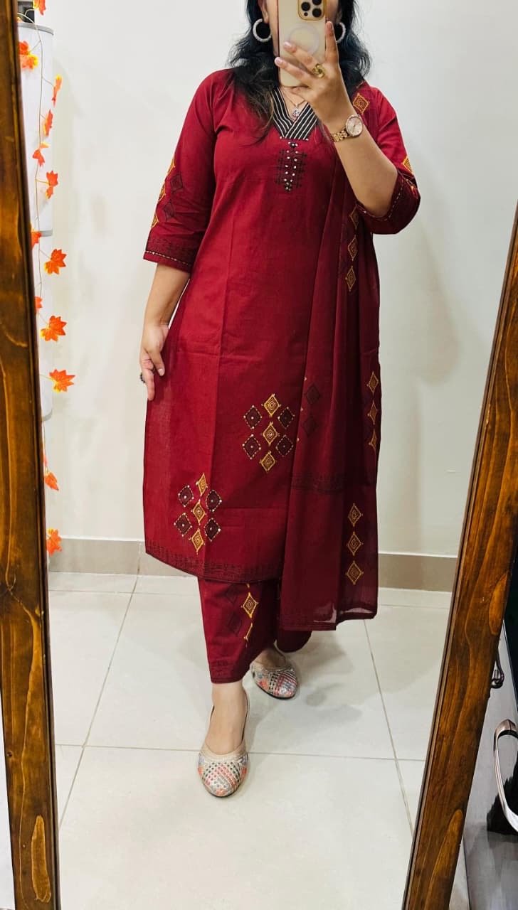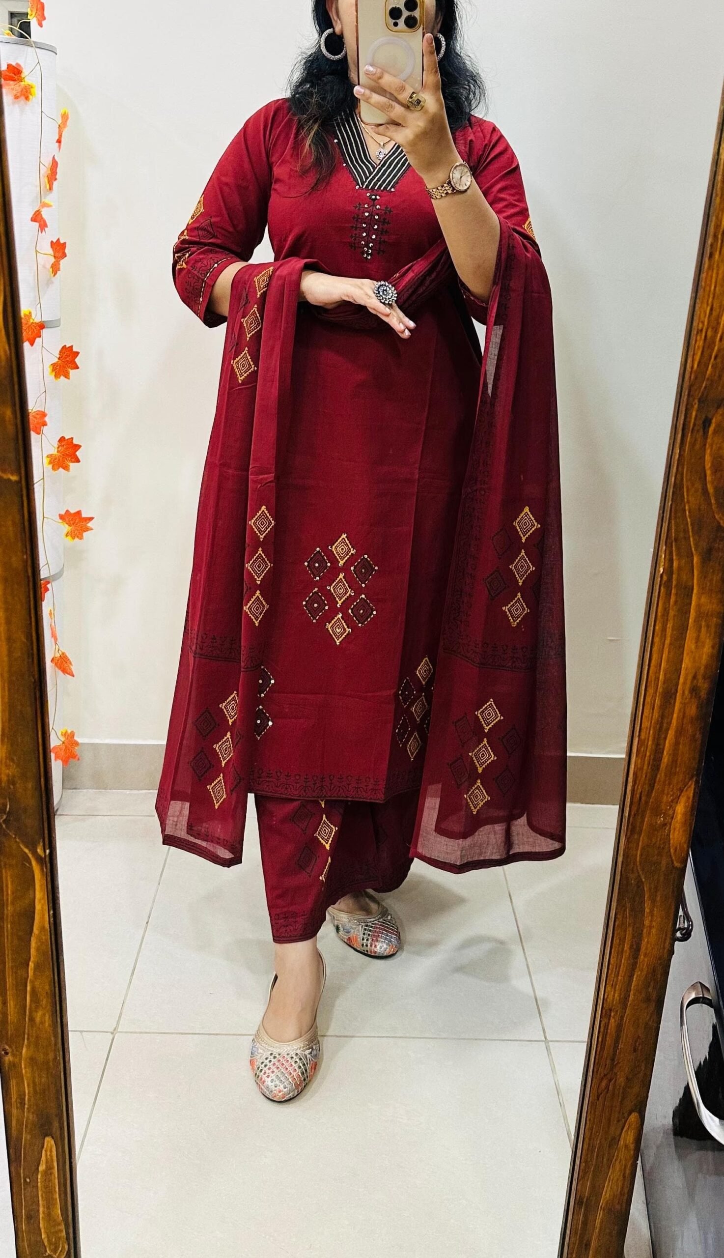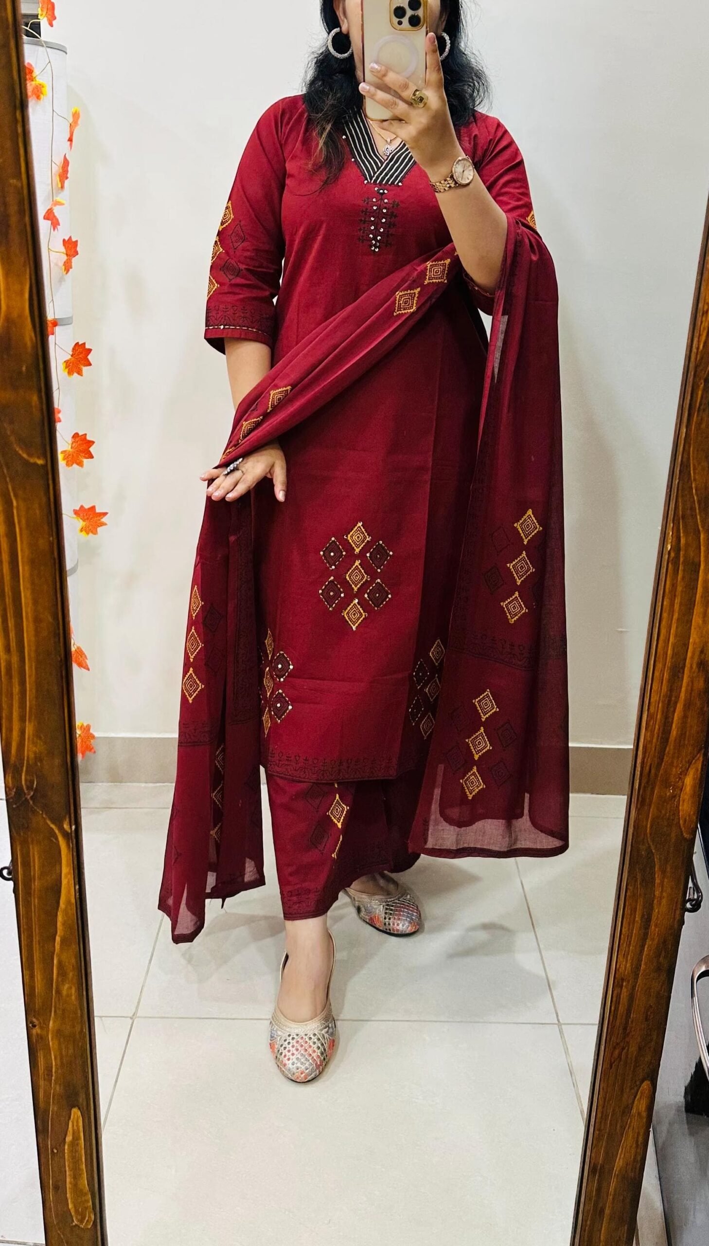 Beautiful Straight kurti palazzo dupatta set in Premium Rich Dhabu Cotton with block prints design and Original Mirror and sequin Work in yoke paired with block print Cotton dupatta