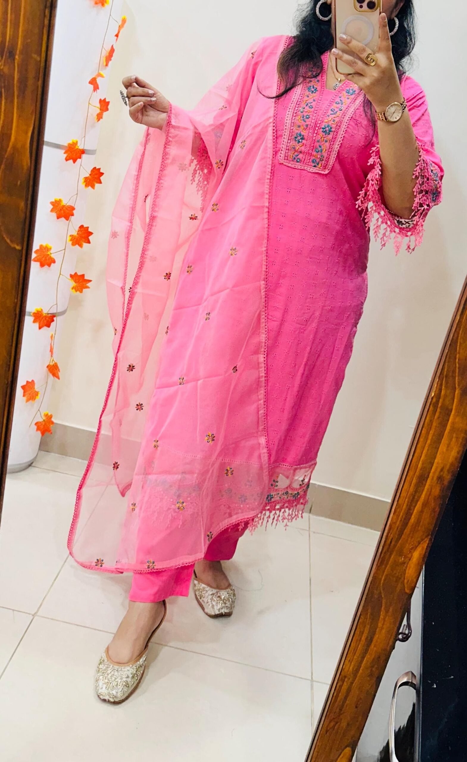 Beautiful Schiffli Kurti Pant dupatta set in Premium fine Cotton Fabric with heavy embroidery work in yoke sleeves and bottom of kurti with designer bell sleeves with organza duppata giving heavy gorgeous look to the outfit..