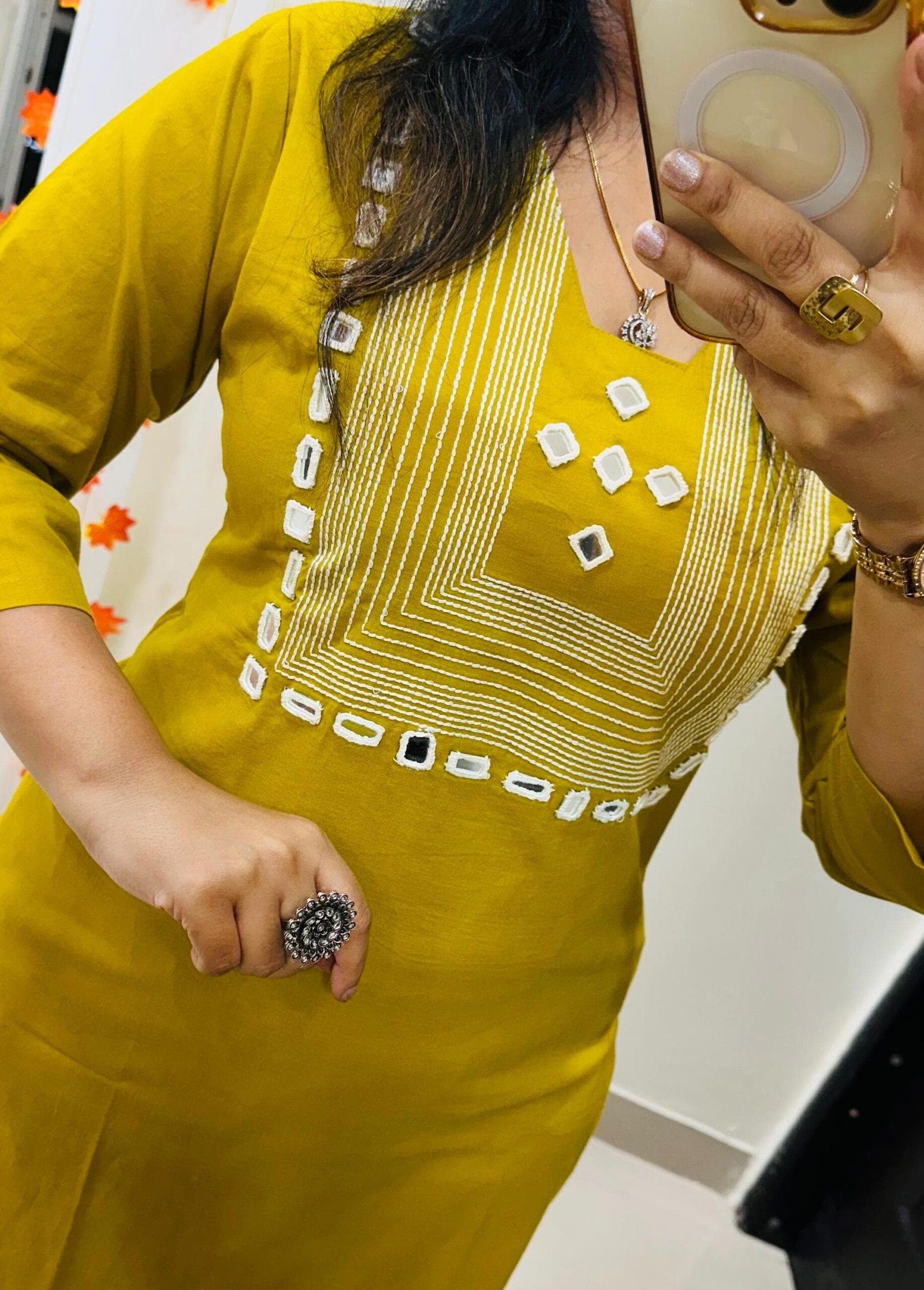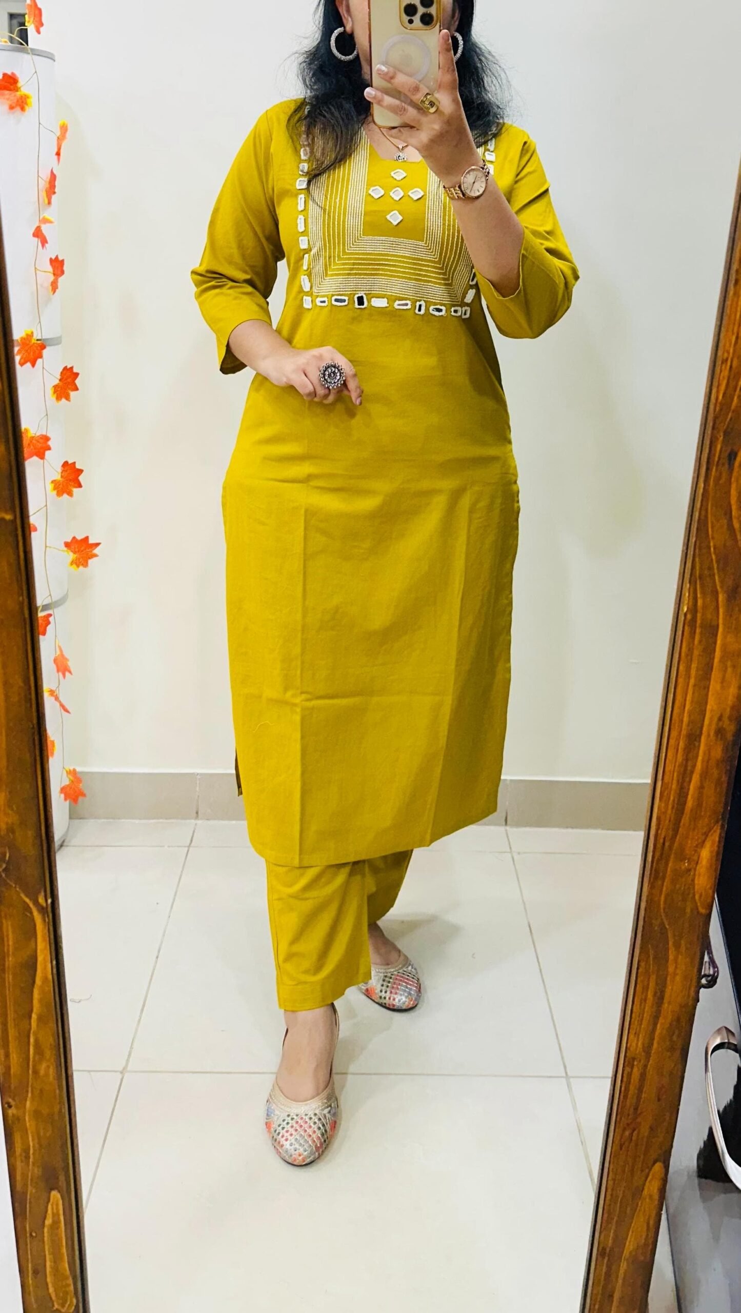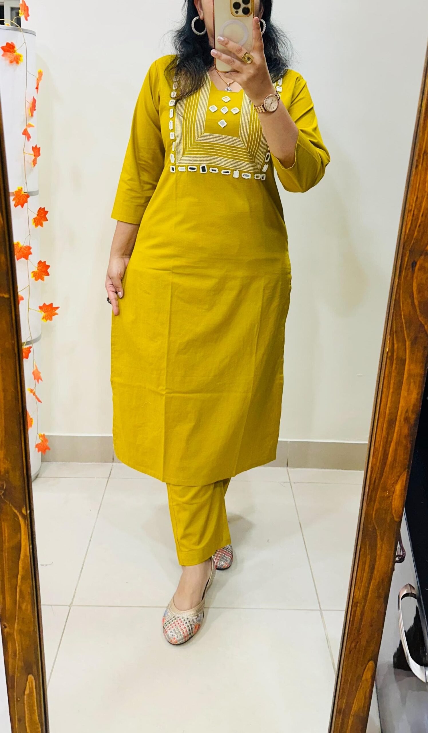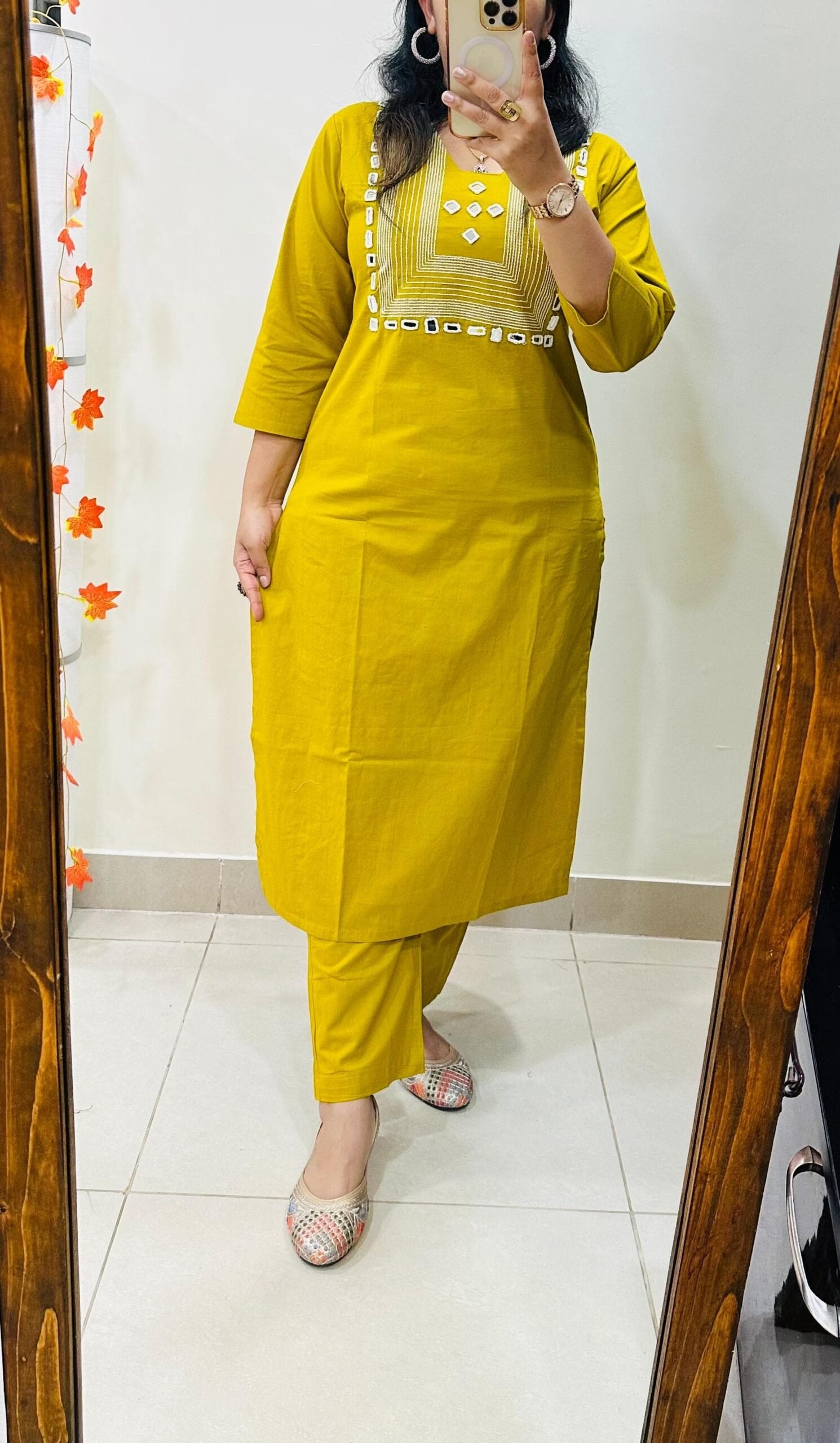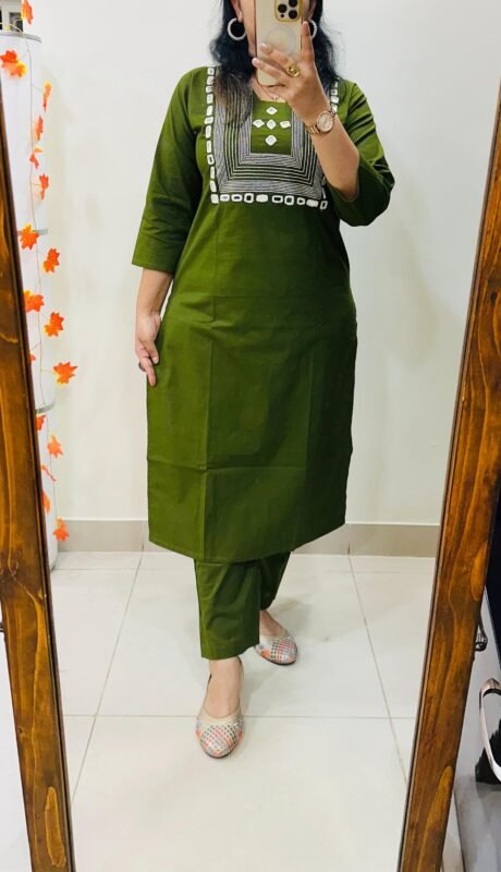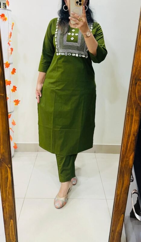 Designer Top Bottom set in straight kurti pattern paired with pant in Dhabu Cotton with heavy embroidery work and mirror detailing in yoke…..✨✨✨