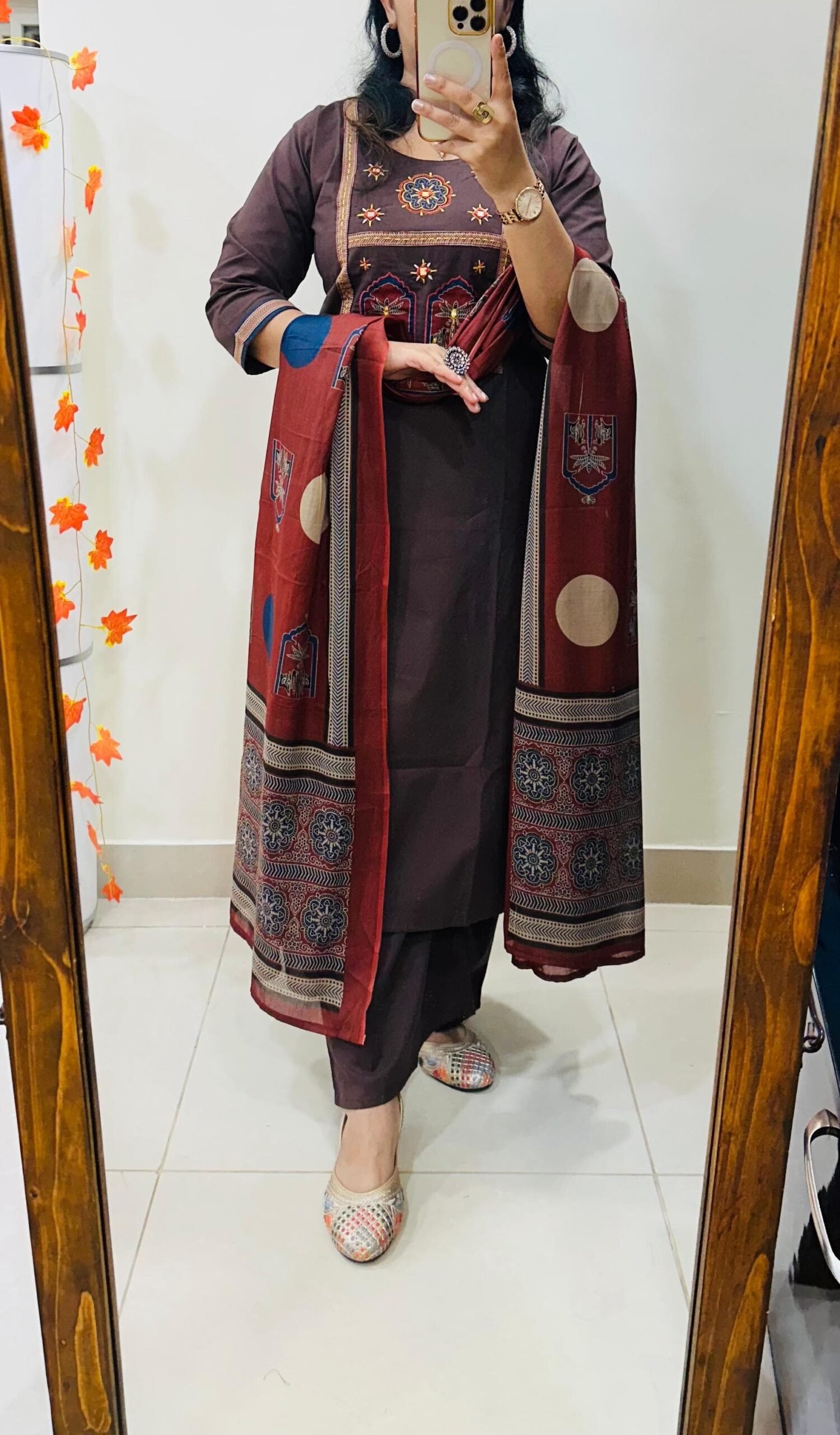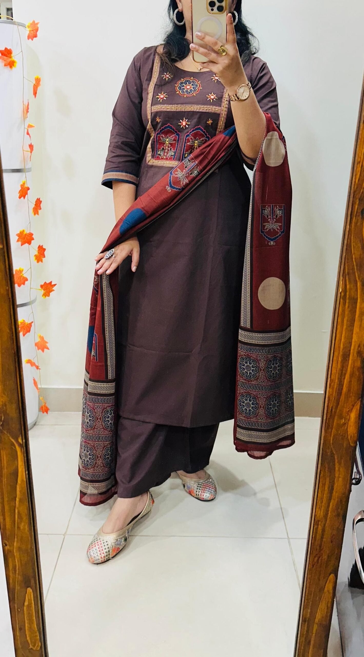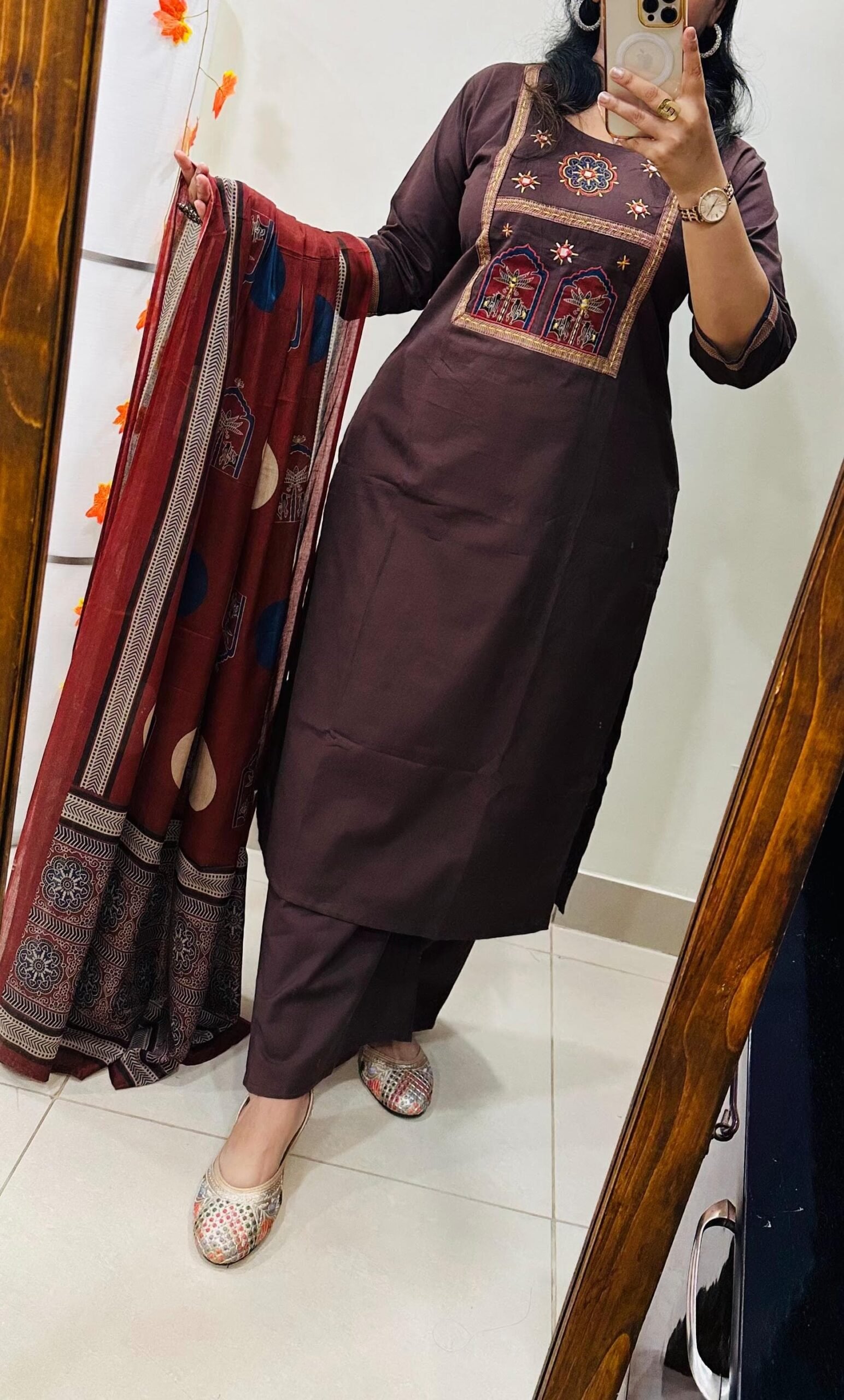 Beautiful Straight kurti pant dupatta set in Premium Rich Dhabu Cotton with original mirror in yoke with thread detailing paired with mulmul cotton dupatta