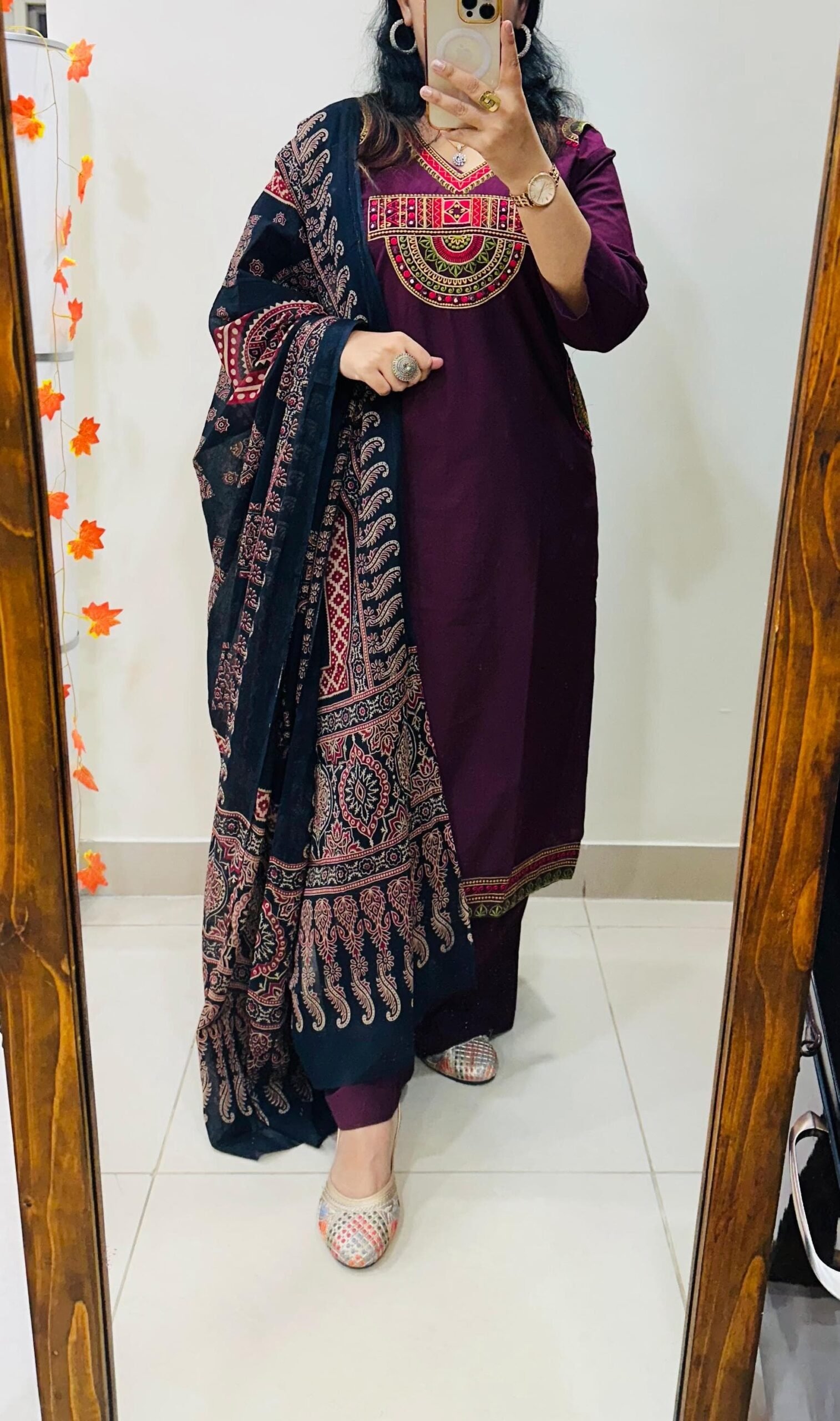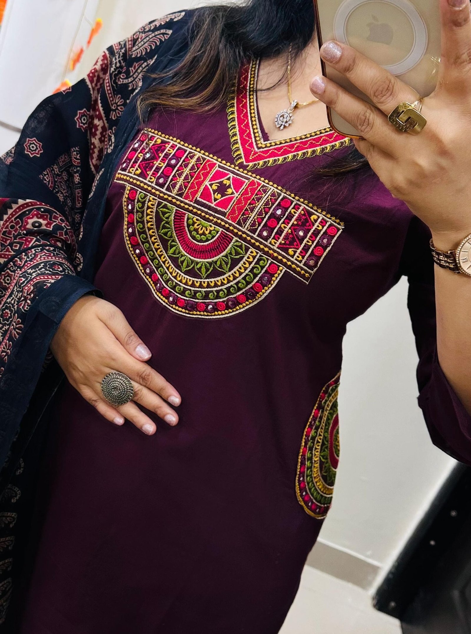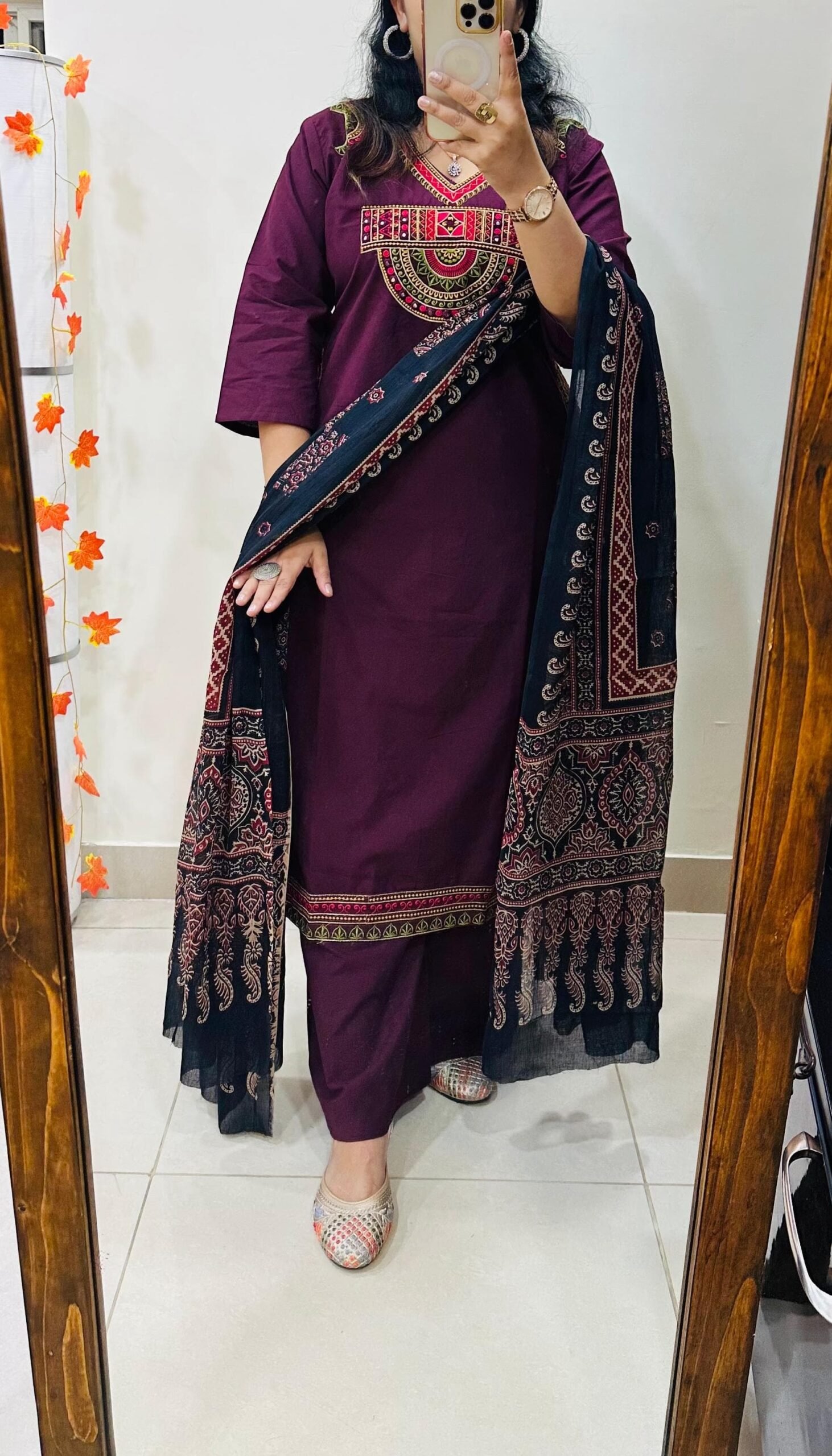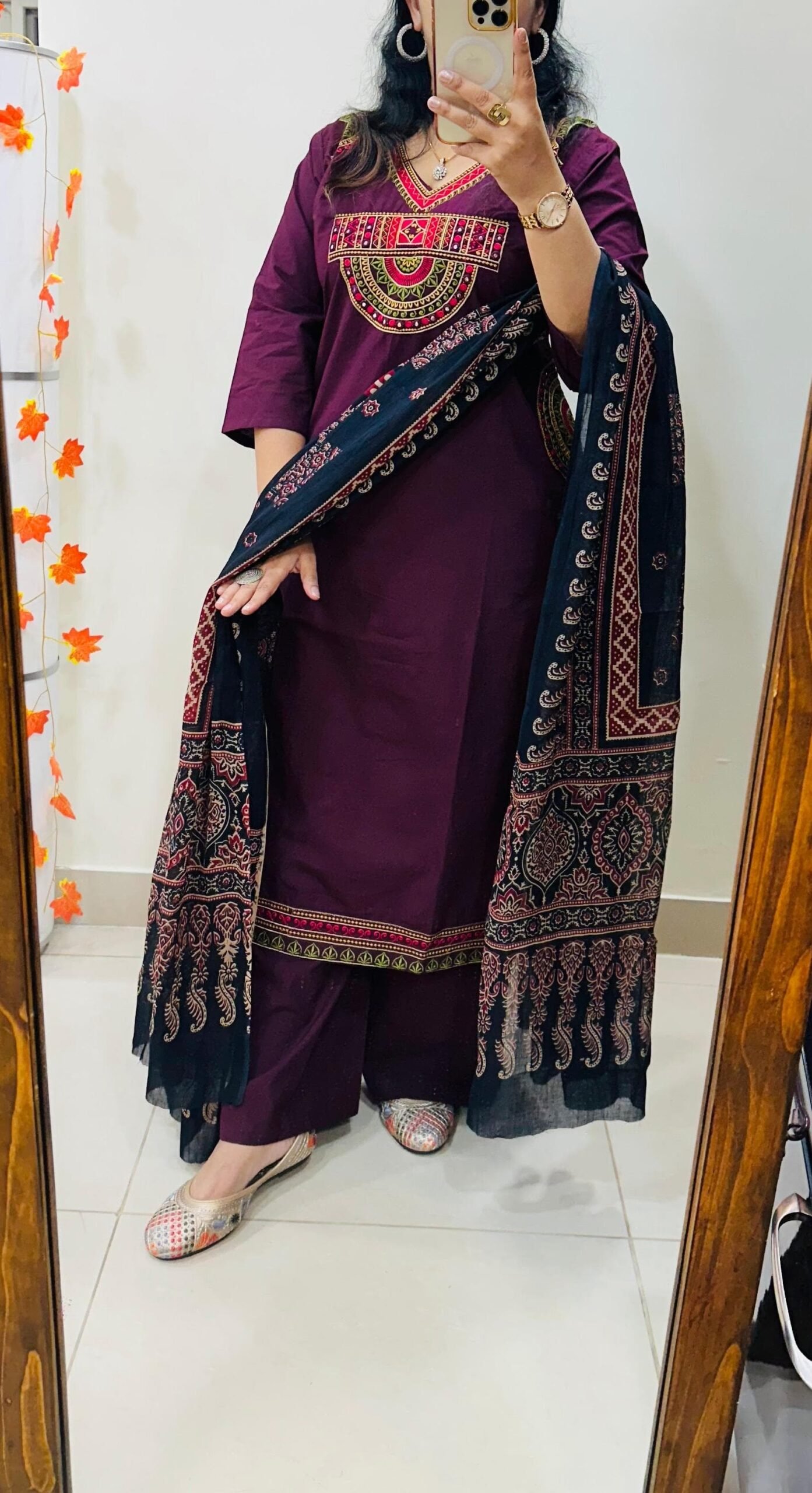 Stylish Ethnic Kurti Palazzo Dupatta Set in Rich Dhabu cotton fabric with Beautiful kutch embroidery in neckline and yoke and original mirror work on yoke paired with fine azrakh cotton dupatta… 🎉🎉