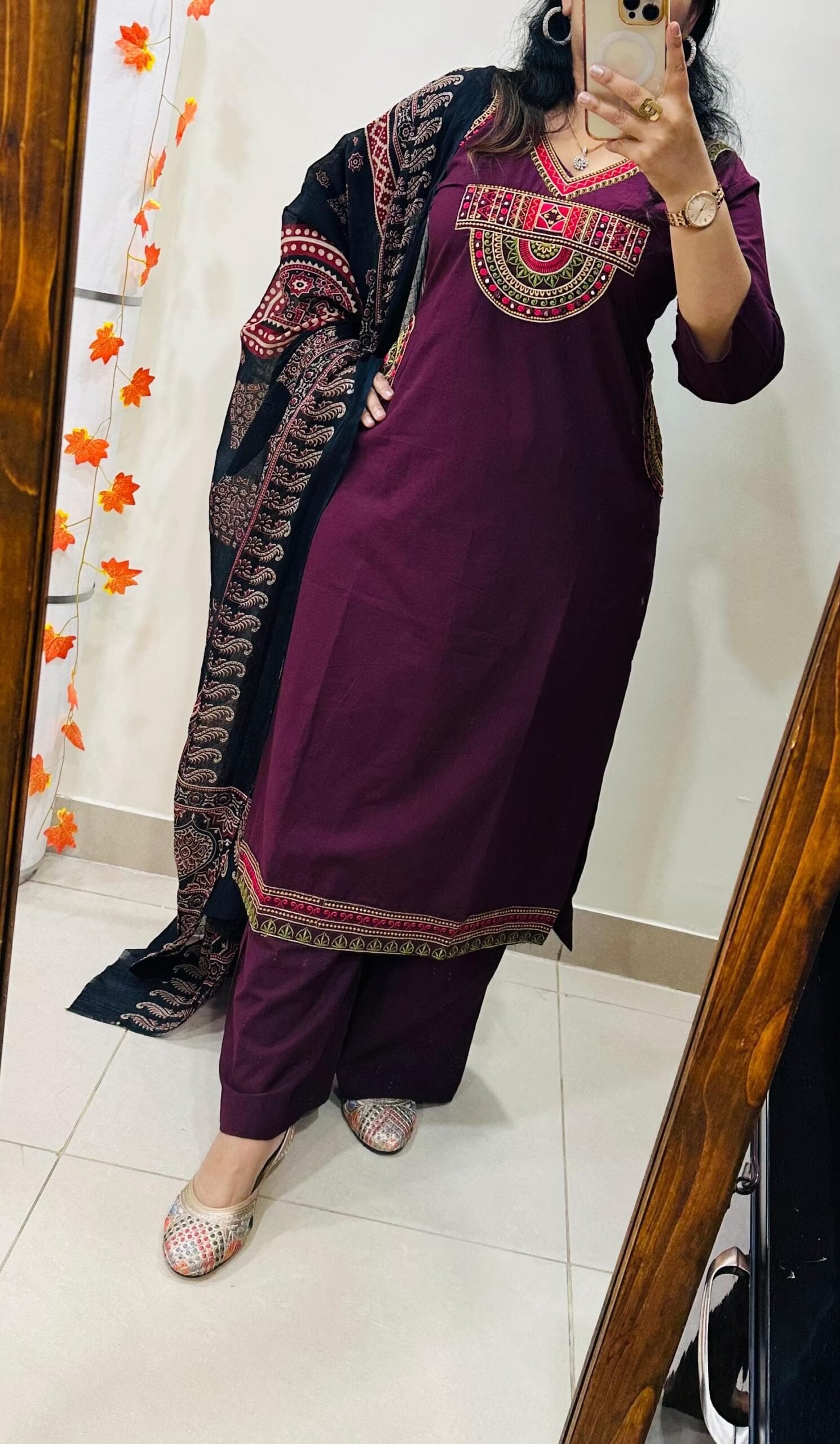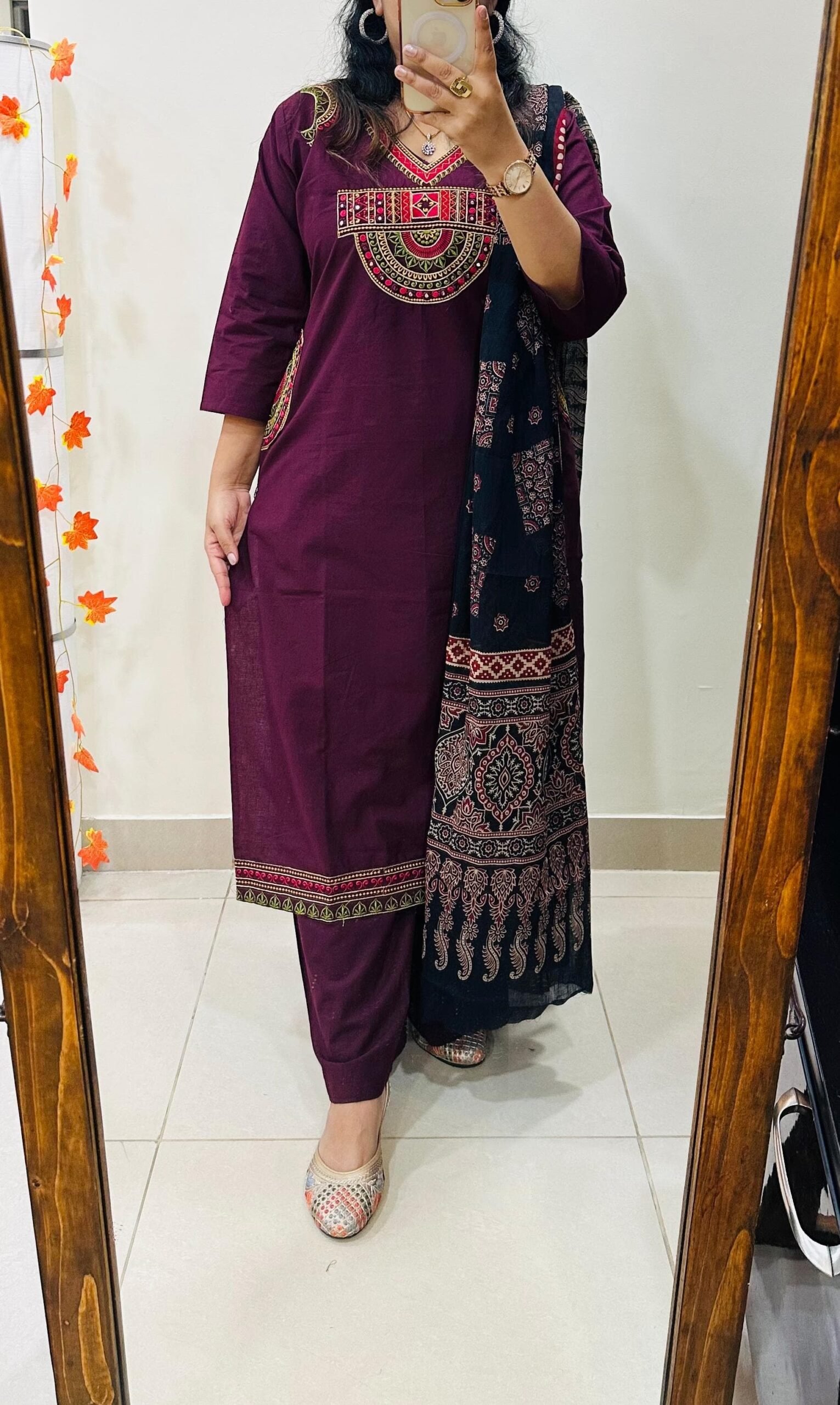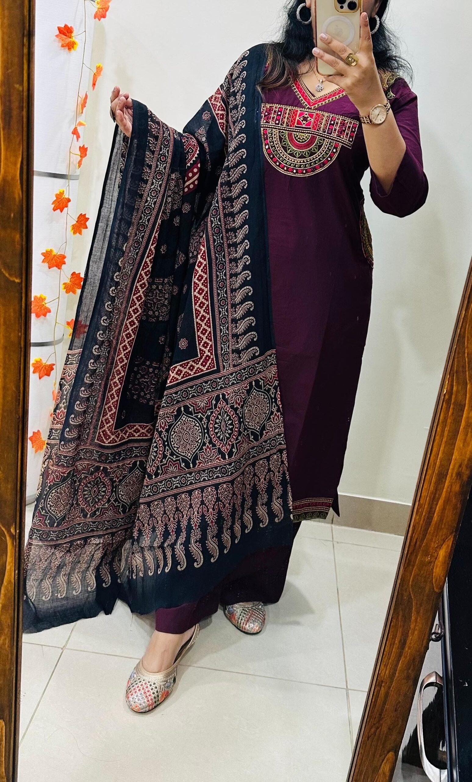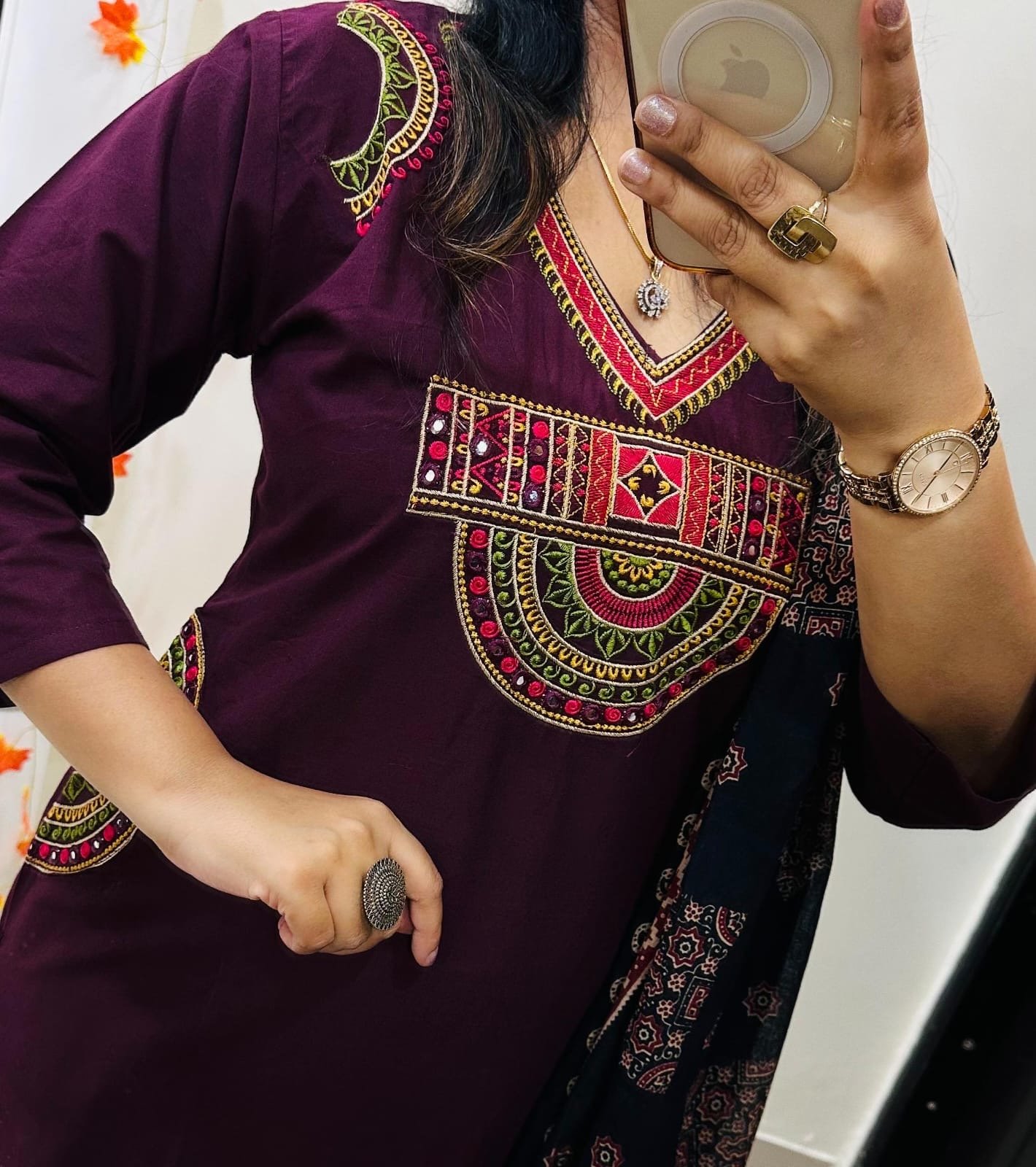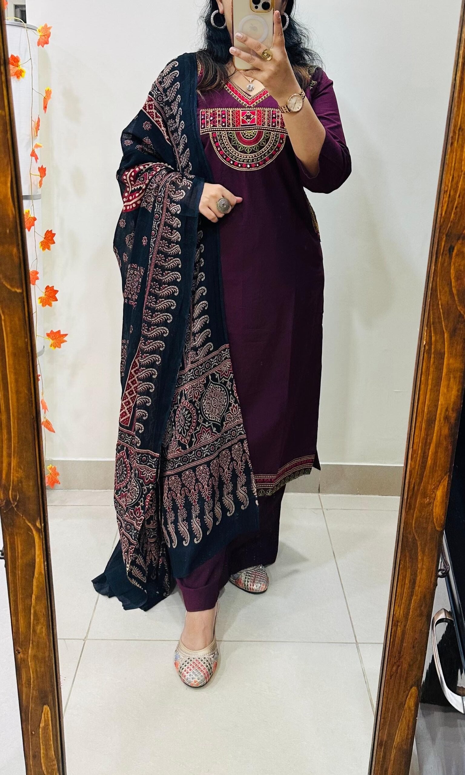 Stylish Ethnic Kurti Palazzo Dupatta Set in Rich Dhabu cotton fabric with Beautiful kutch embroidery in neckline and yoke and original mirror work on yoke paired with fine azrakh cotton dupatta… 🎉🎉