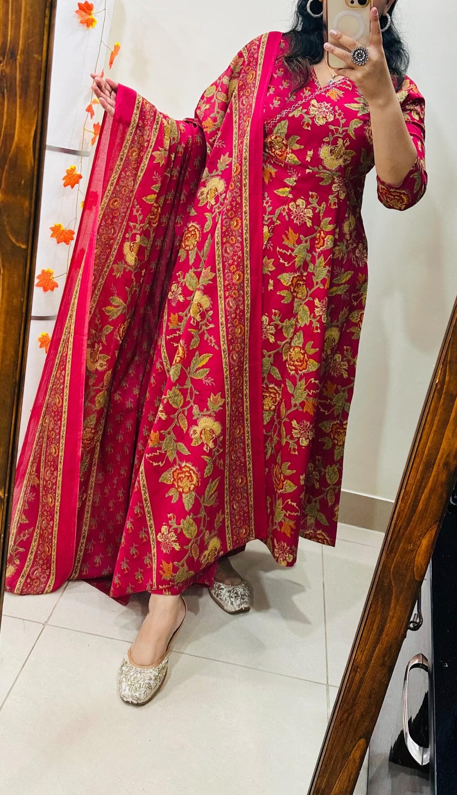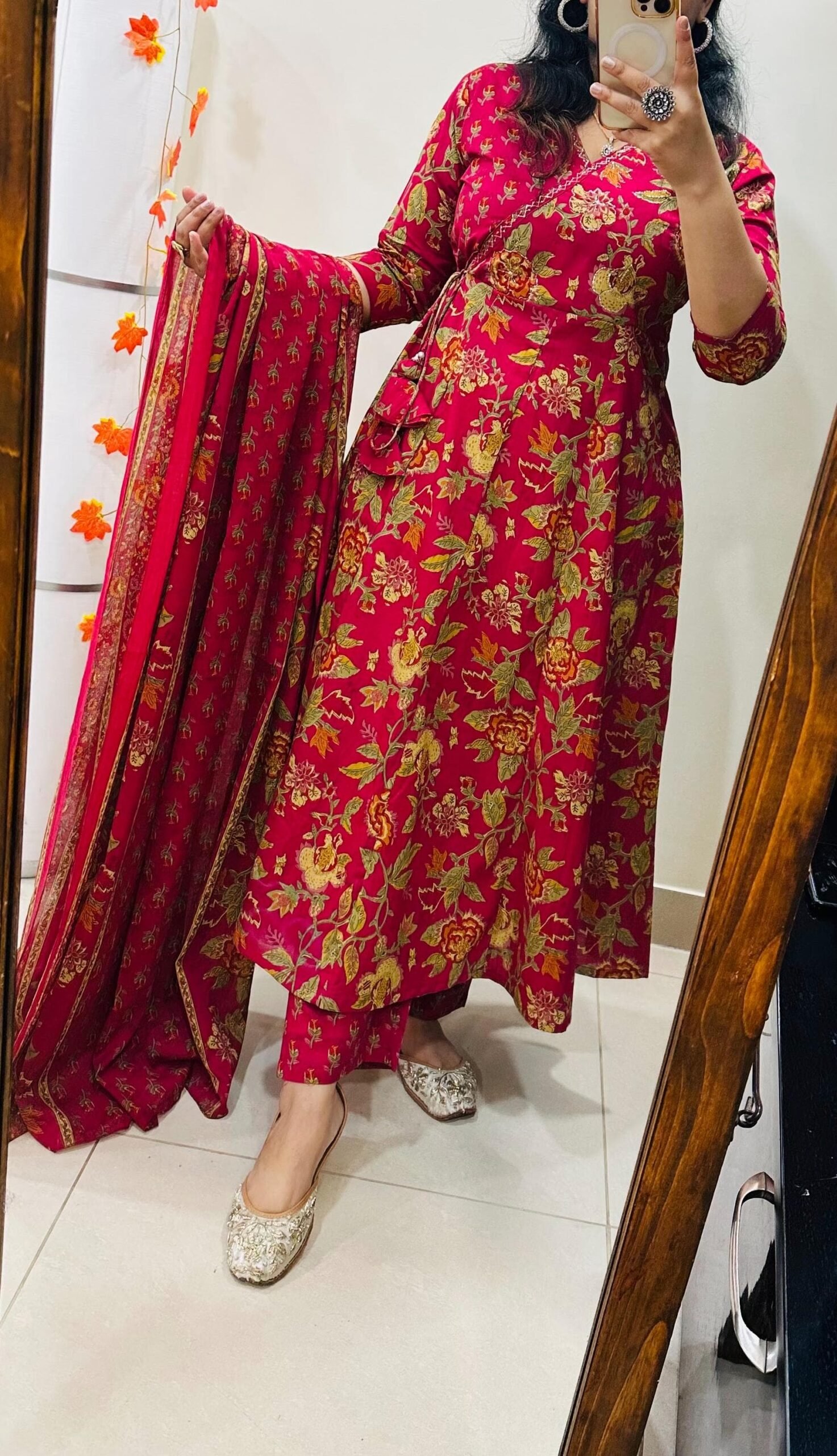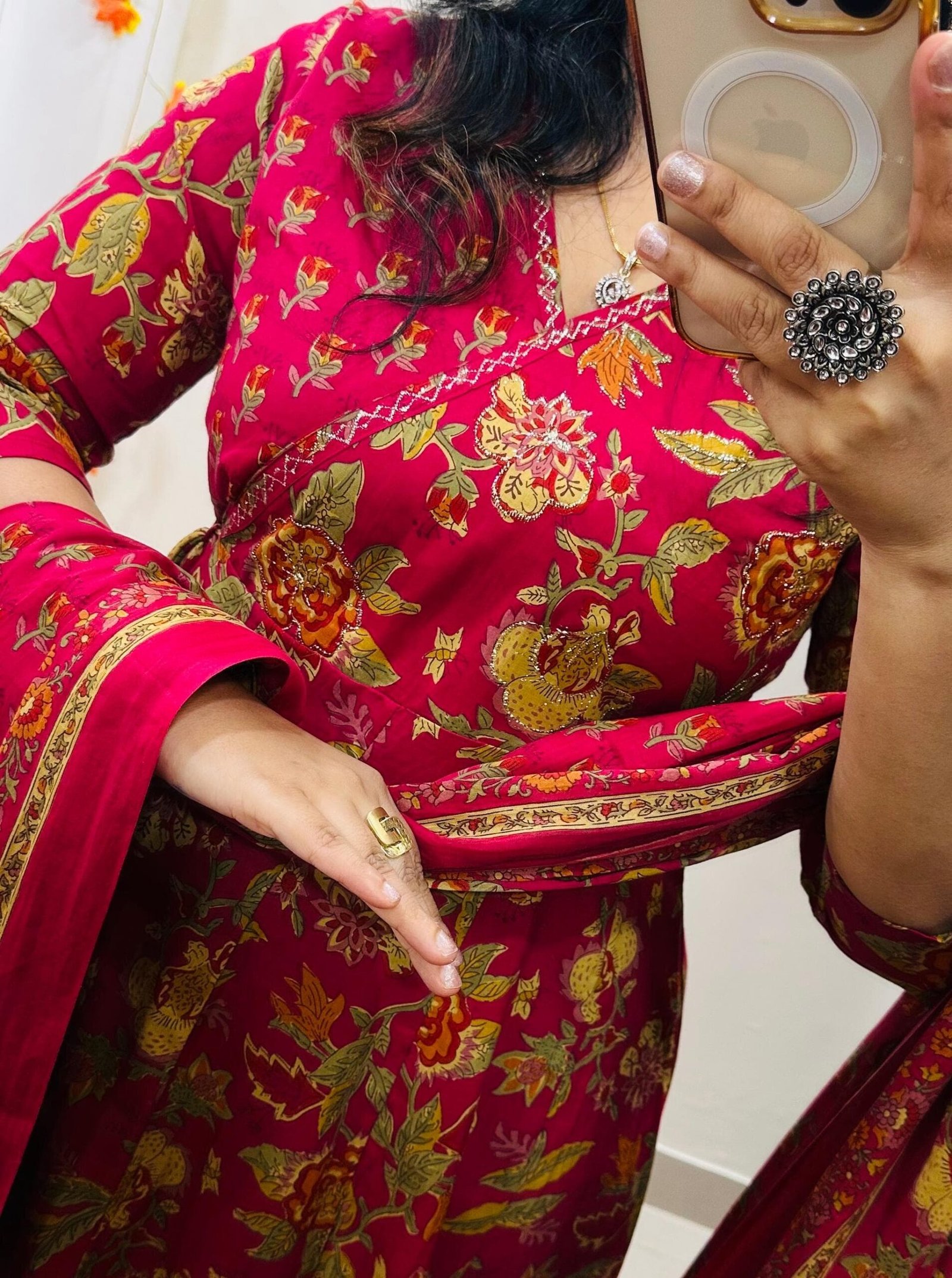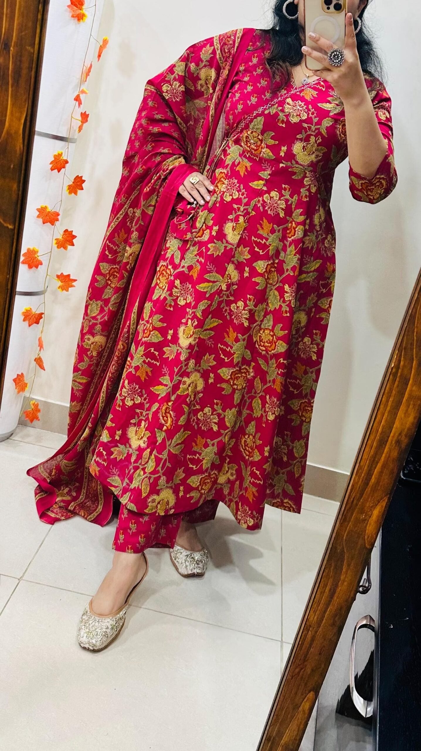 Designer Mughal Theme in Idaho style Floral Kali Kurti Pant dupatta set in Premium fine Cotton Fabric with badla adda work on yoke and side fashion tassels giving