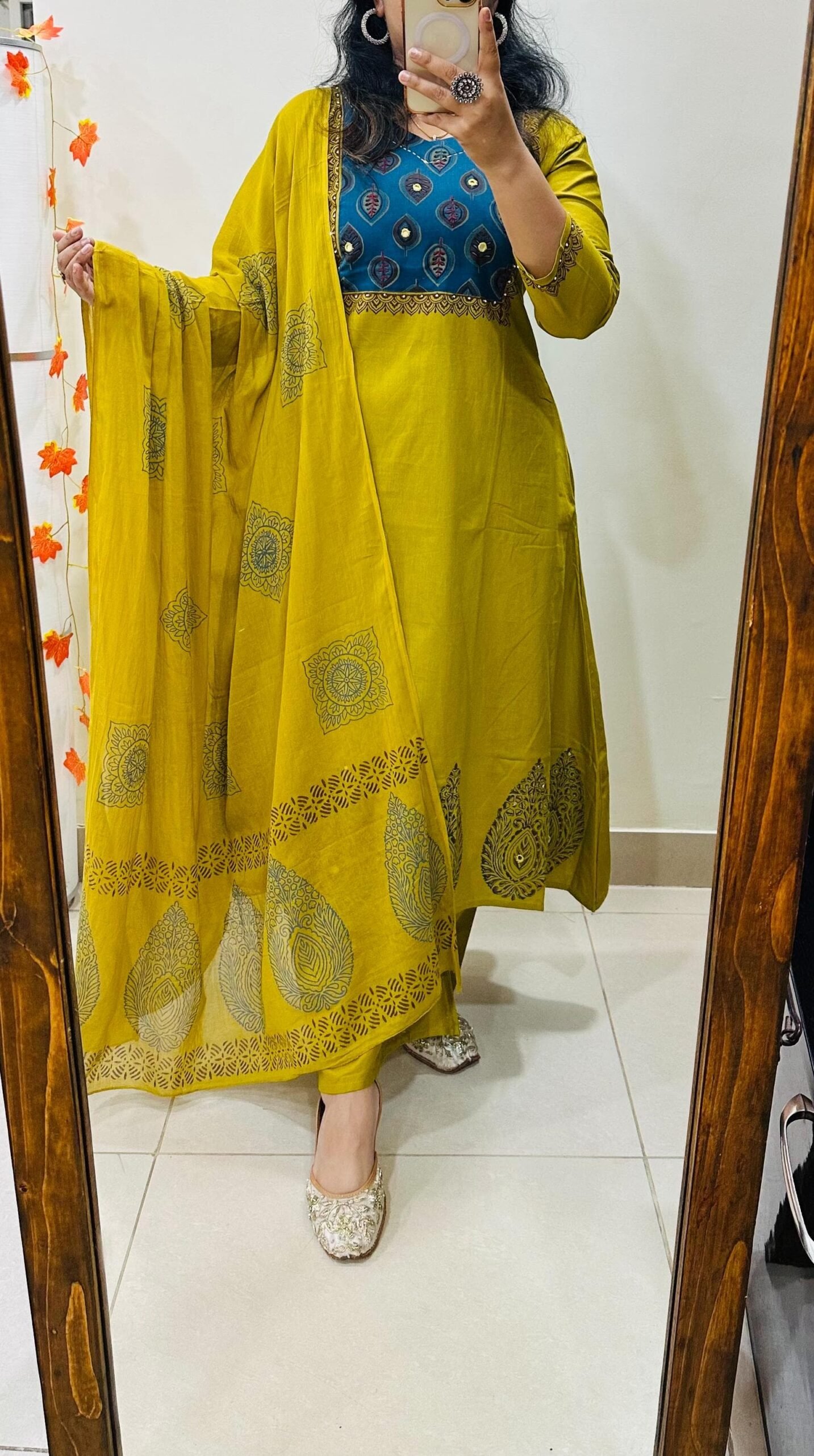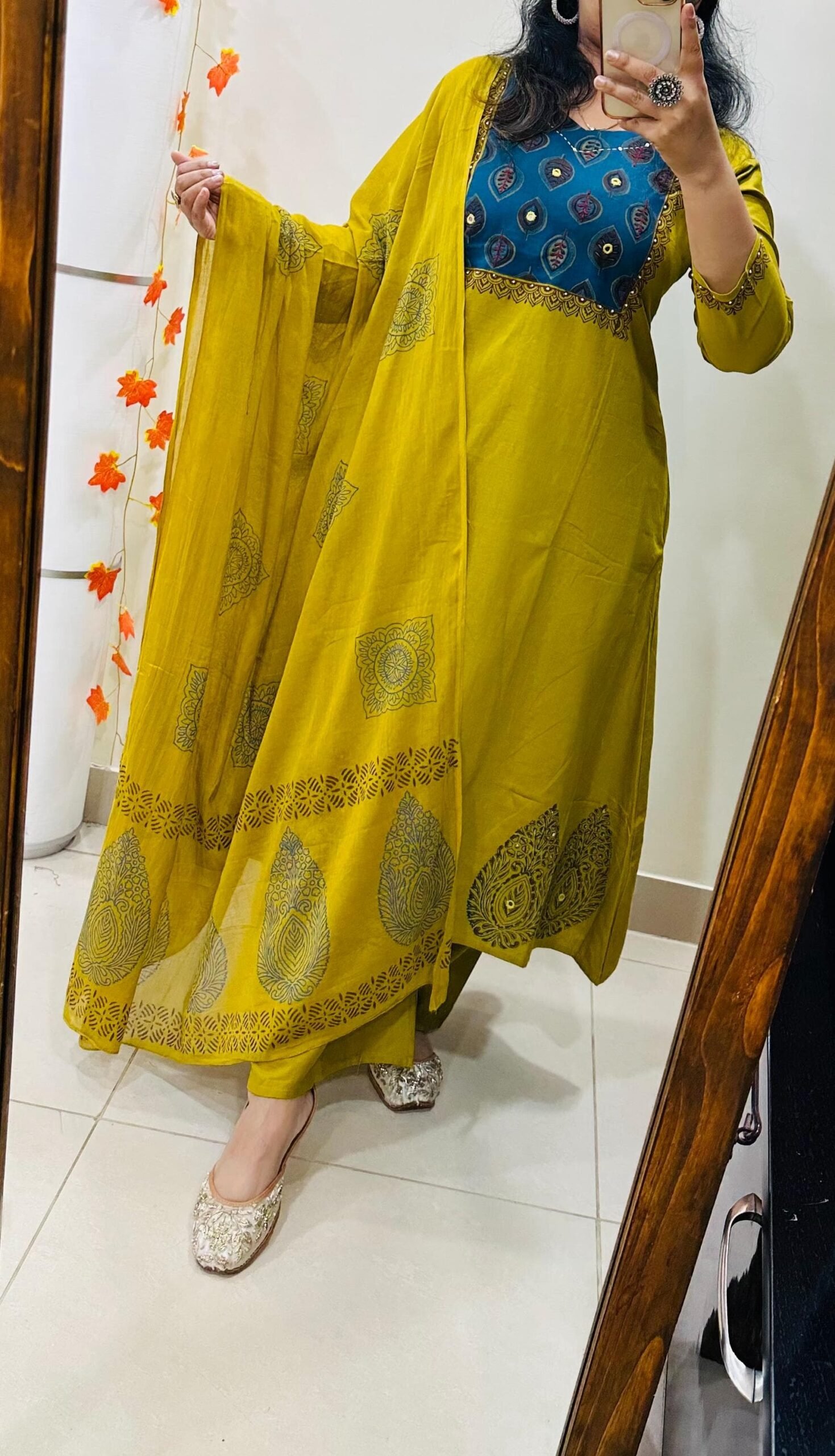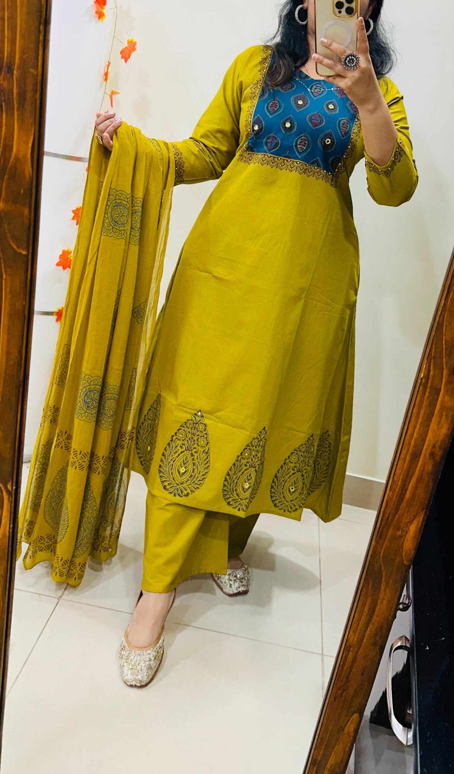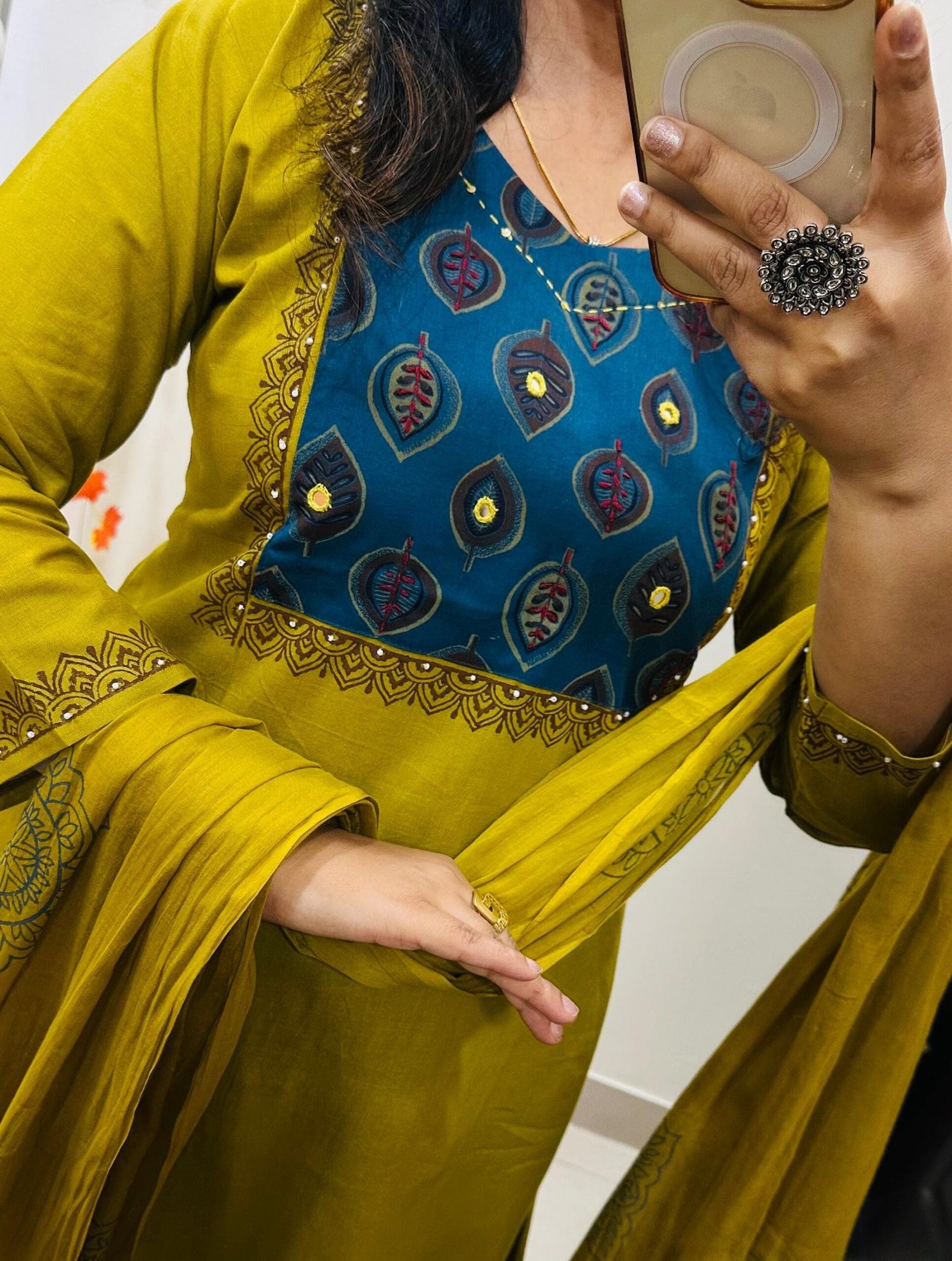 Beautiful kurti pant dupatta set in Premium Cotton Flex with thread work and mirror detailing in yoke ..block print also in back of kurti and also lower part of kurta have block printed with mirror work with fine cotton dupatta