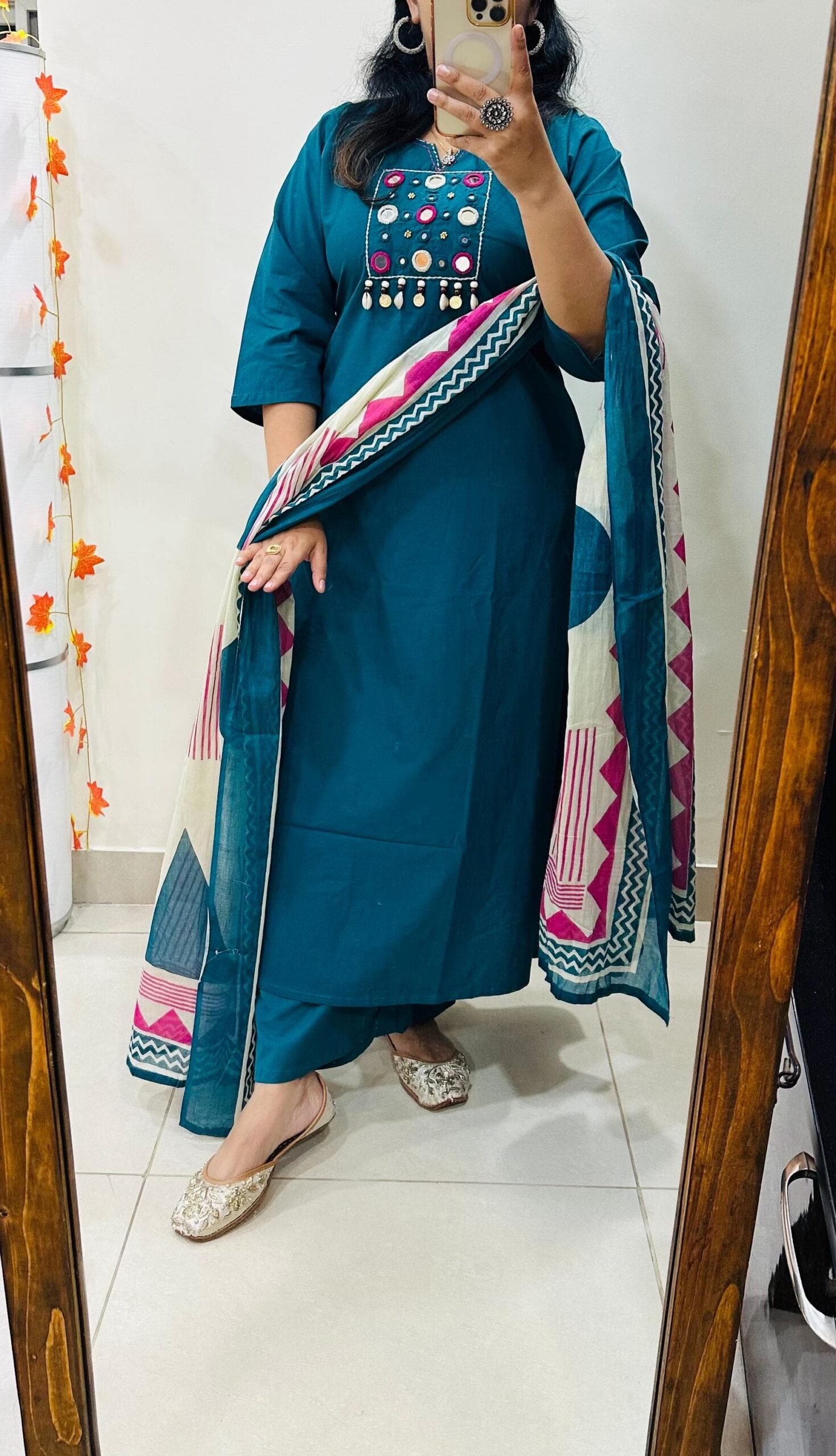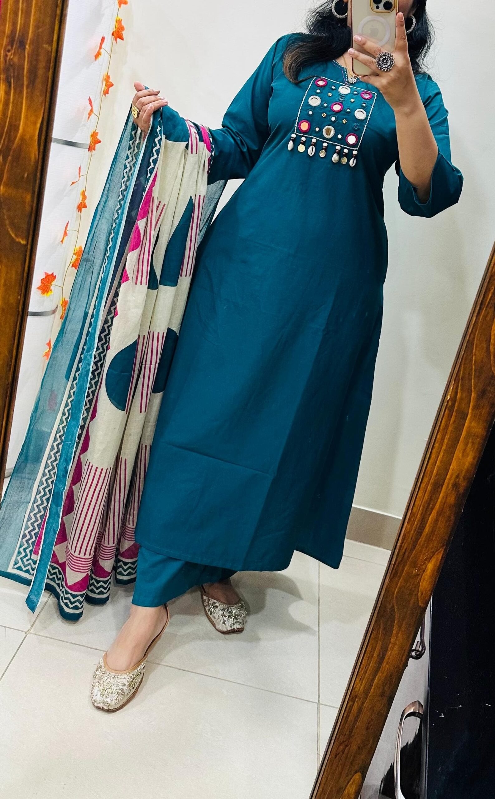 Designer kurti palazzo dupatta set in Premium Pure Cotton with beautiful kowri ,coin and mirror work in yoke with thread detailing in neckline with beautiful block print cotton dupatta