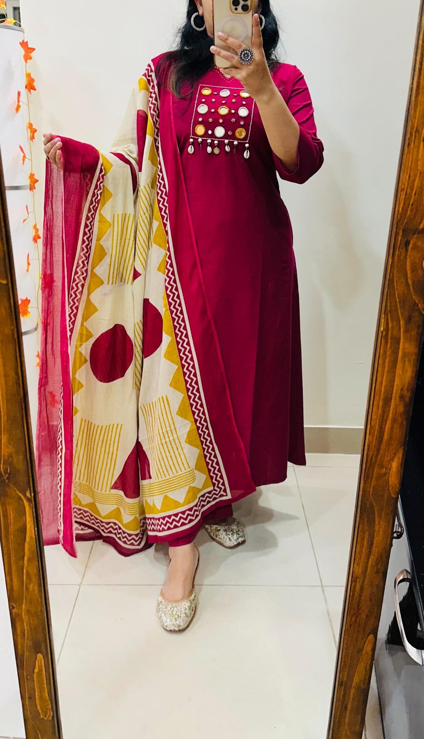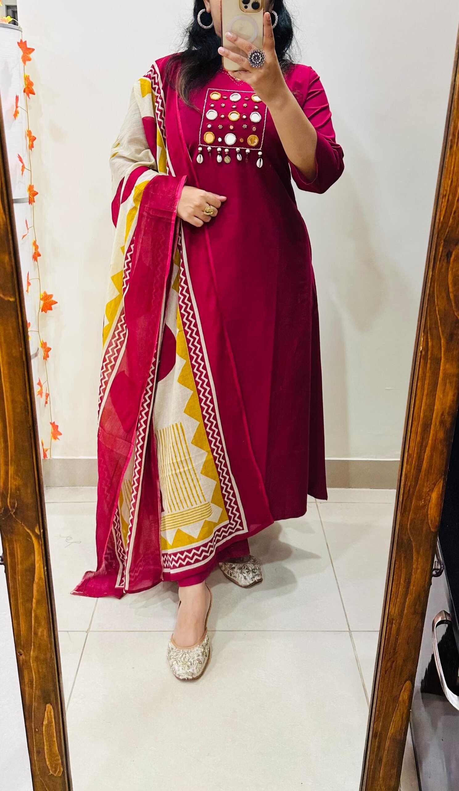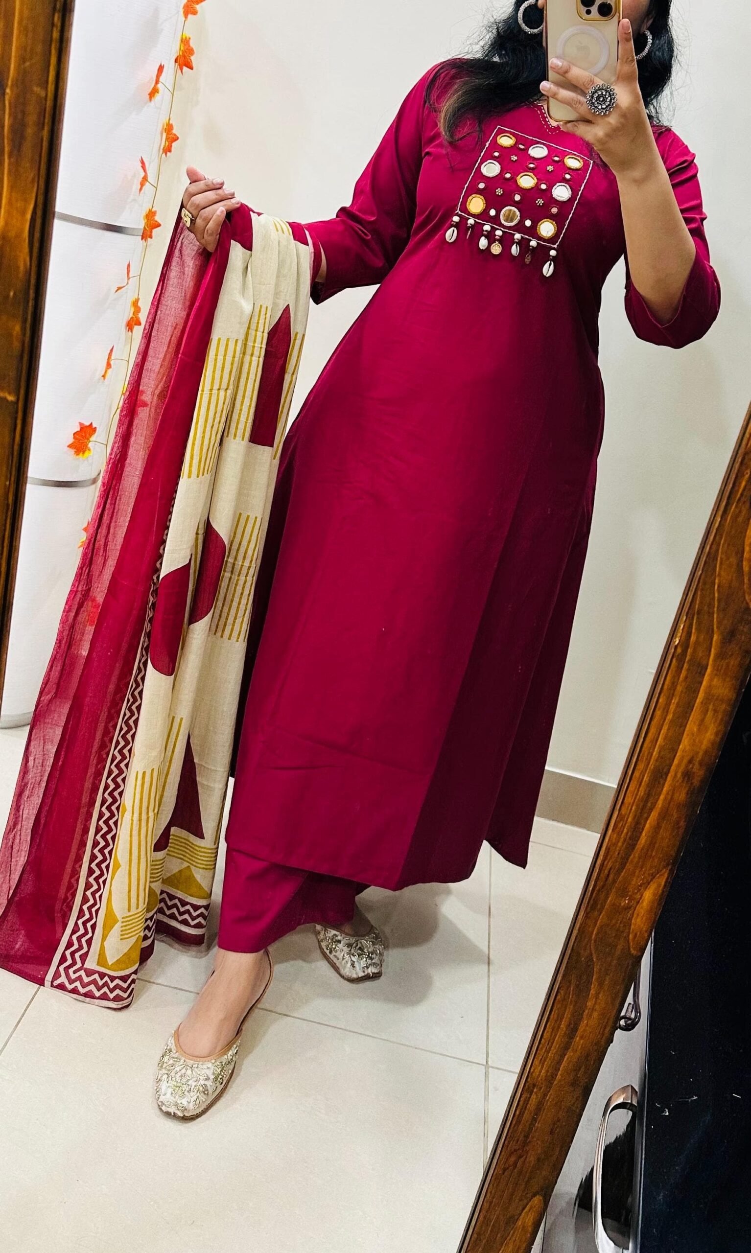Designer kurti palazzo dupatta set in Premium Pure Cotton with beautiful kowri ,coin and mirror work in yoke with thread detailing in neckline with beautiful block print cotton dupatta