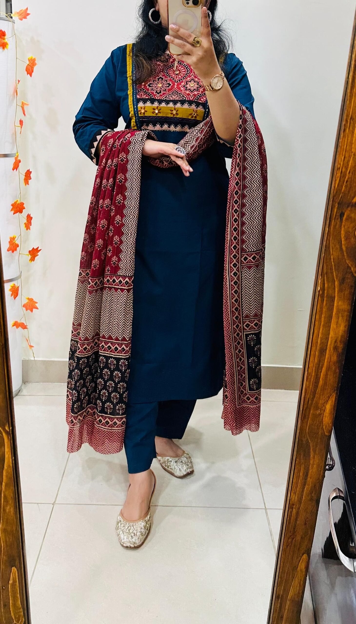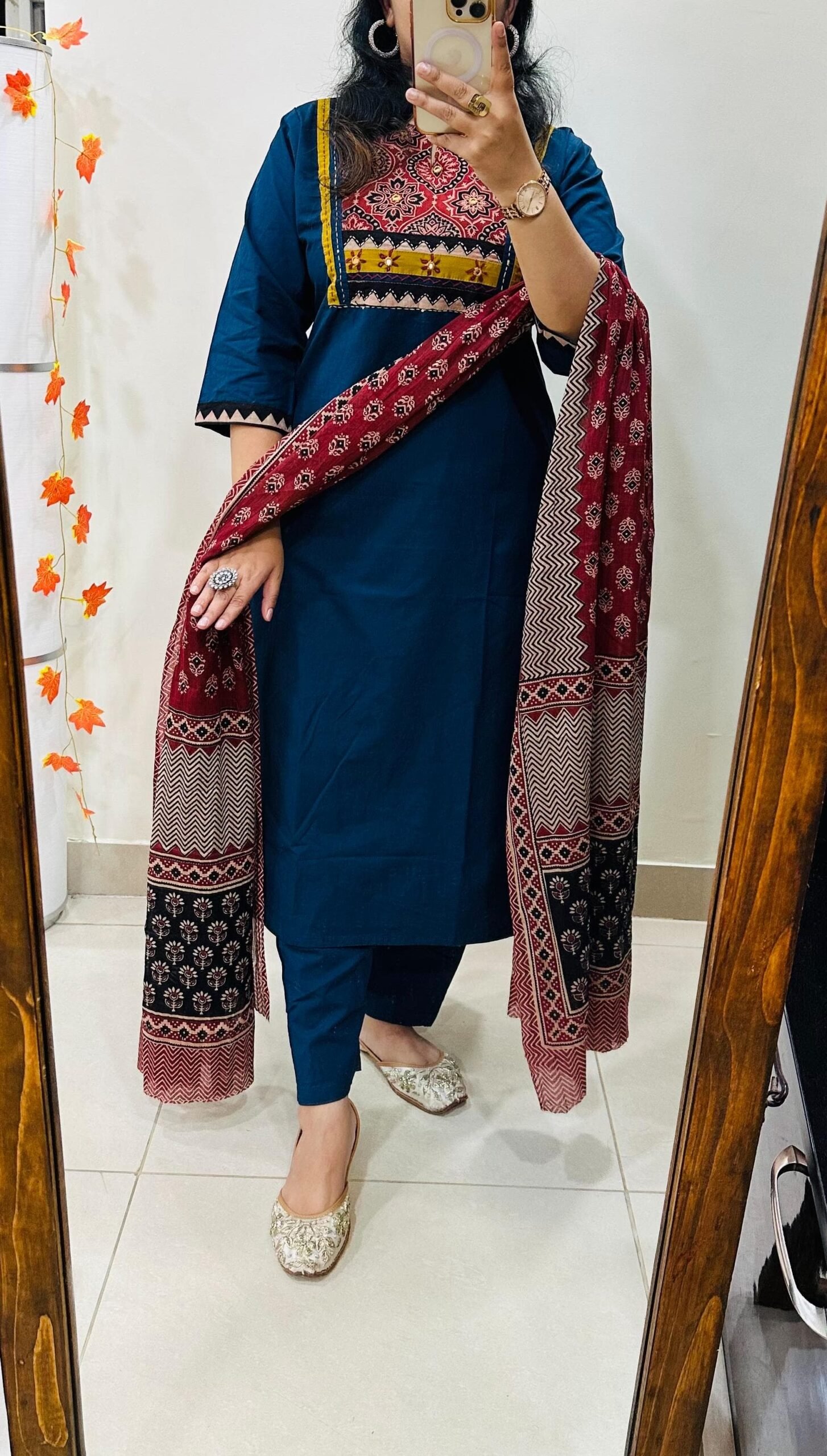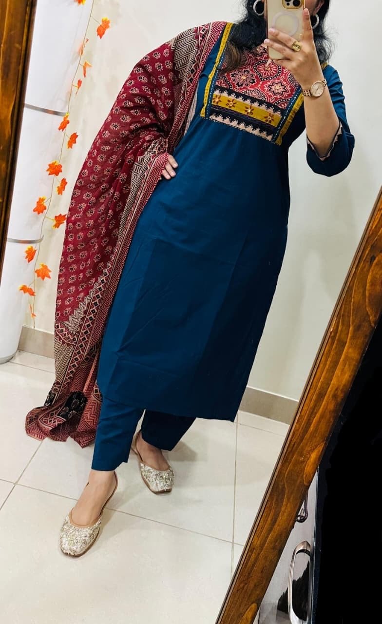 Premium Kurti Pant Dupatta Set in Rich Dhabu cotton fabric with azrakh print detailing of thread sequin and mirror with beautiful azrakh cotton duppata..🥳🥳