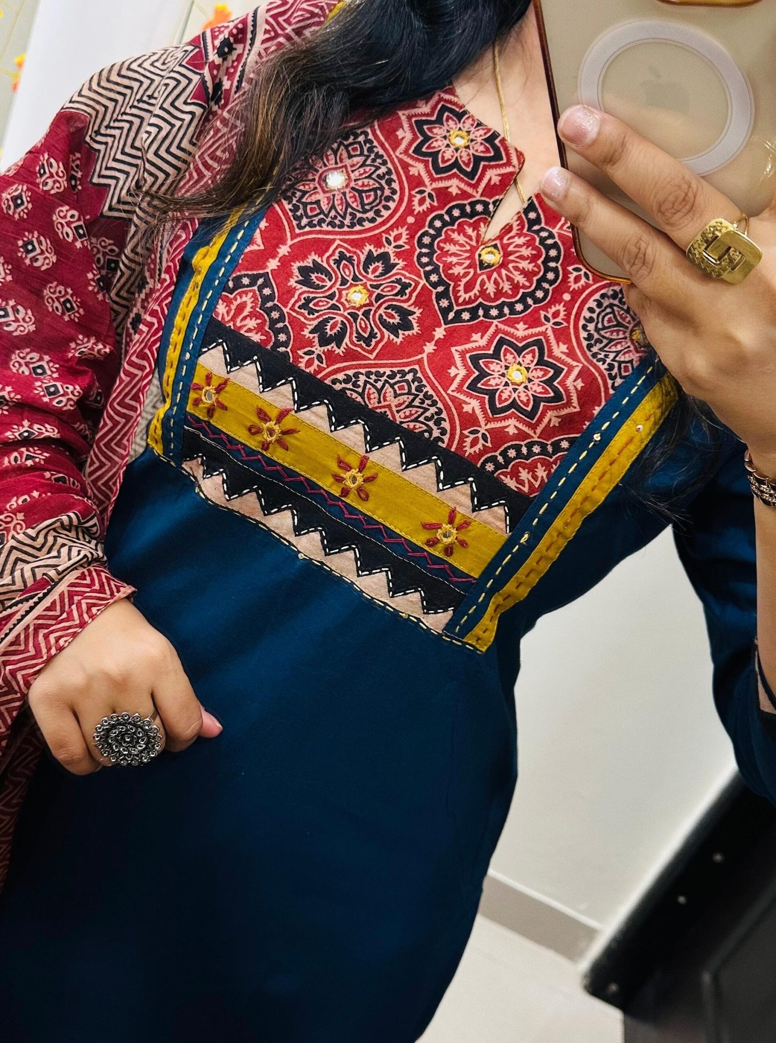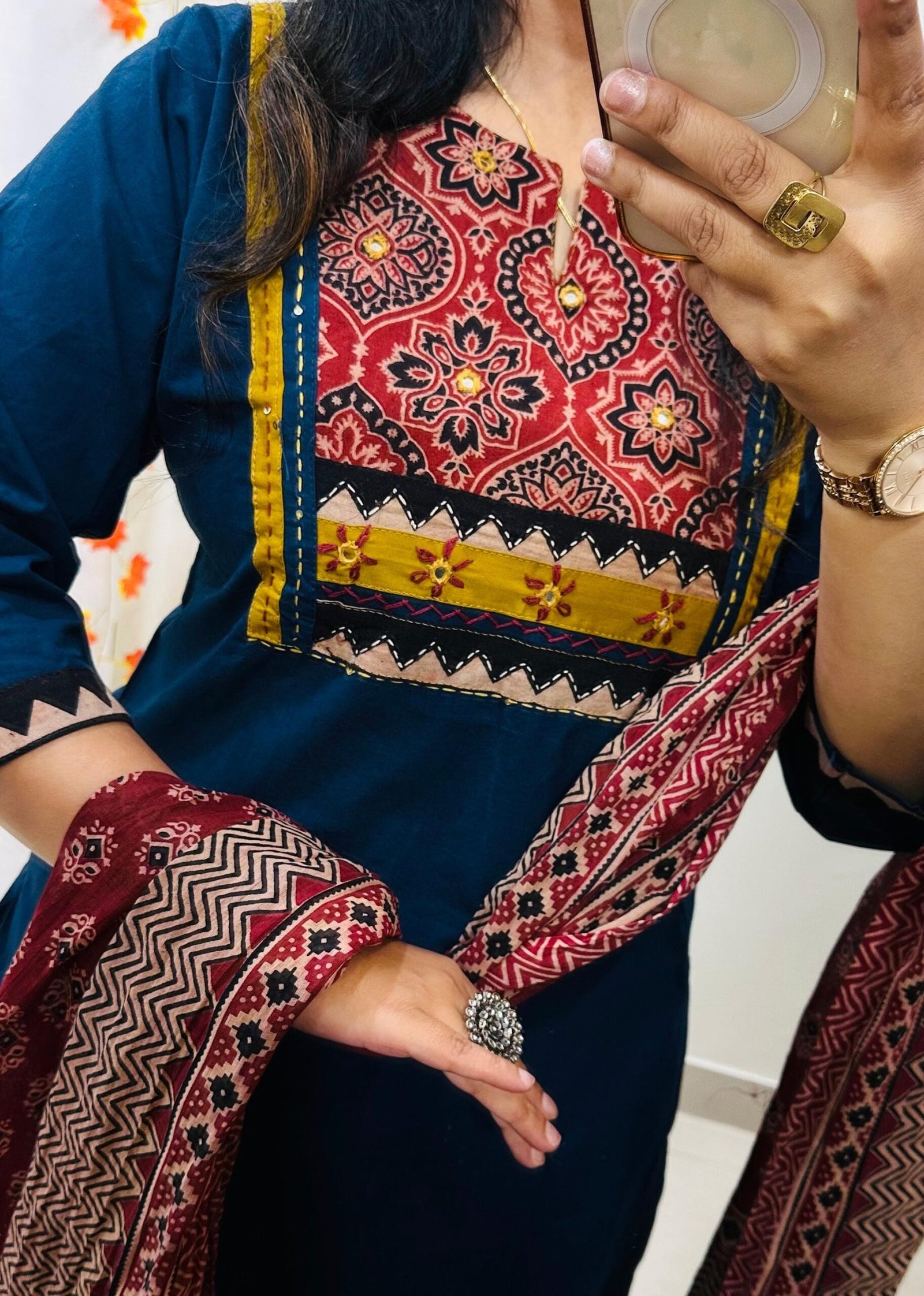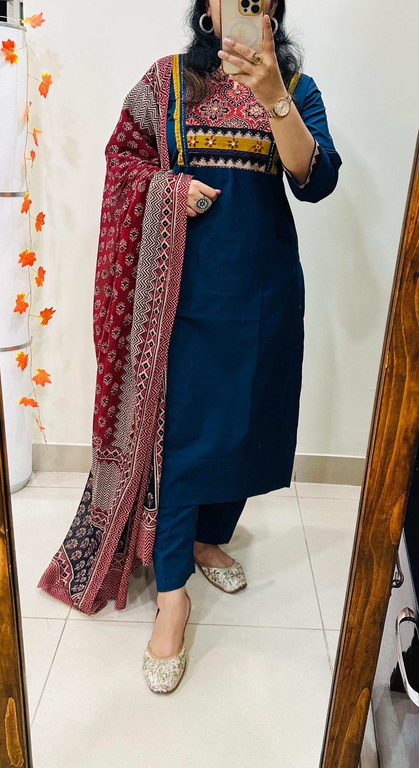 Premium Kurti Pant Dupatta Set in Rich Dhabu cotton fabric with azrakh print detailing of thread sequin and mirror with beautiful azrakh cotton duppata..🥳🥳