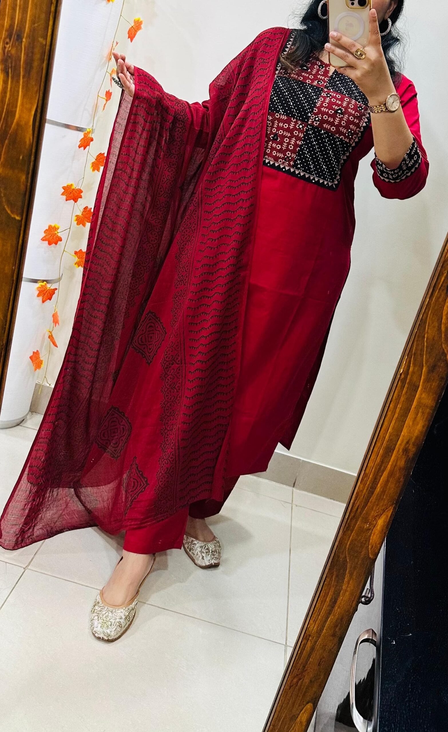 Designer Ethnic Kurti Pant duppata set in Premium Rich Cotton Fabric with azrakh Applique in yoke and sleeves with Real mirror work with thread sequin detailing in yoke