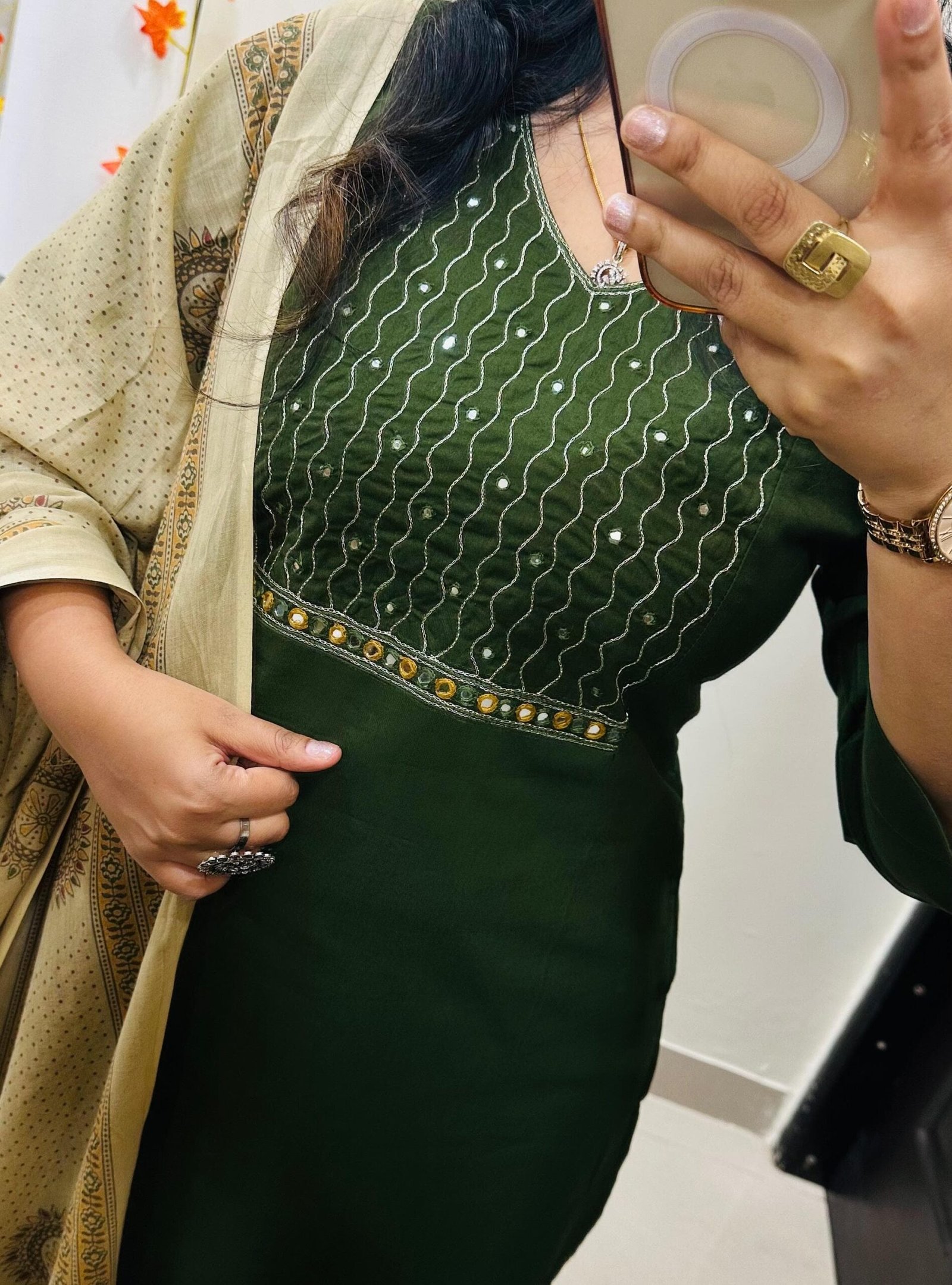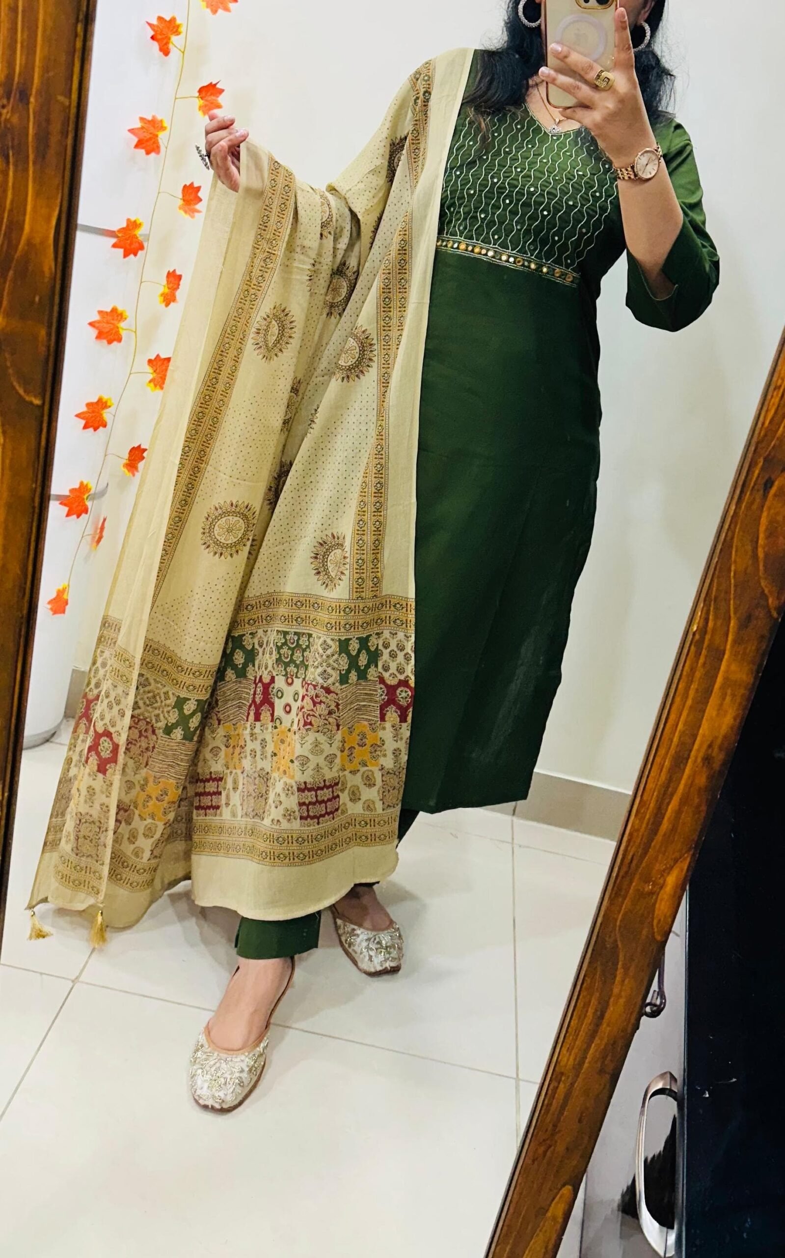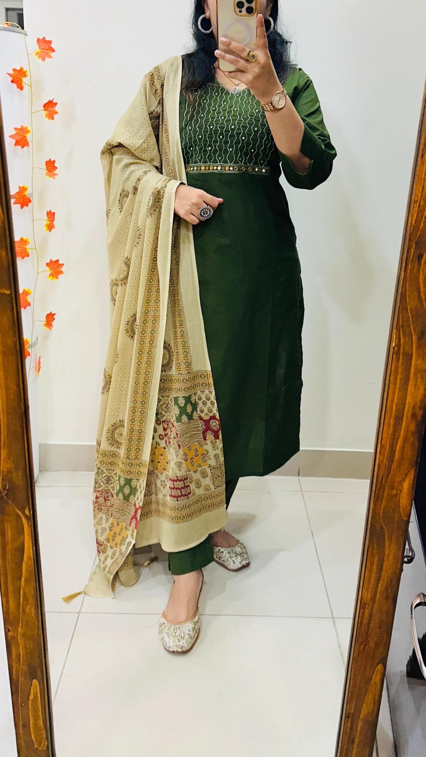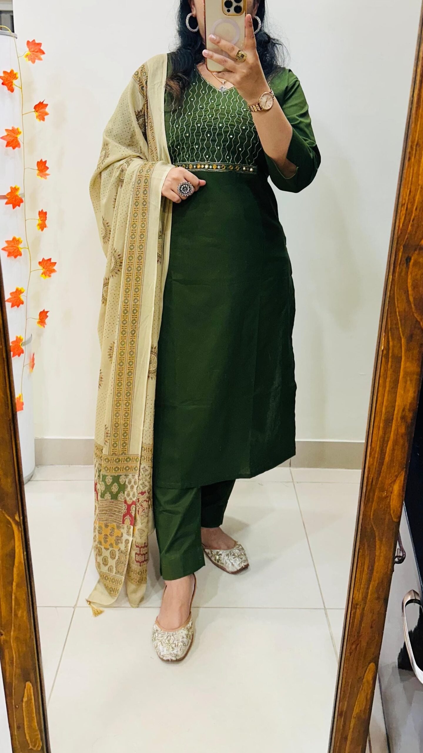 Beautiful kurti pant dupatta set in Premium Dhabu Cotton with heavy Zari detailing with real mirror and thread work in yoke with beautiful fine cotton dupatta with tussels