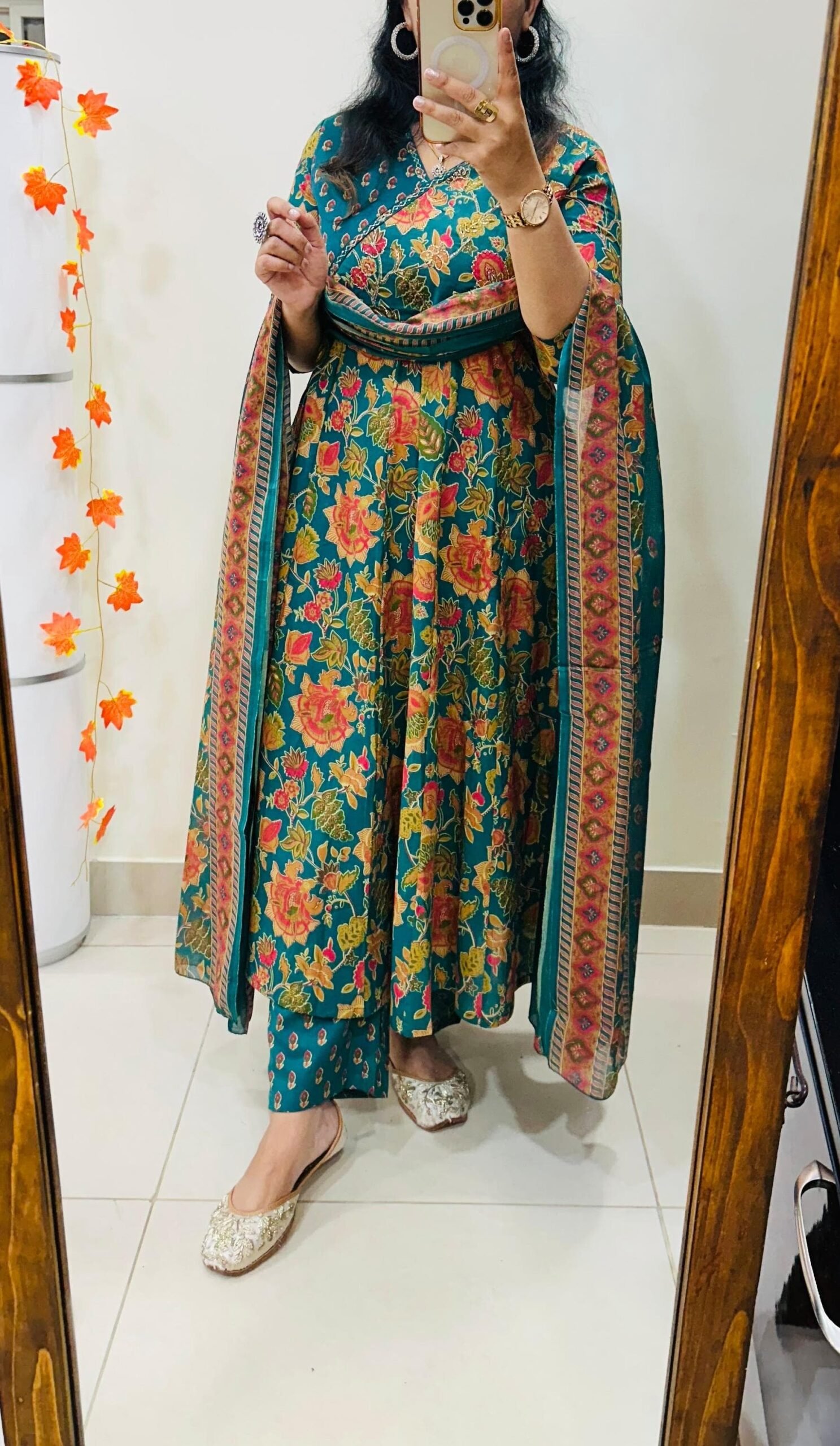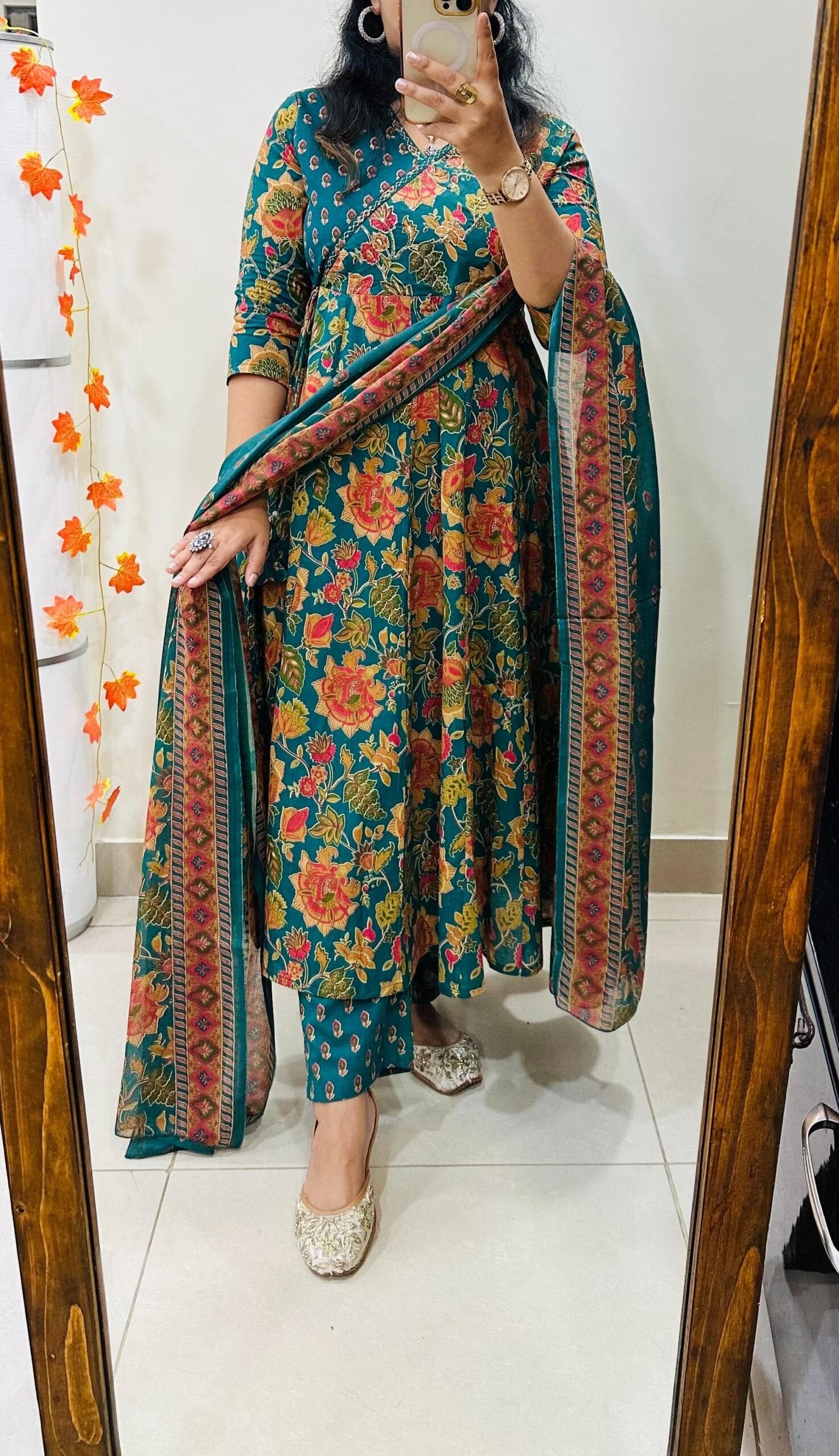 Designer Mughal Theme in Idaho style Floral Kali Kurti Pant dupatta set in Premium fine Cotton Fabric with badla adda work on yoke and side fashion tassels giving gorgeous look… 💥💥