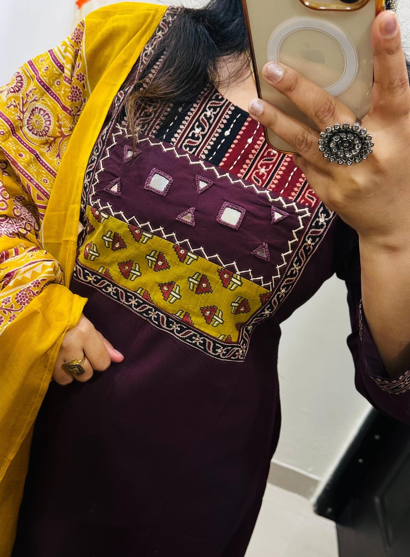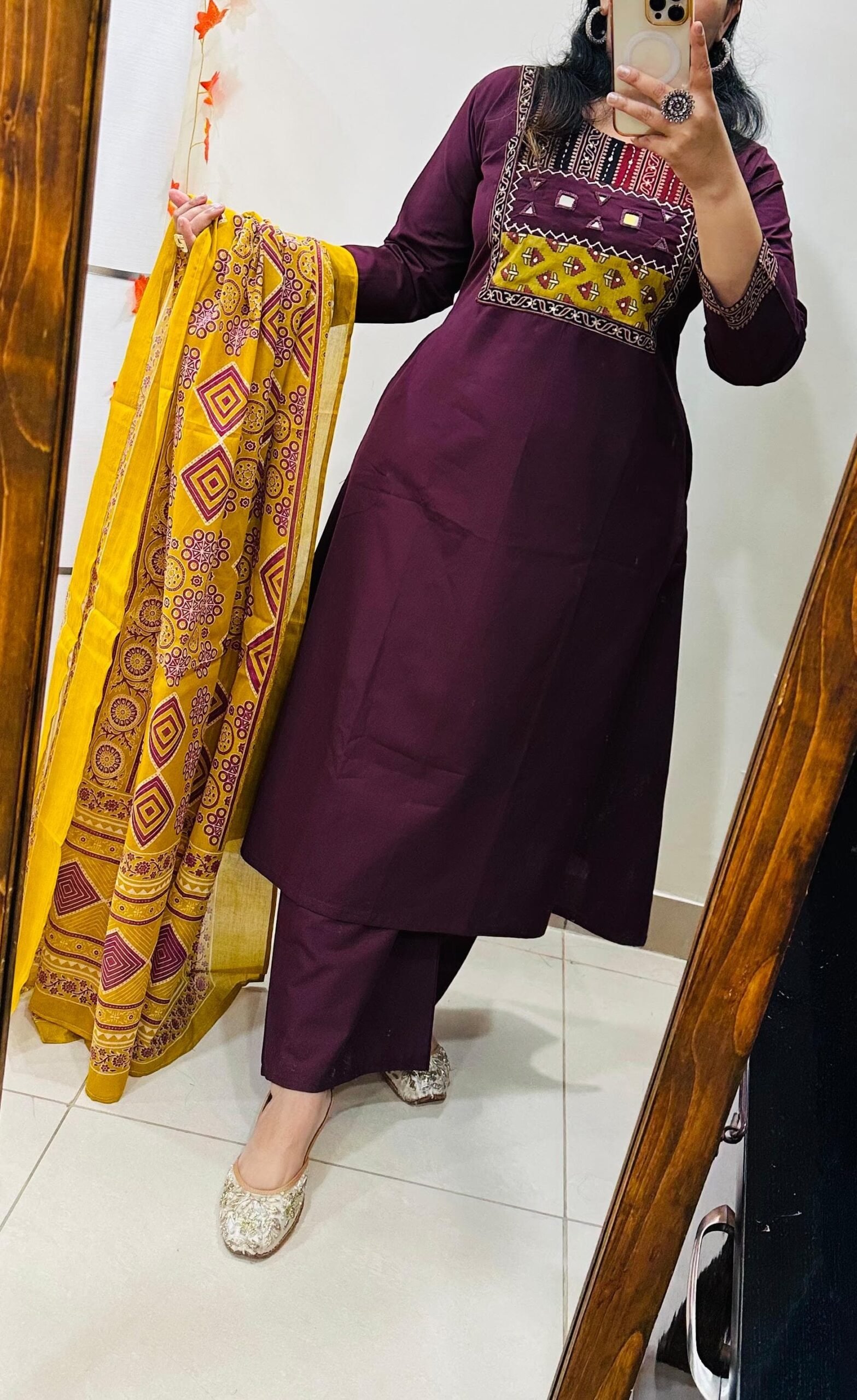 Beautiful kurti palazzo dupatta set in Premium Dhabu Cotton with beautiful azrakh applique with sequin detailing and real mirror work in yoke with cotton dupatta