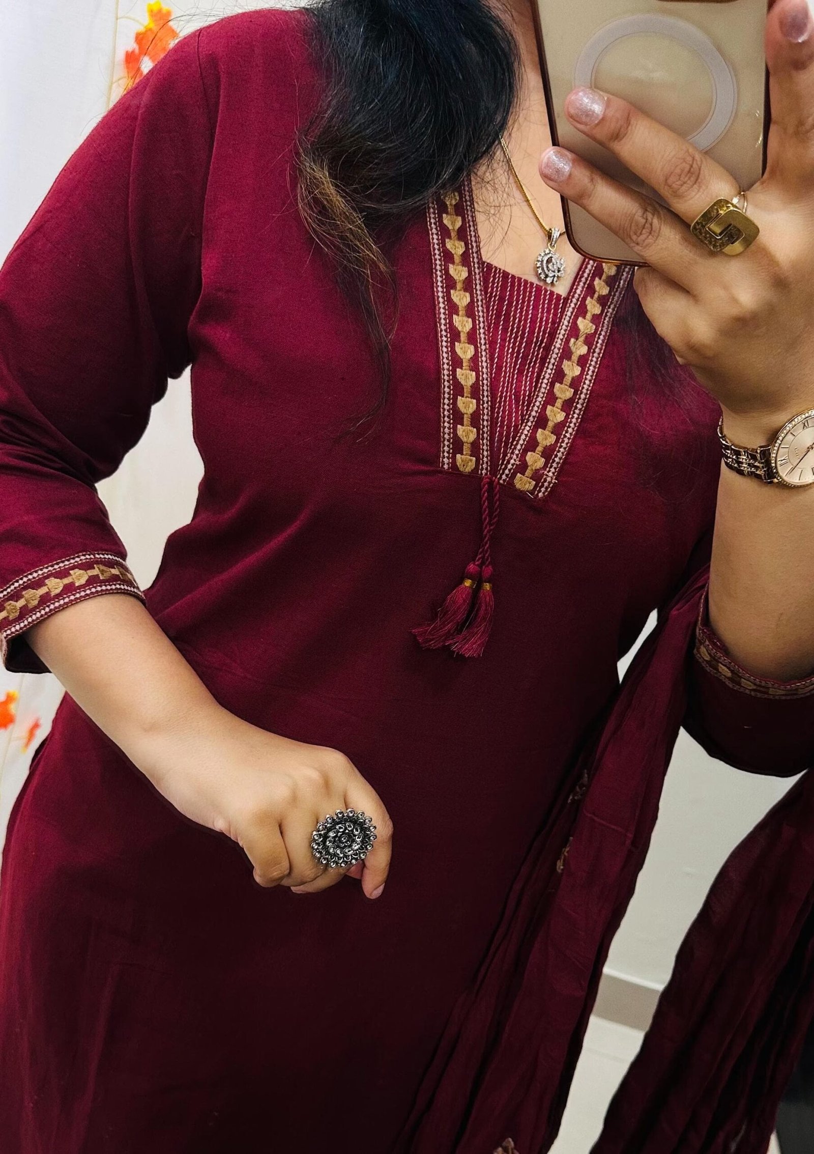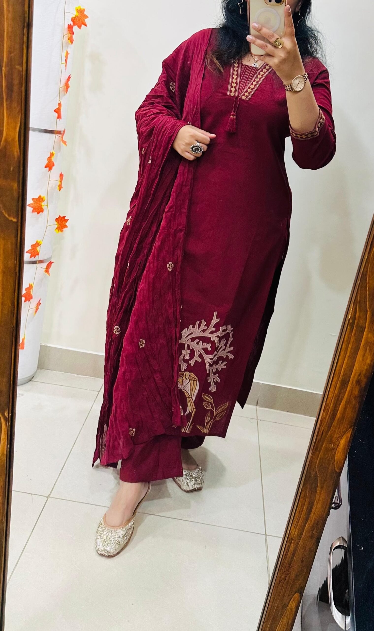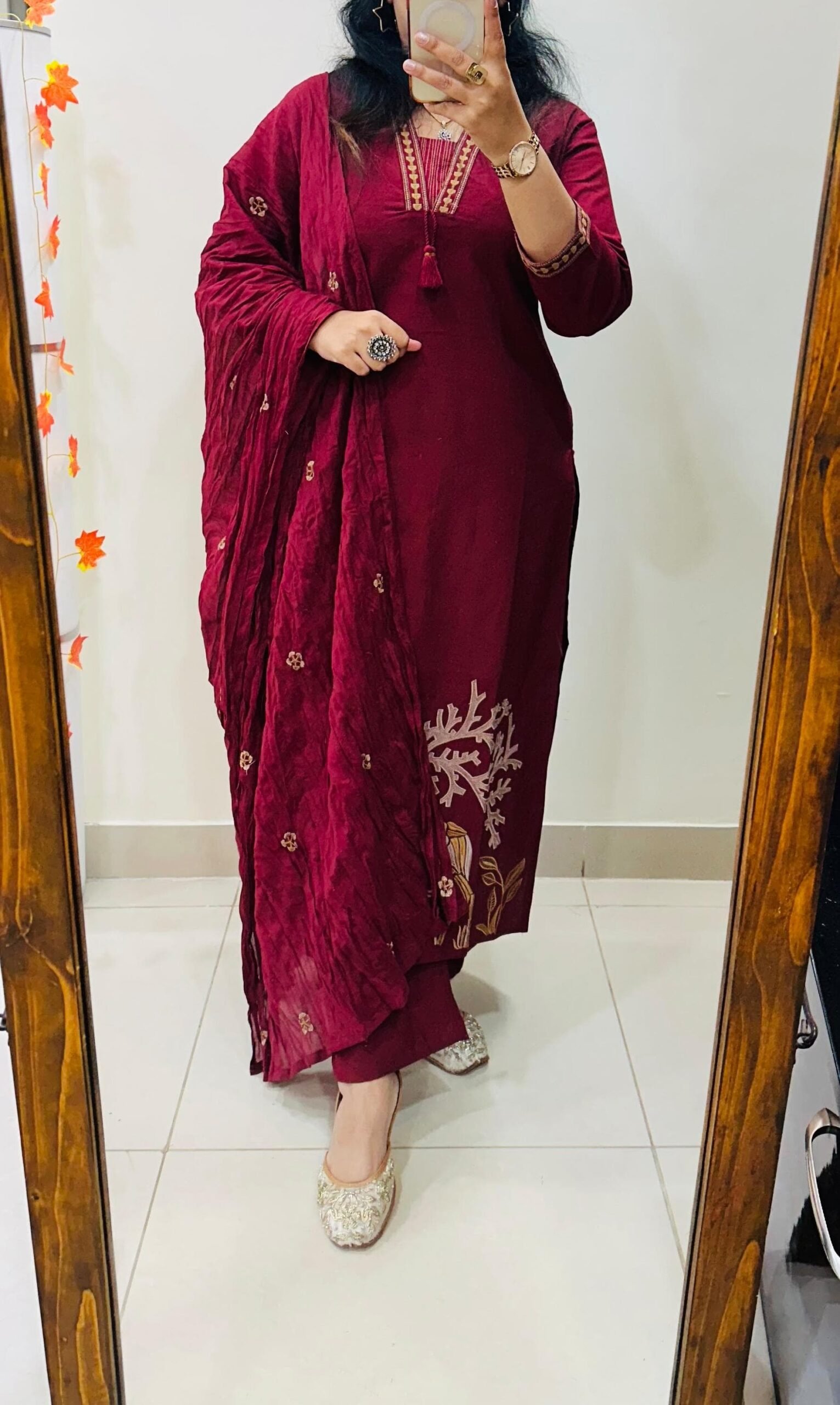 Stylish Ethnic Kurti Pant Set in Rich Cotton Flex with Heavy Embroidery work in yoke sleeves and bottom of kurti …dupatta detailing with embroidery butti