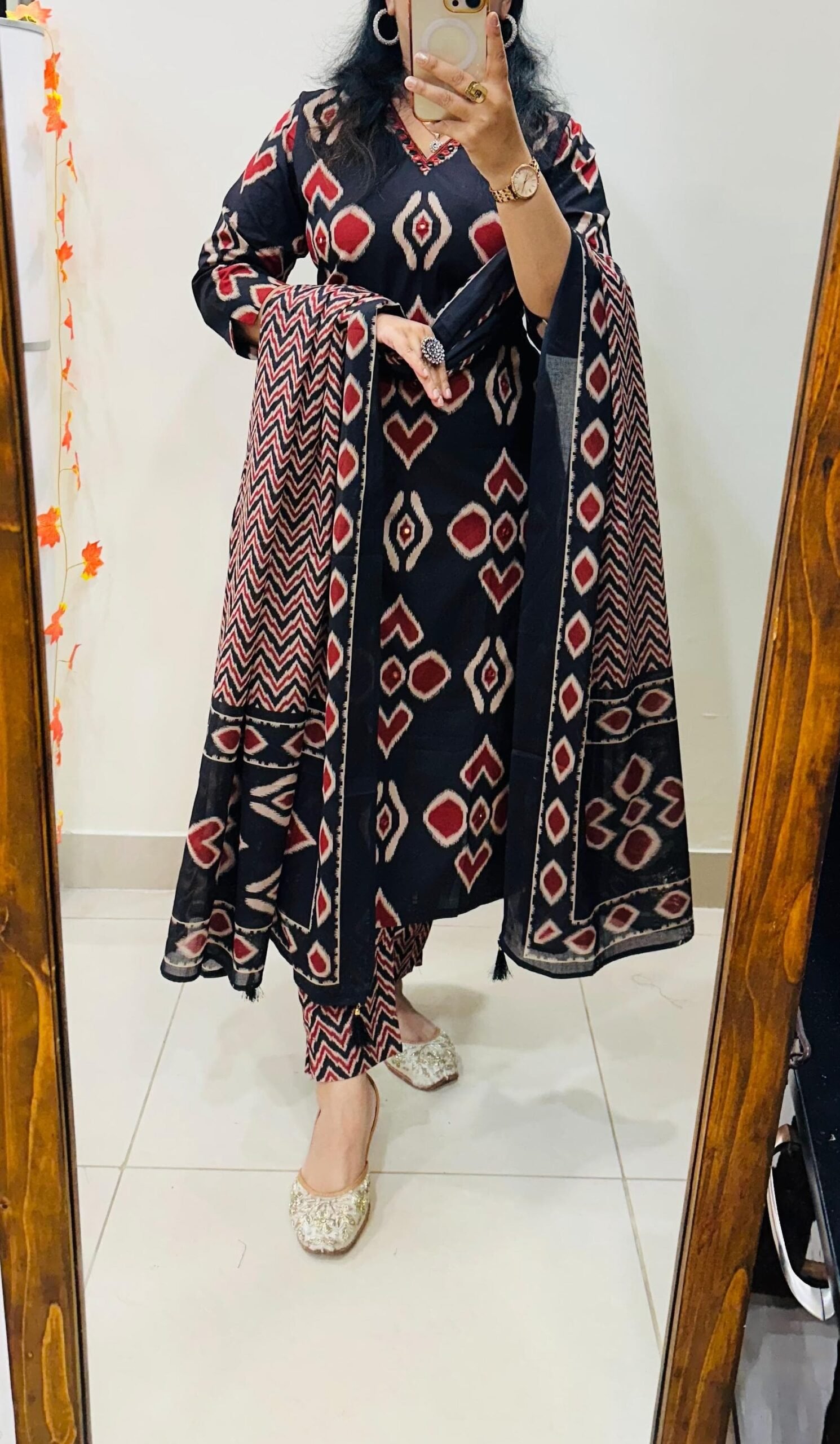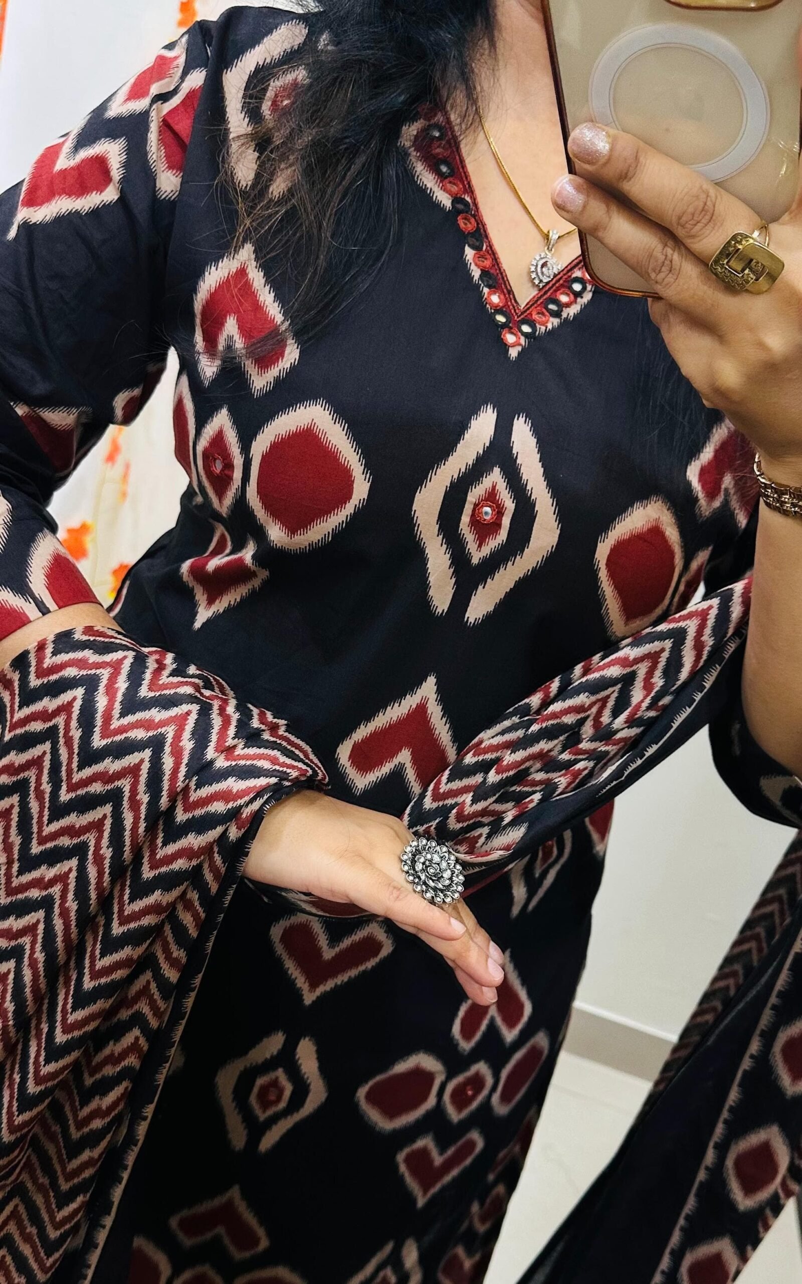 Beautiful Designer kurti pant dupatta set in Premium Fine Cotton with real mirror work in neckline and all over kurti paired with fine cotton dupatta with tussels
