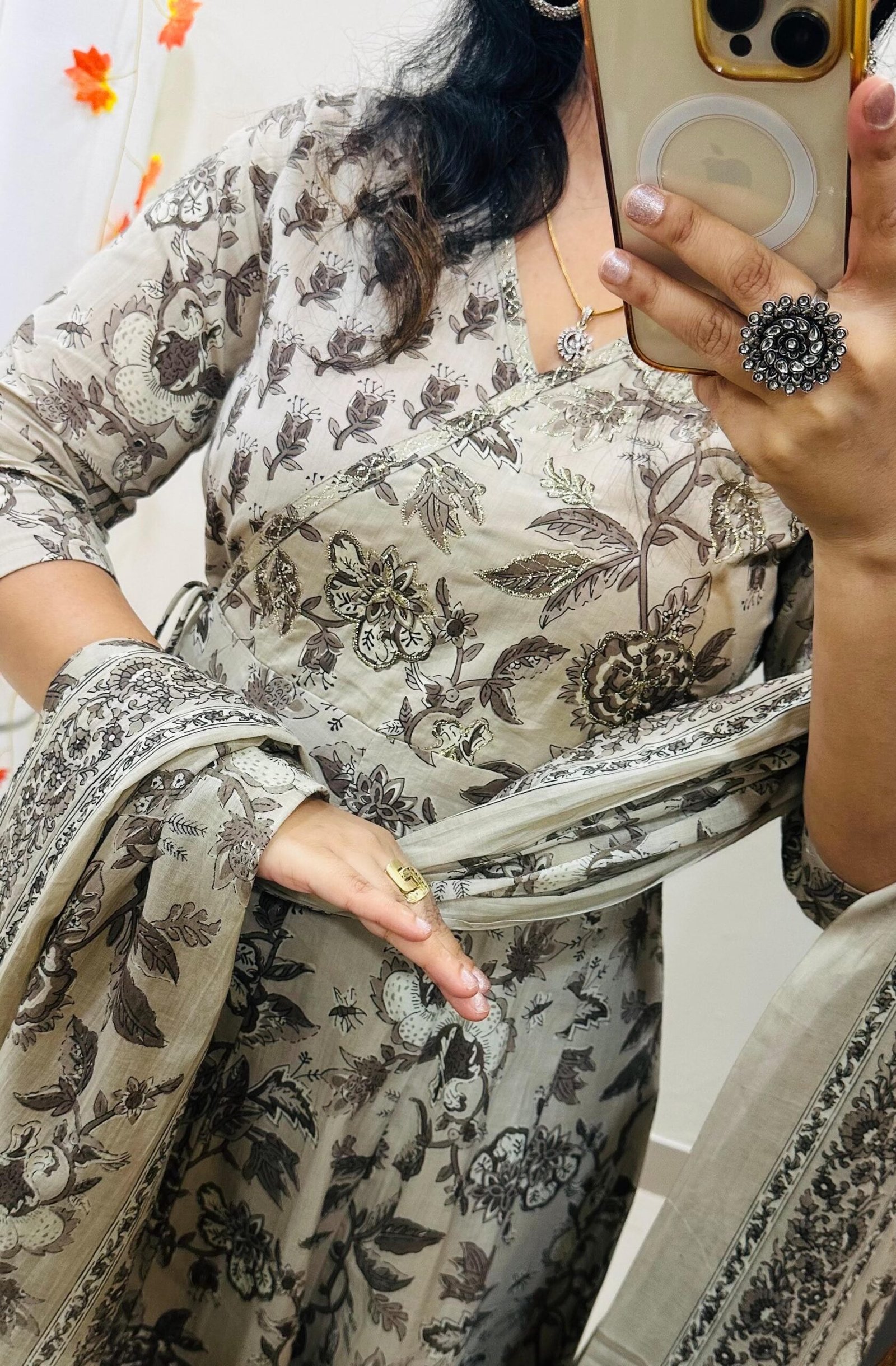 Designer Mughal Theme in Idaho style Floral Kali Kurti Pant dupatta set in Premium fine Cotton Fabric with badla adda work on yoke and side fashion tassels giving