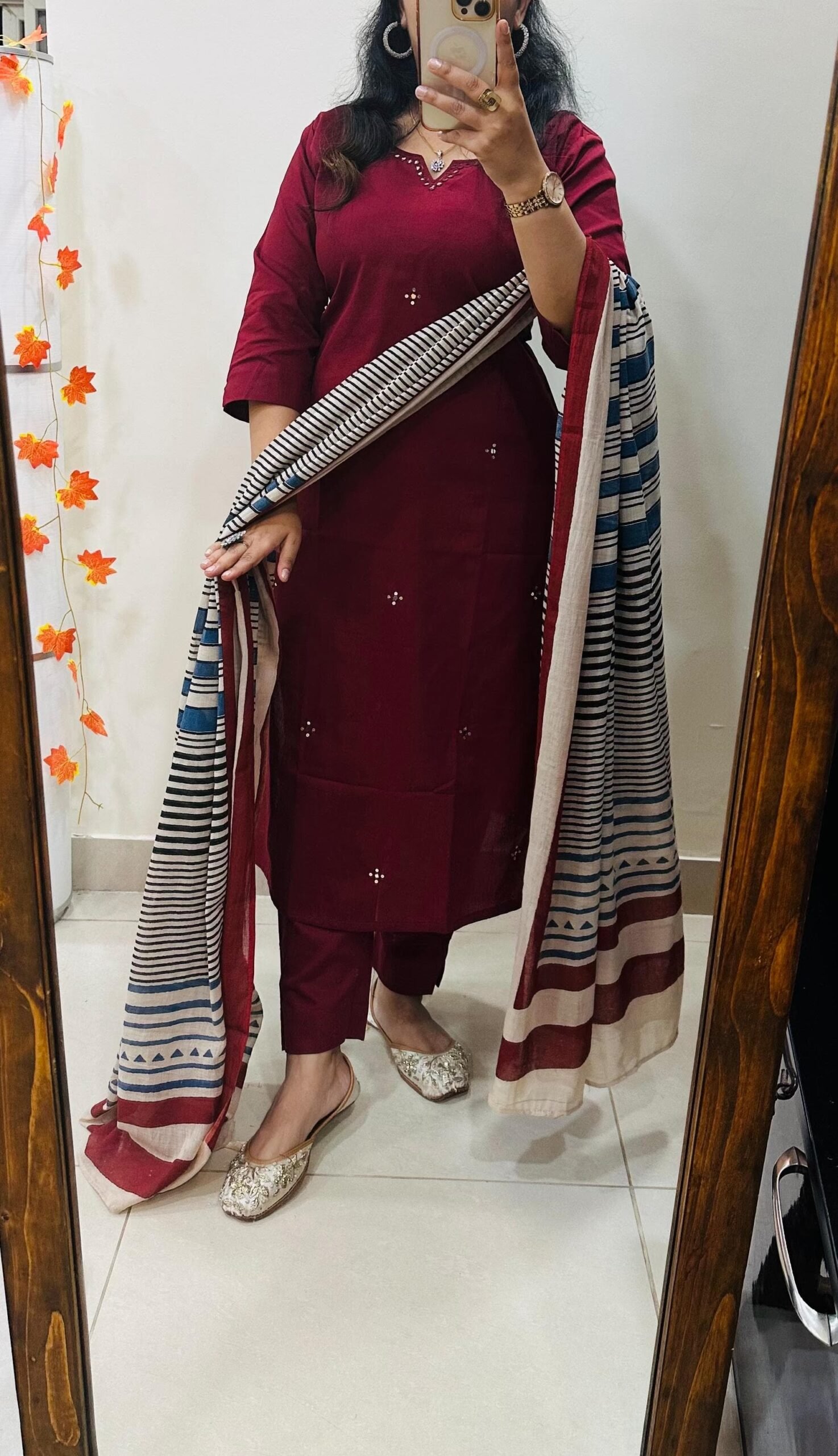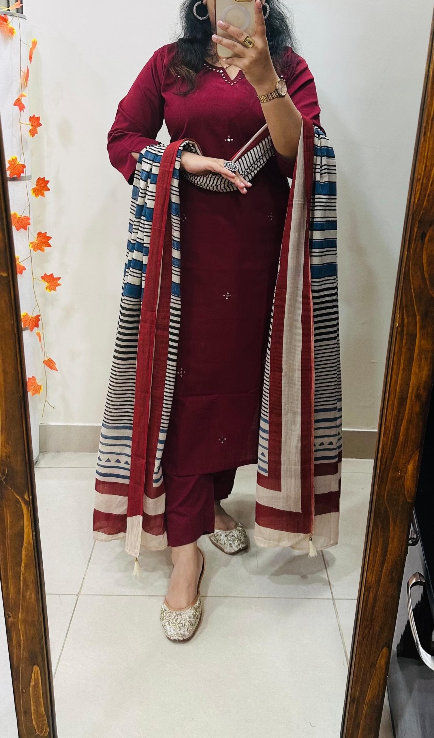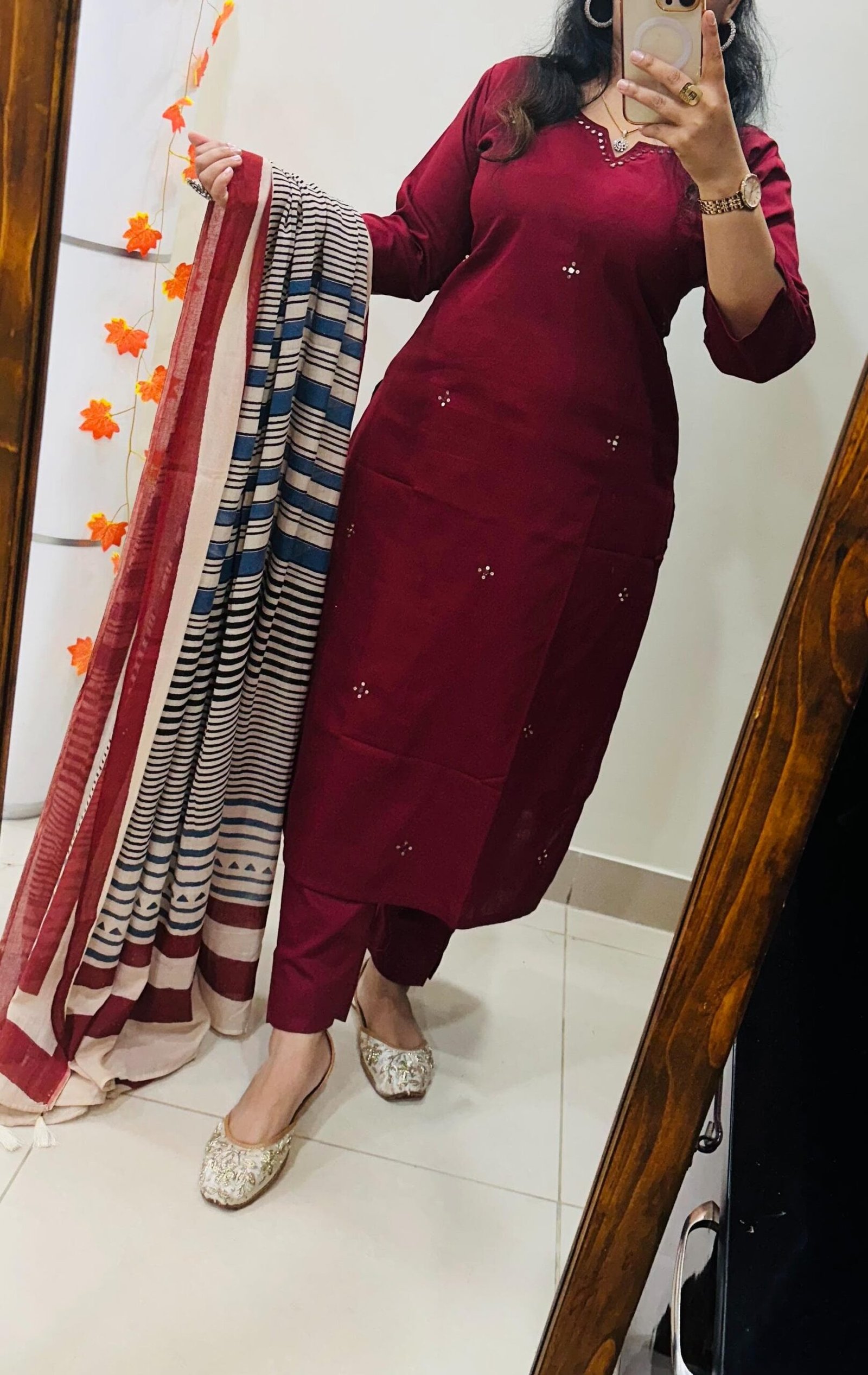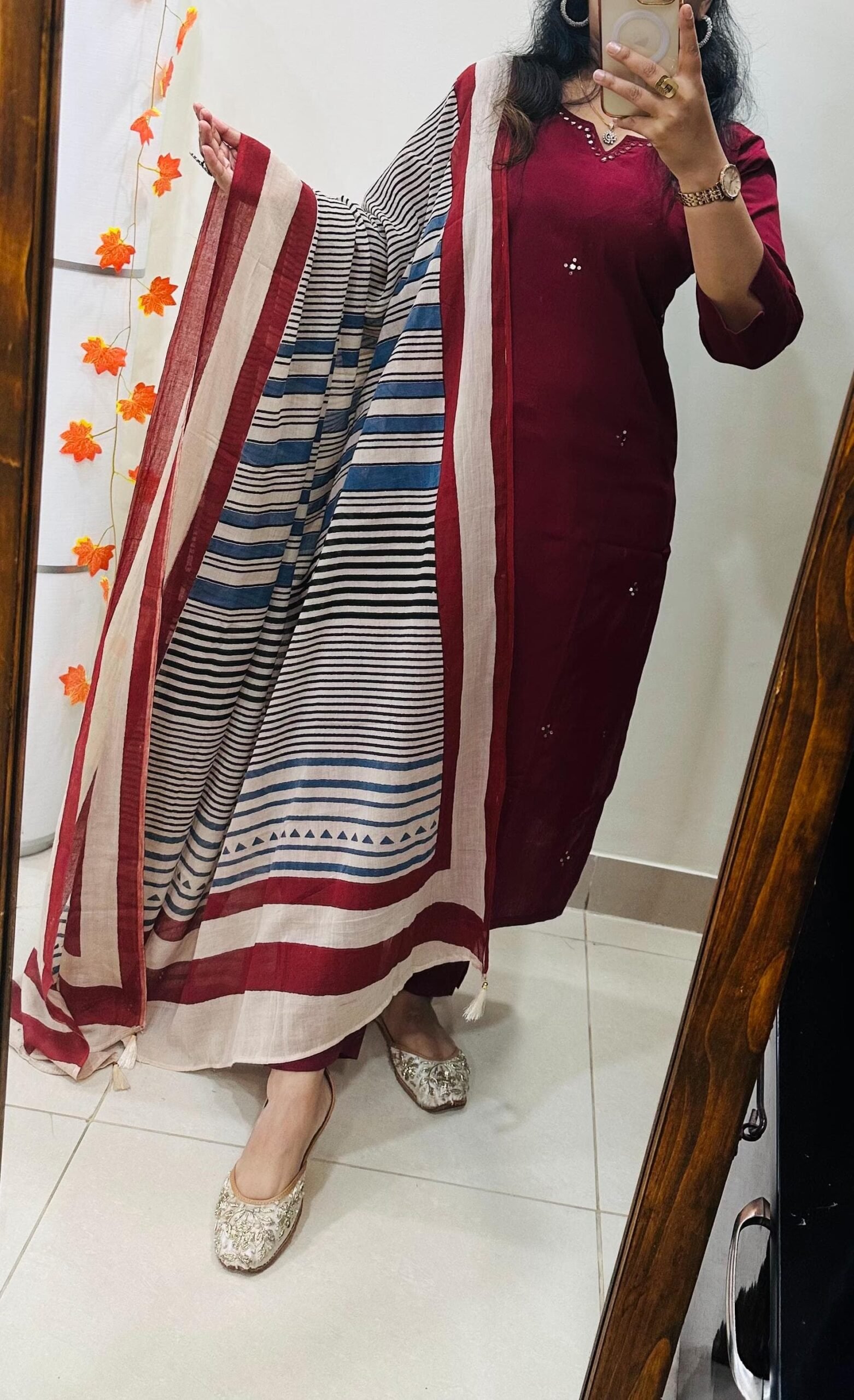 Beautiful kurti pant dupatta set in Premium Cotton Flex with real mirror work in neckline and detailing all over kurti with hand block print mil mul cotton dupatta