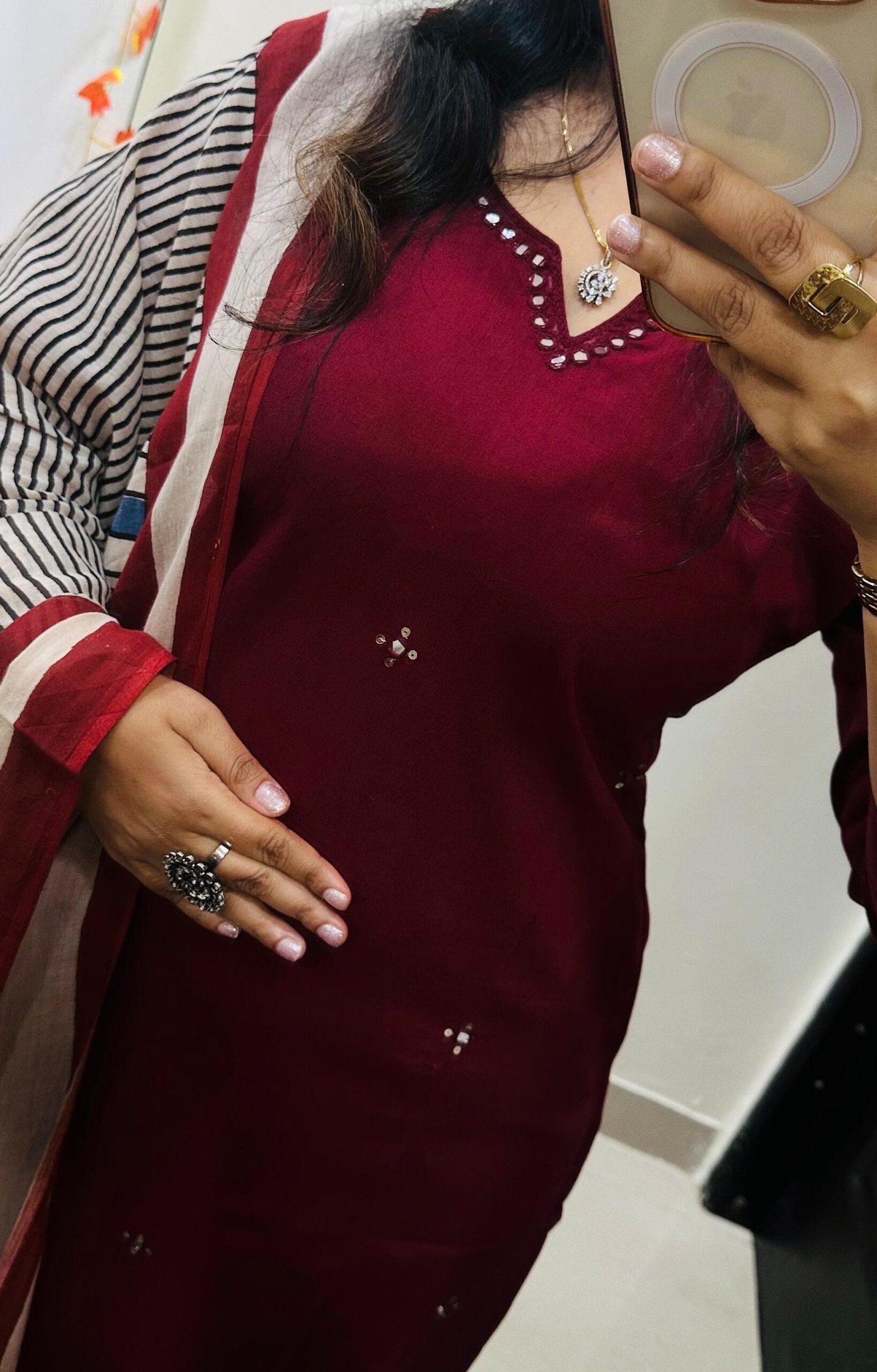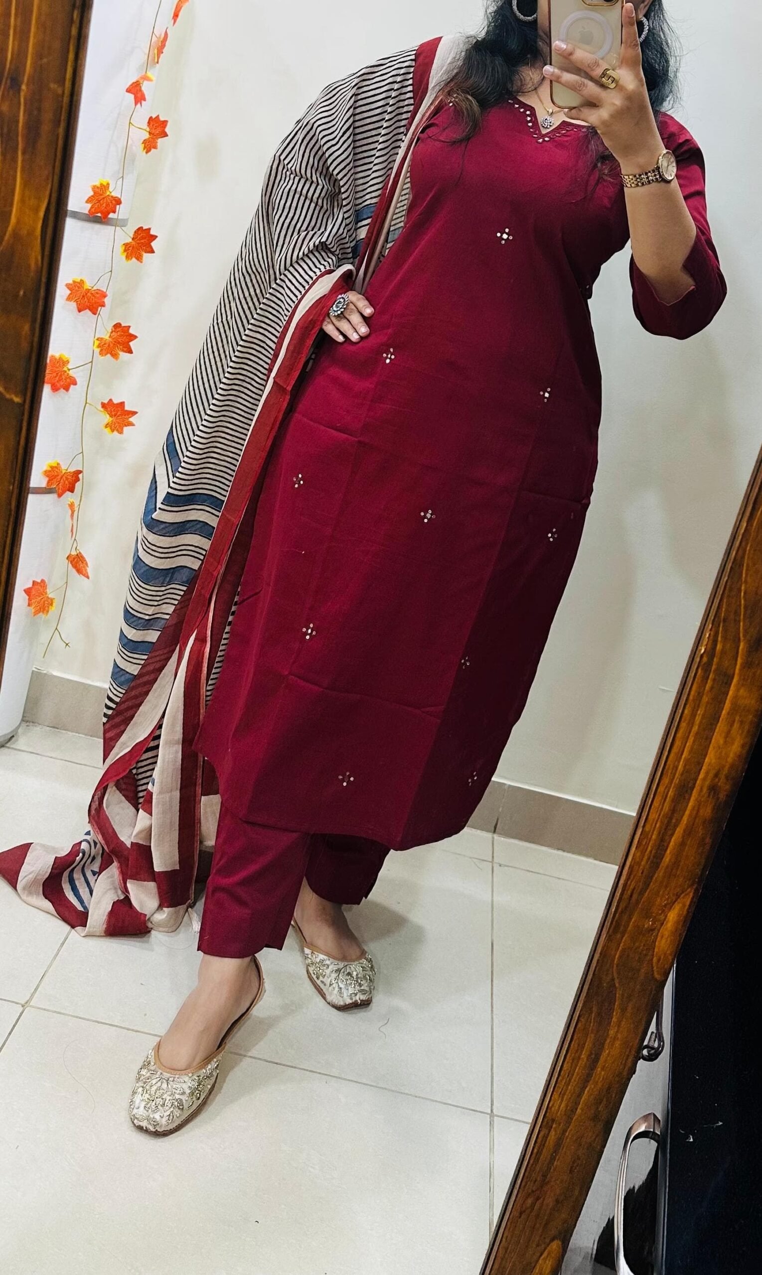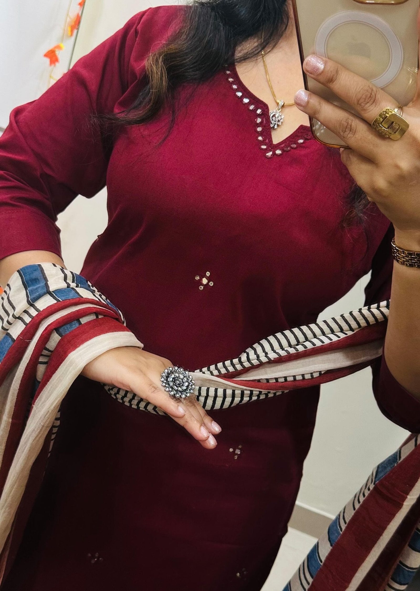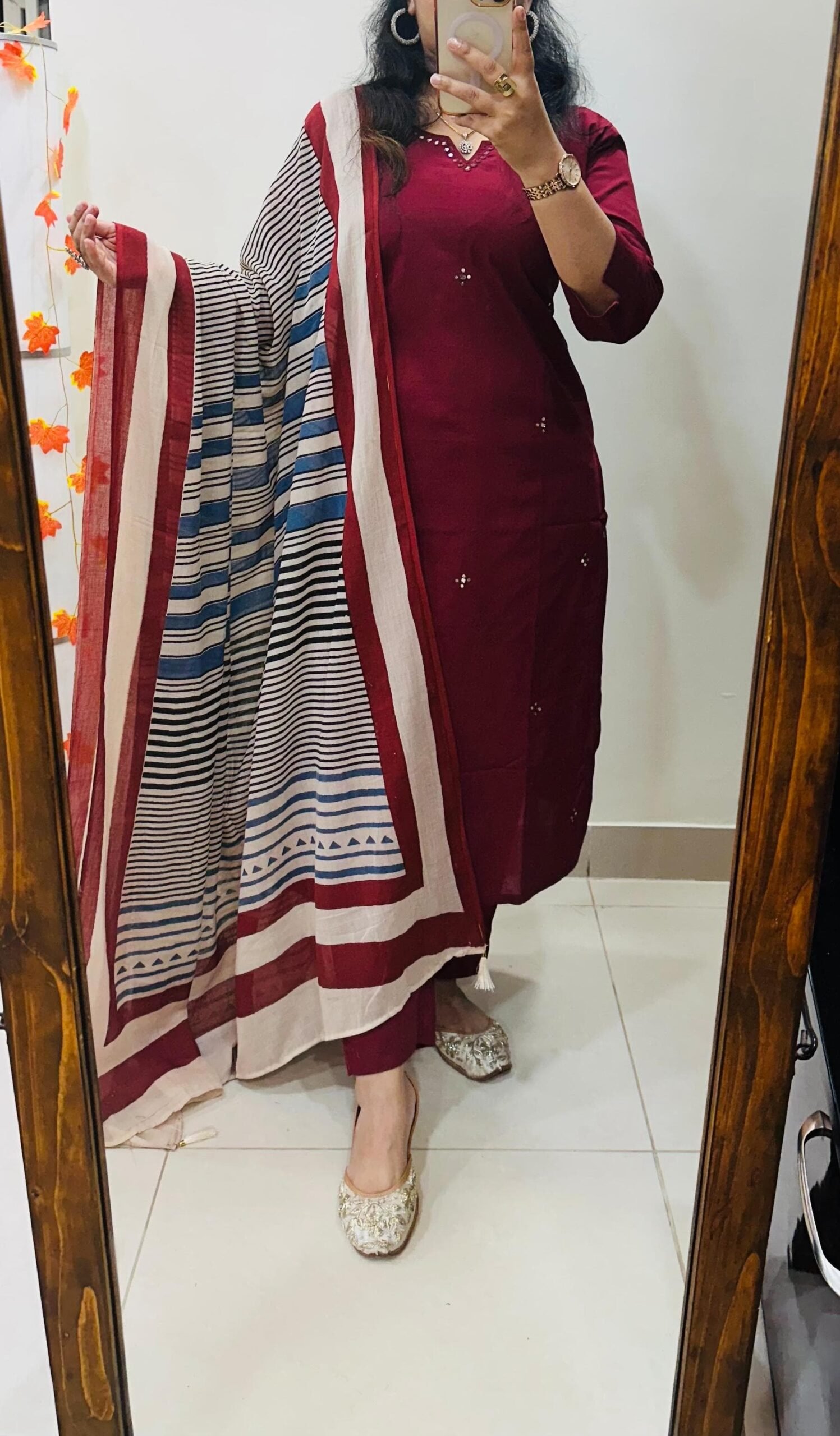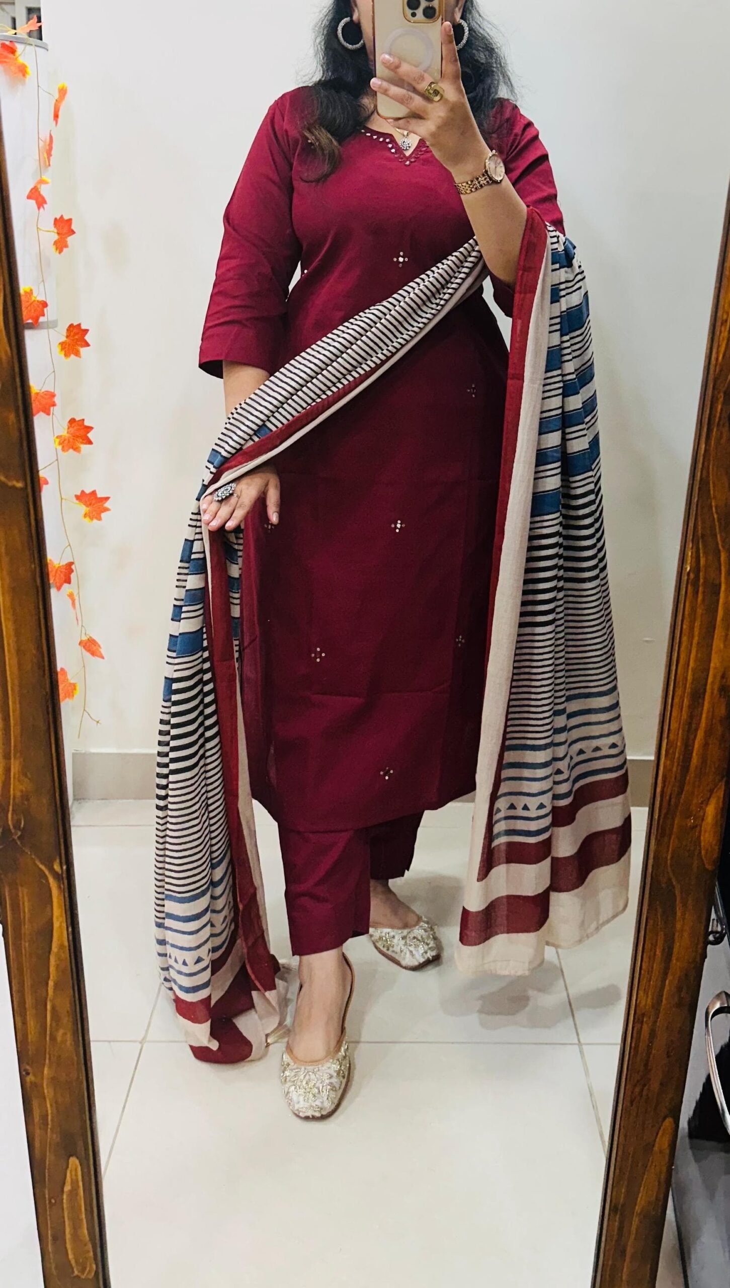 Beautiful kurti pant dupatta set in Premium Cotton Flex with real mirror work in neckline and detailing all over kurti with hand block print mil mul cotton dupatta