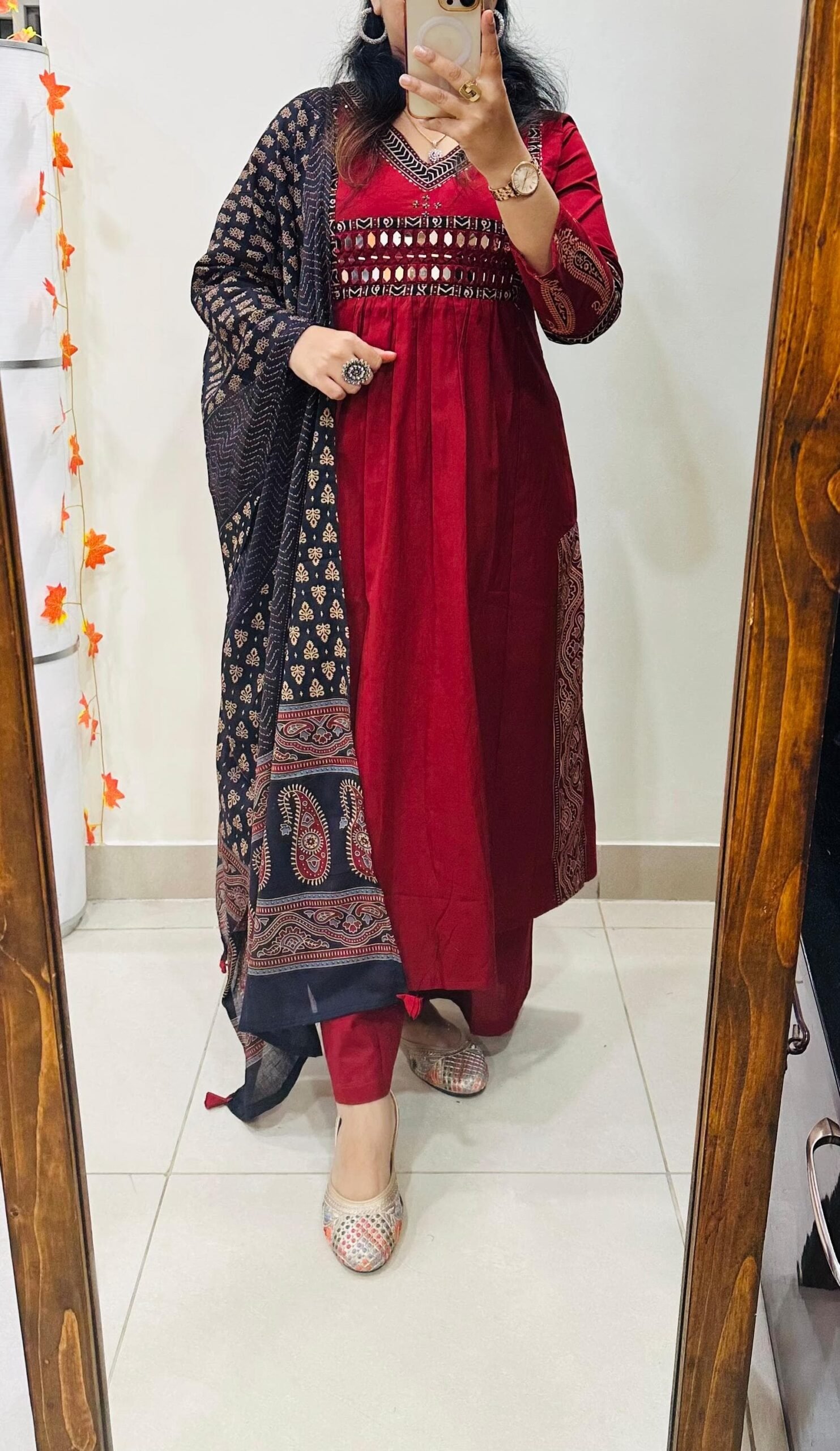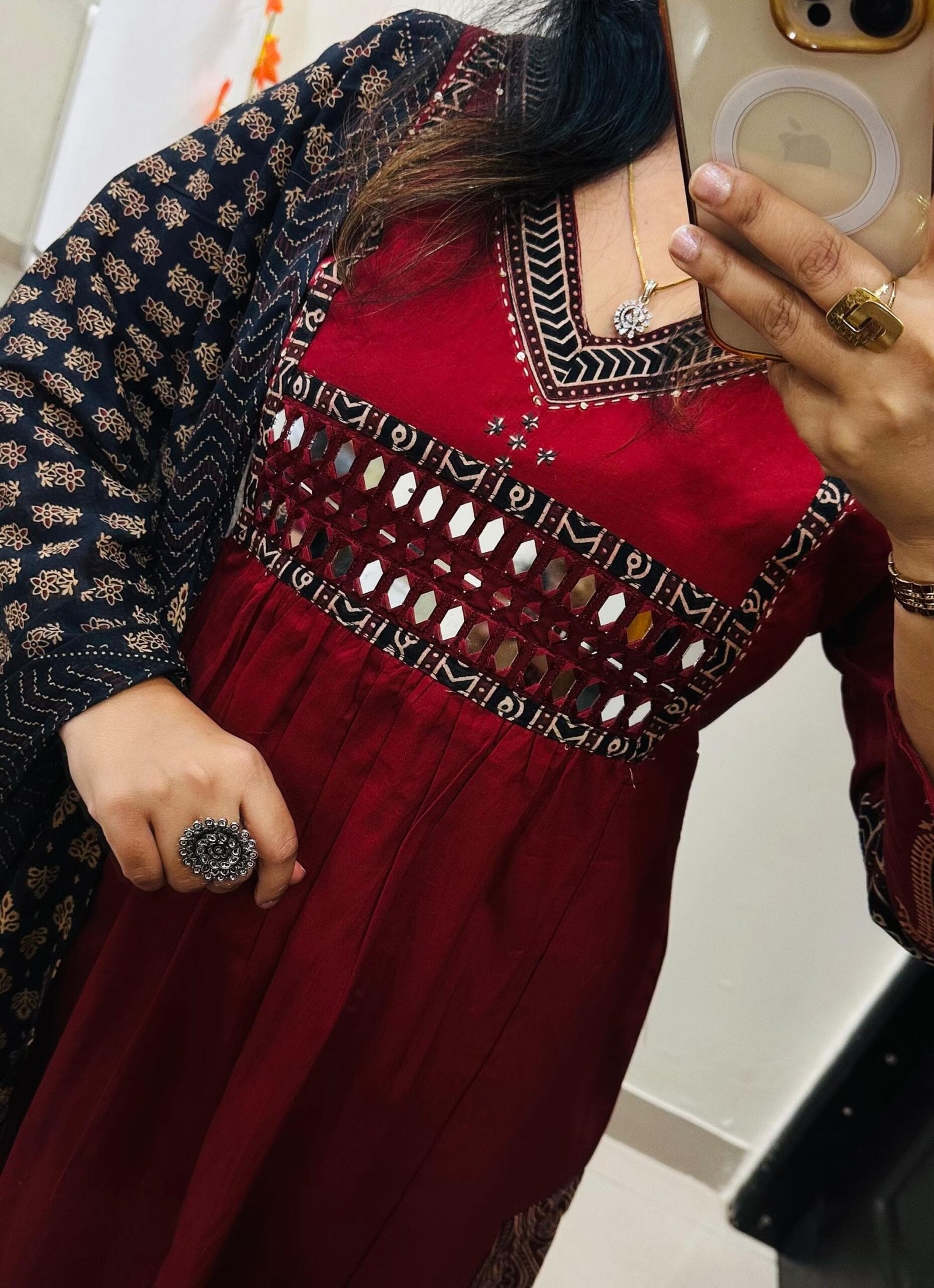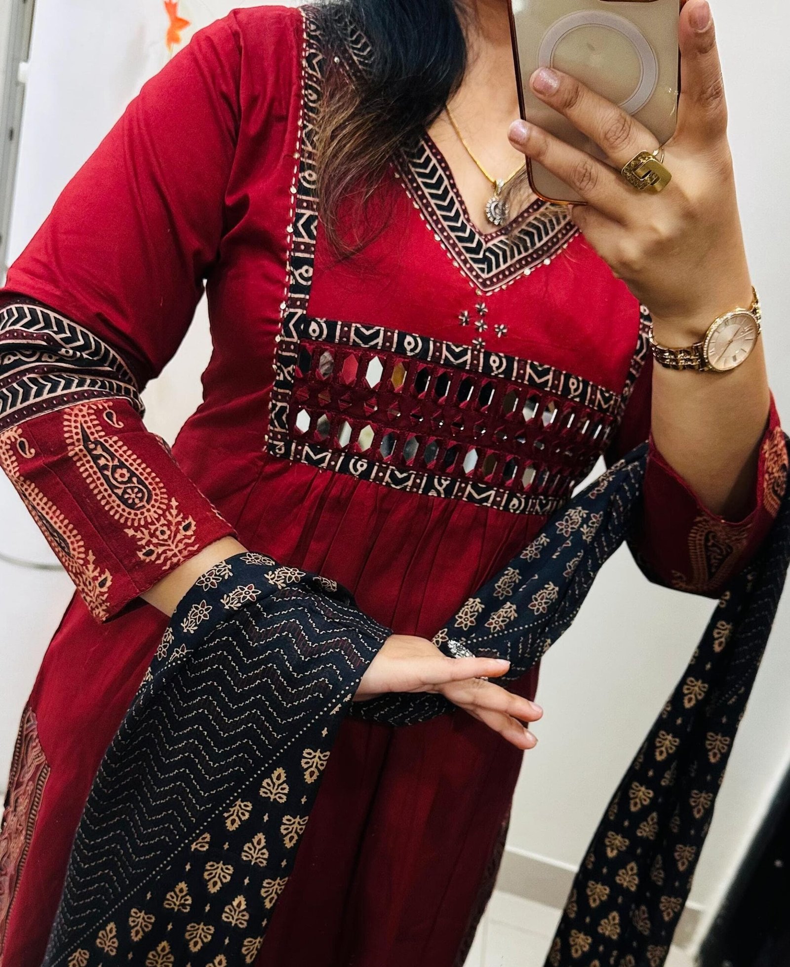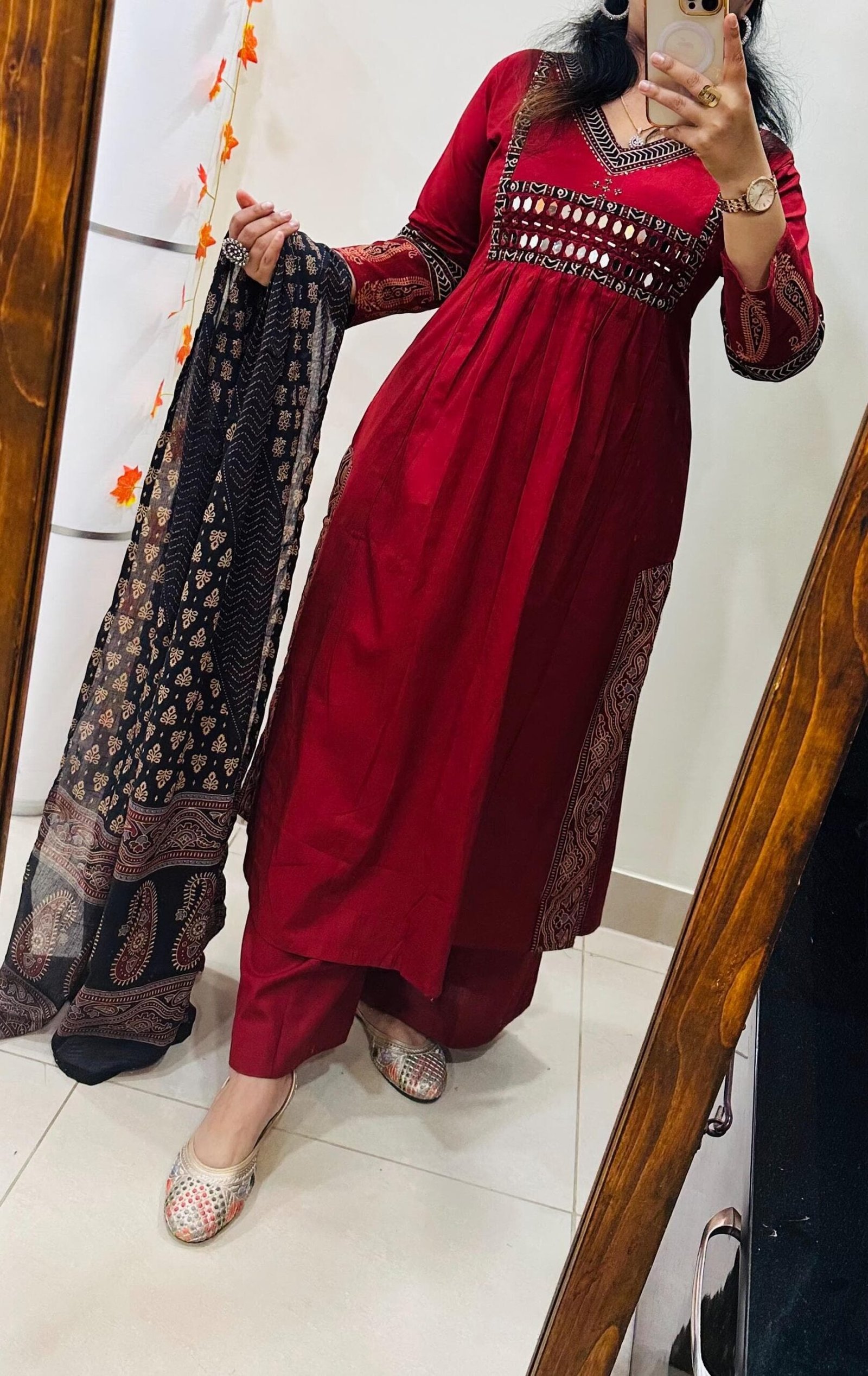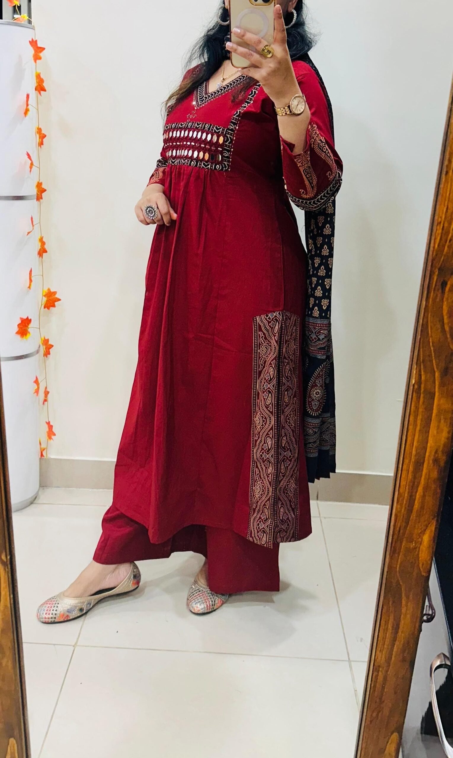 Stylish Designer Kurti Palazzo Dupatta Set in Rich Dhabu cotton fabric with Beautiful azrakh detailing in yoke sleeves and side border of kurti with heavy original mirror work on yoke with thread sequin detailing in neckline paired with fine azrak cotton dupatta… 🎉🎉
