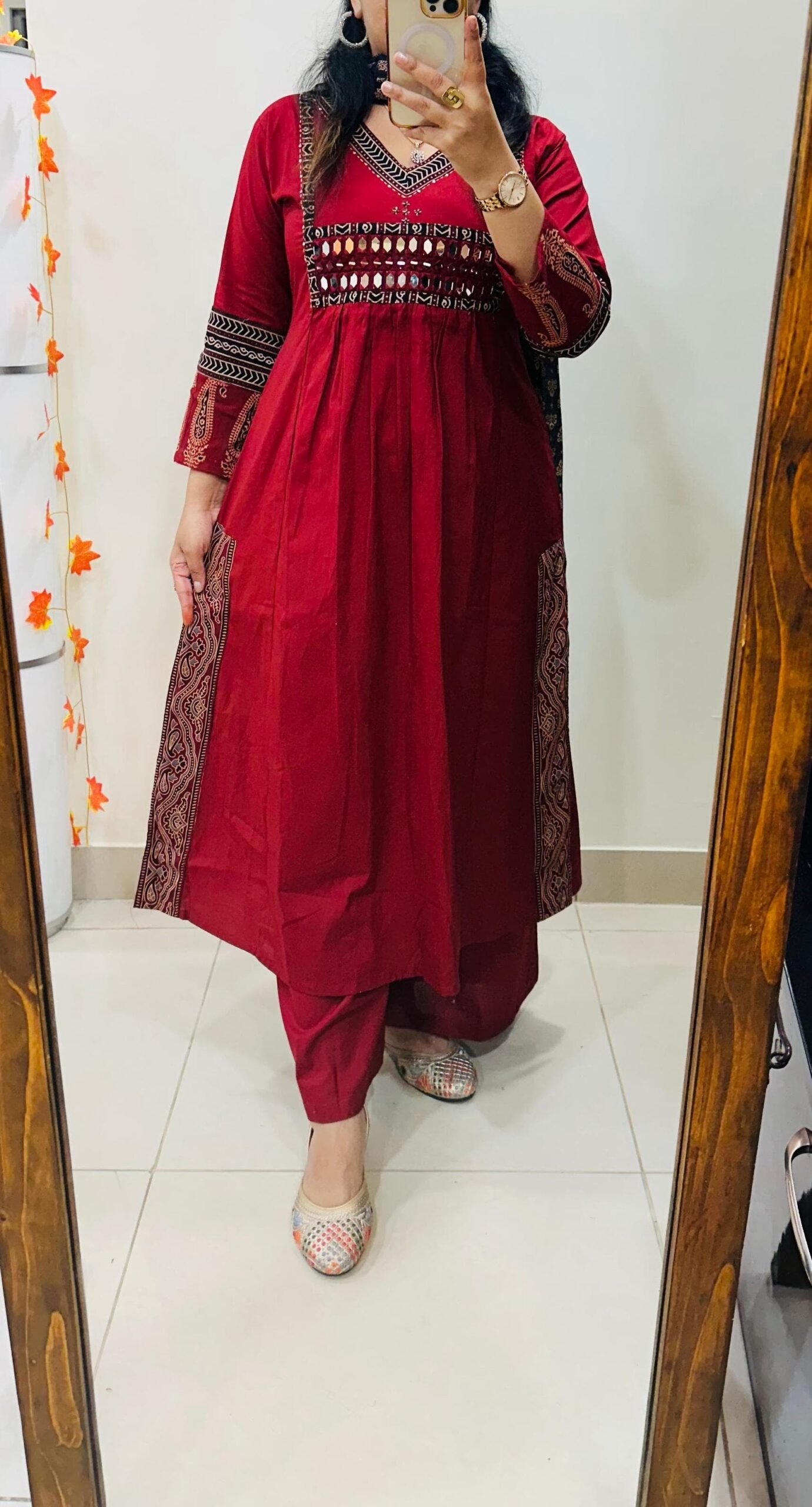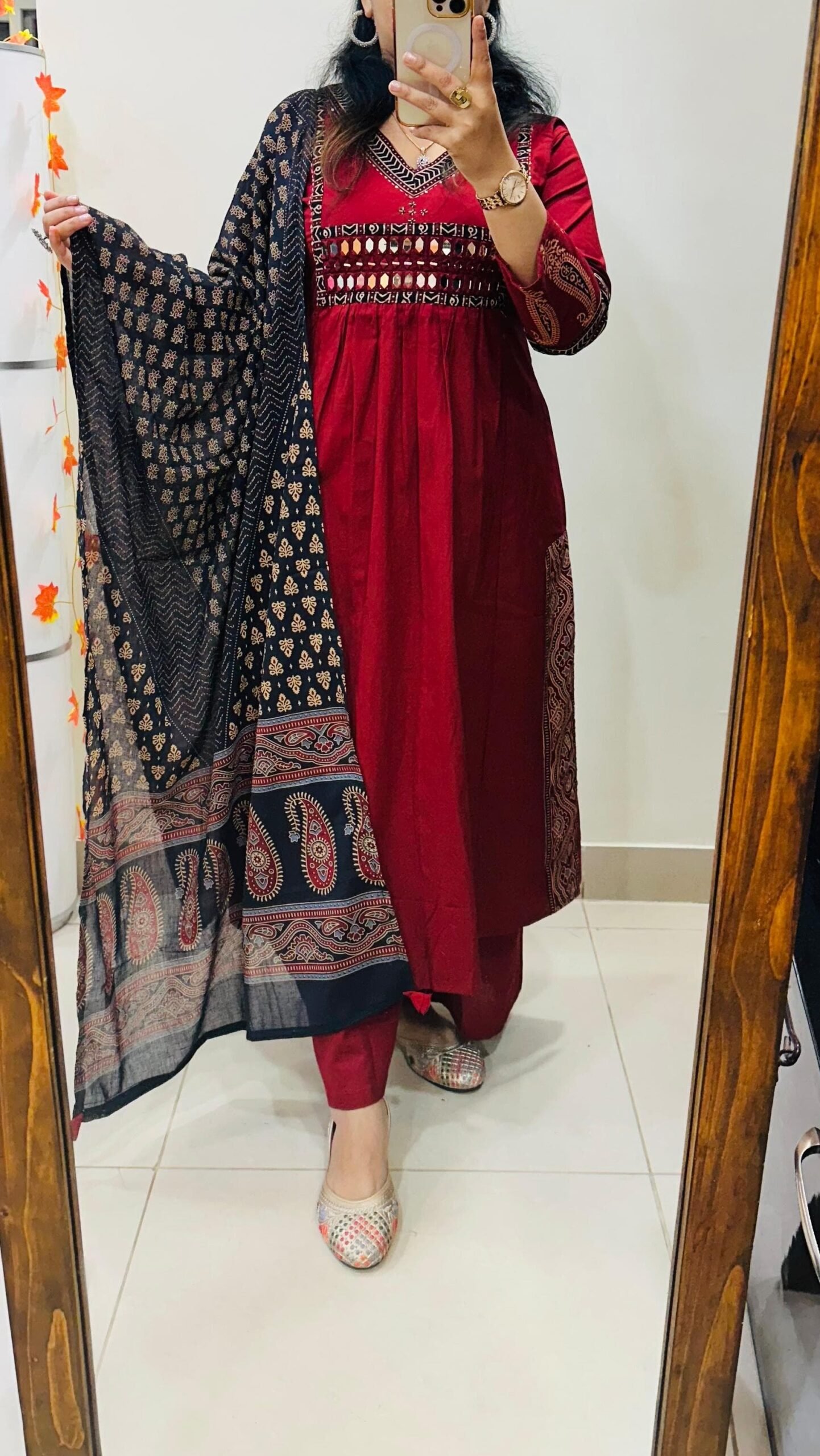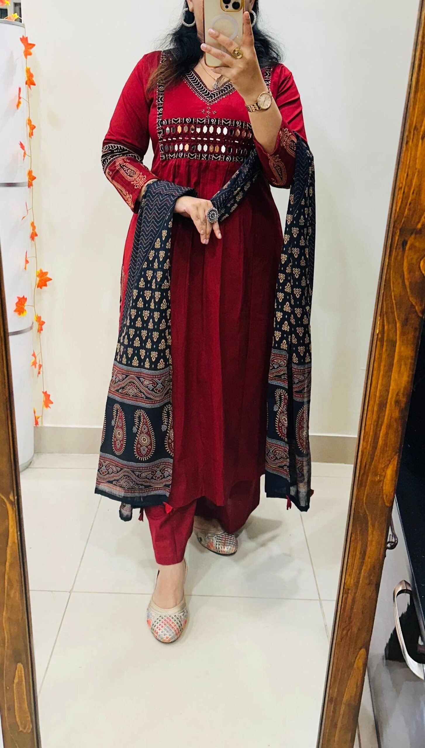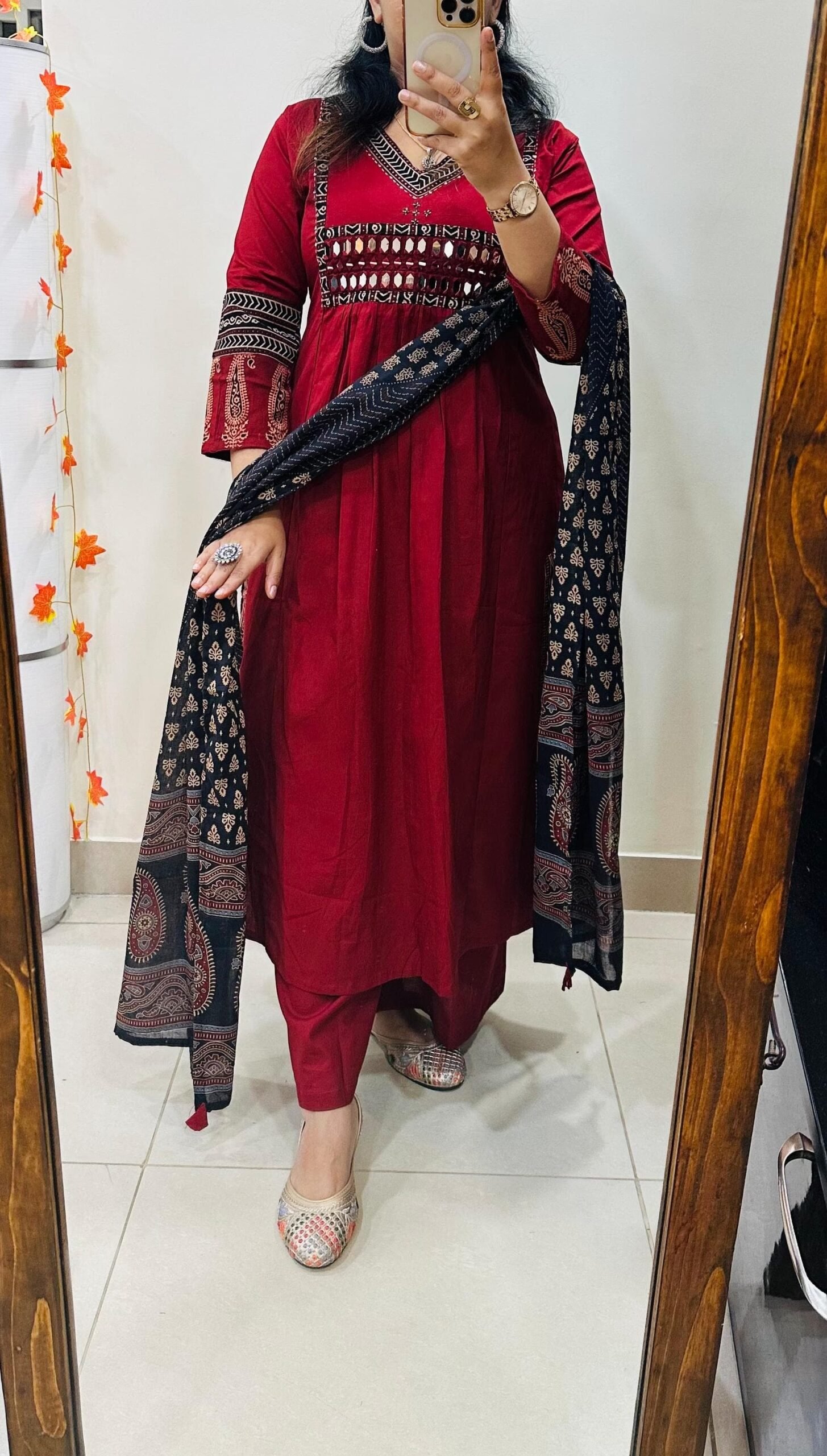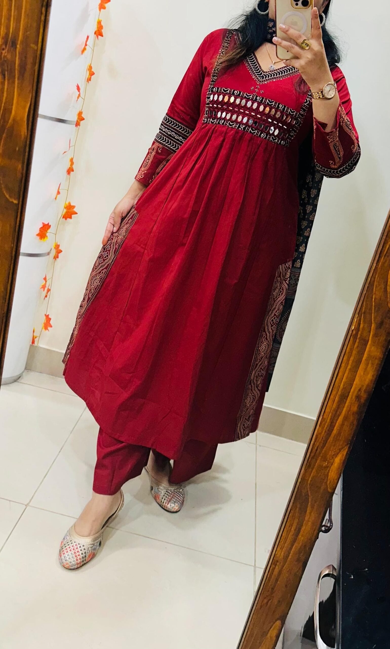 Stylish Designer Kurti Palazzo Dupatta Set in Rich Dhabu cotton fabric with Beautiful azrakh detailing in yoke sleeves and side border of kurti with heavy original mirror work on yoke with thread sequin detailing in neckline paired with fine azrak cotton dupatta… 🎉🎉