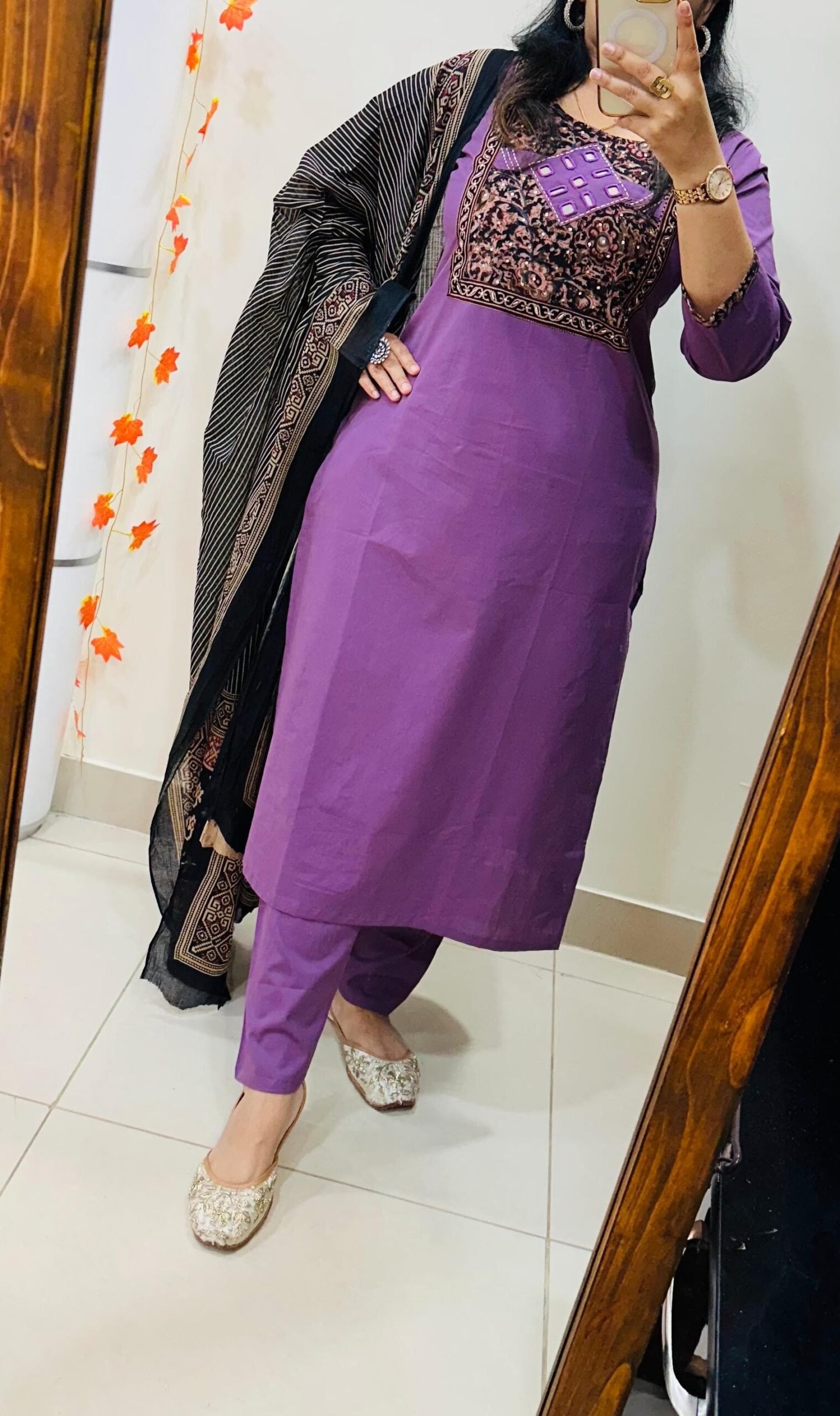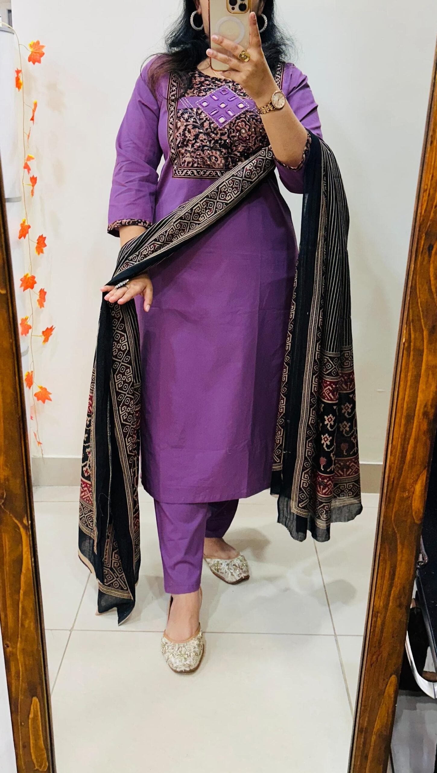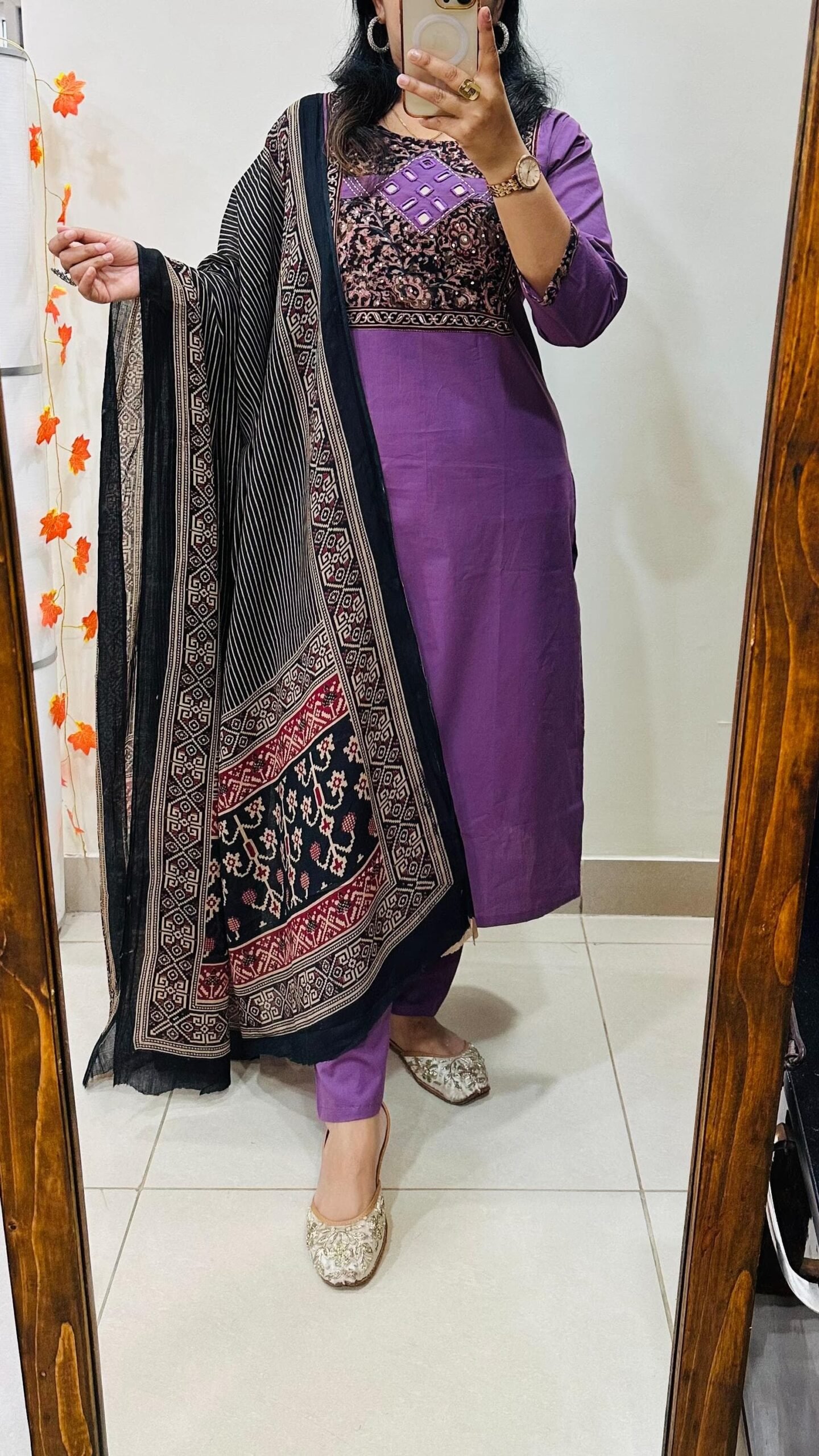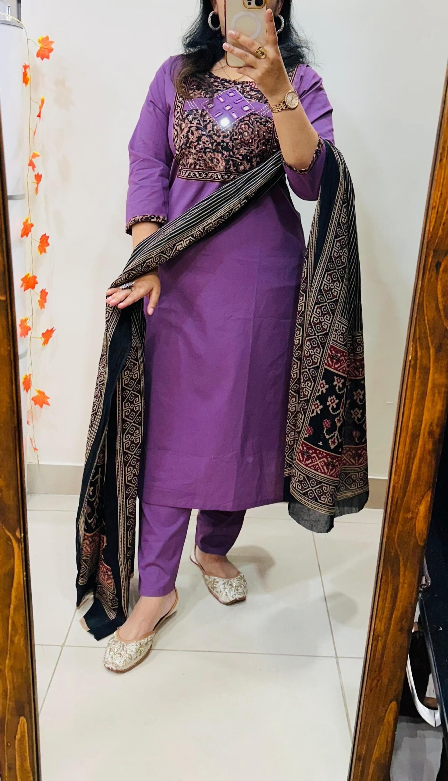 Beautiful kurti pant dupatta set in Premium Dhabu Cotton with beautiful azrakh applique with sequin detailing and real mirror work in yoke with cotton azrakh dupatta