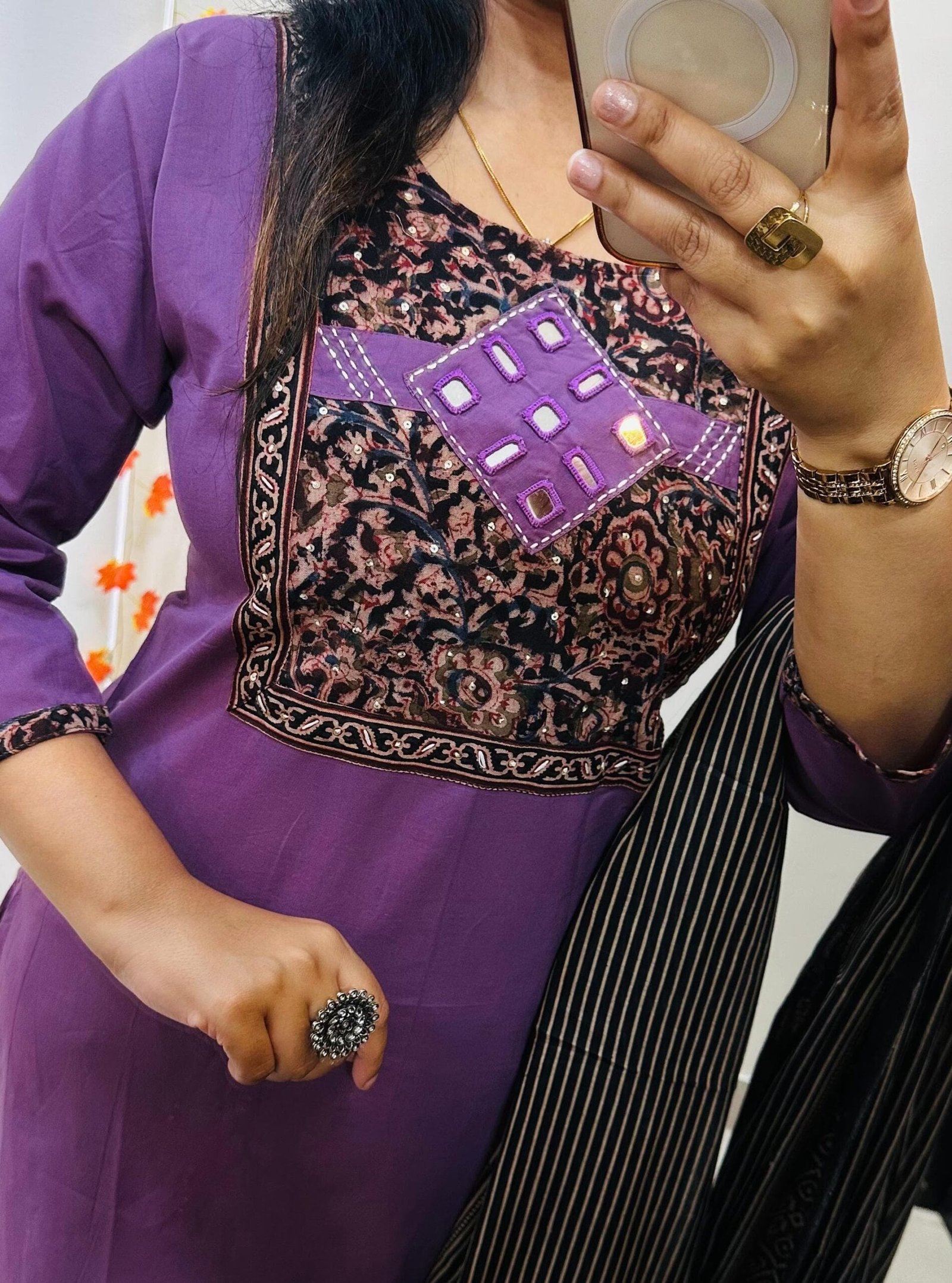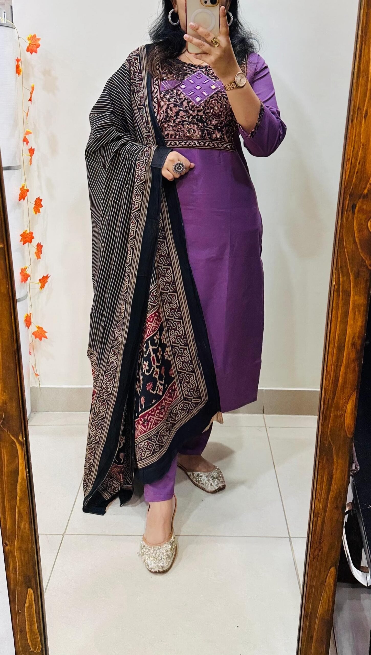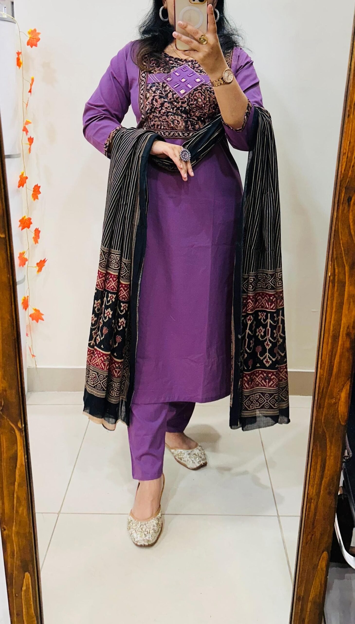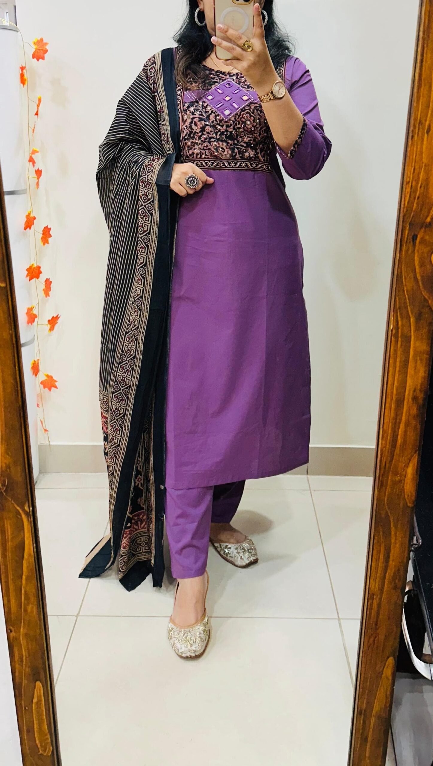 Beautiful kurti pant dupatta set in Premium Dhabu Cotton with beautiful azrakh applique with sequin detailing and real mirror work in yoke with cotton azrakh dupatta
