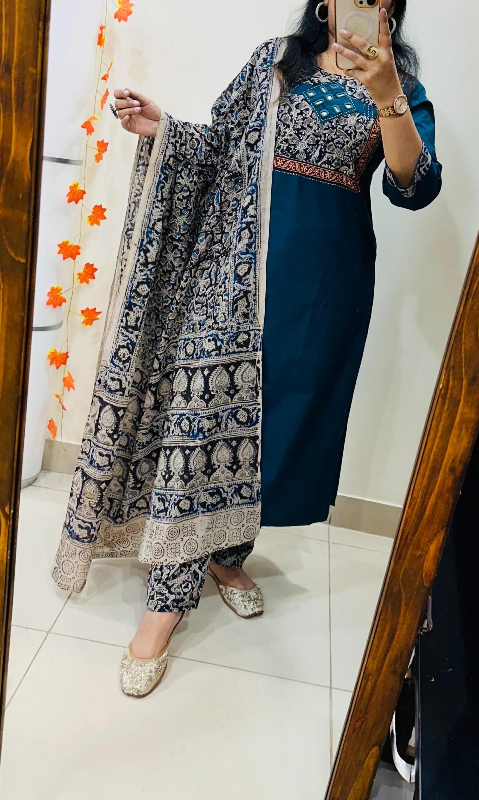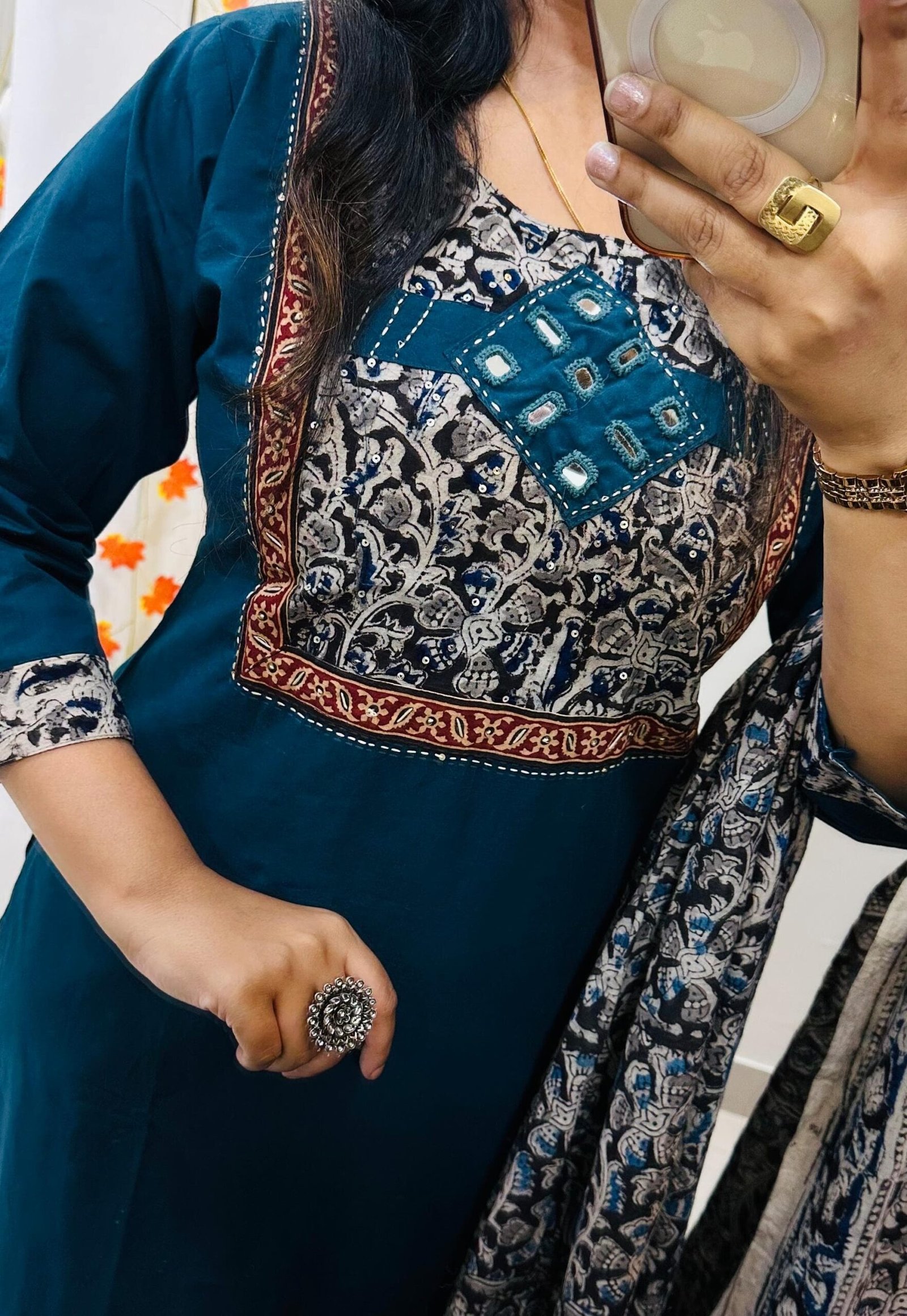 Beautiful kurti Pant dupatta set in Premium Dhabu Cotton in Kalamkari print with real mirror in yoke with kalamkari cotton dupatta