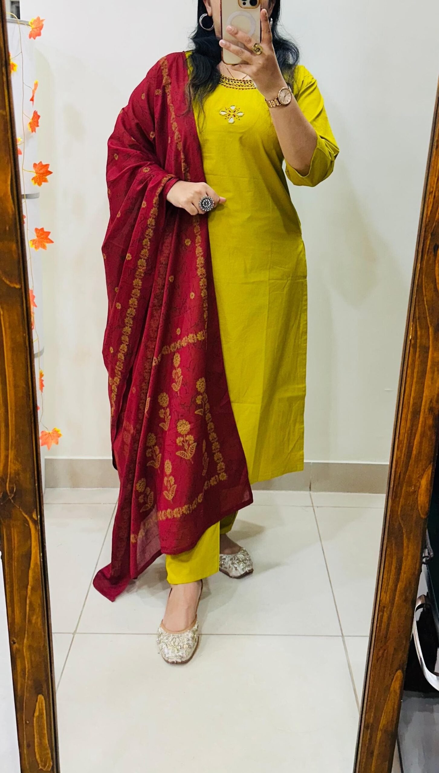 Beautiful kurti Pant dupatta set in Premium Dhabu Cotton with heavy embroidery work in neckline with real mirror in yoke paired with cotton dupatta