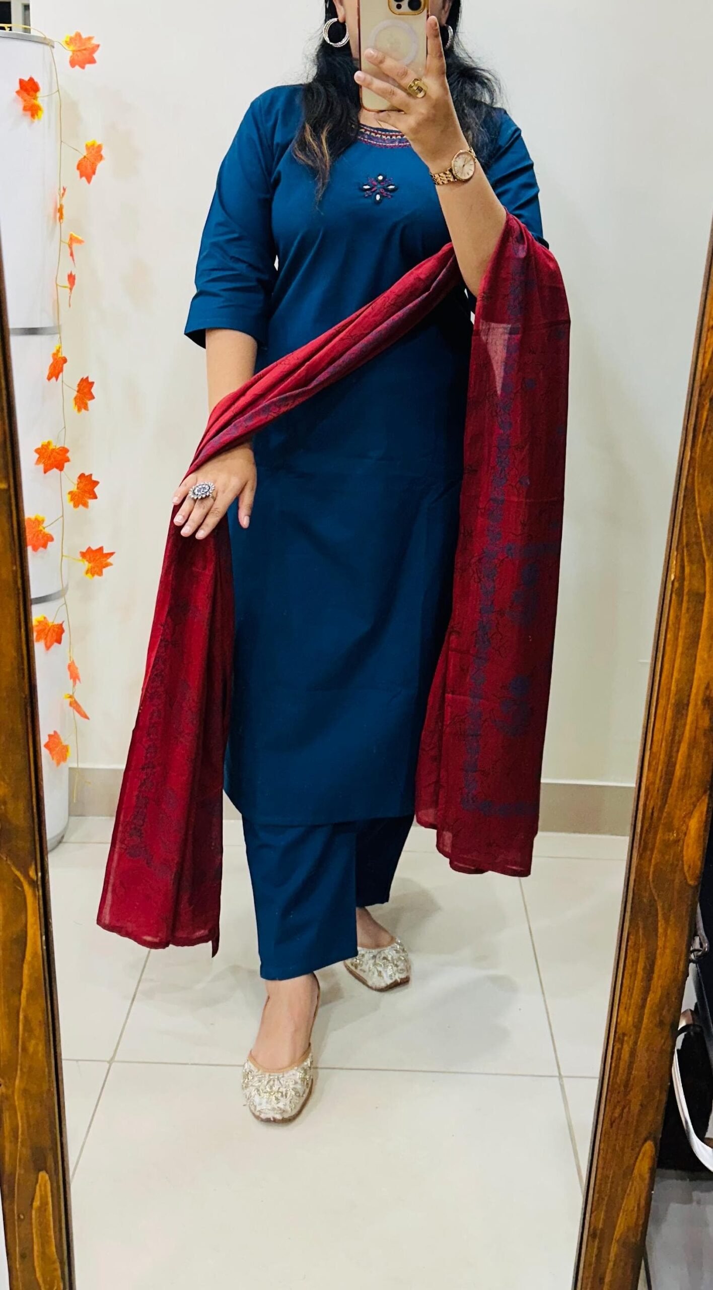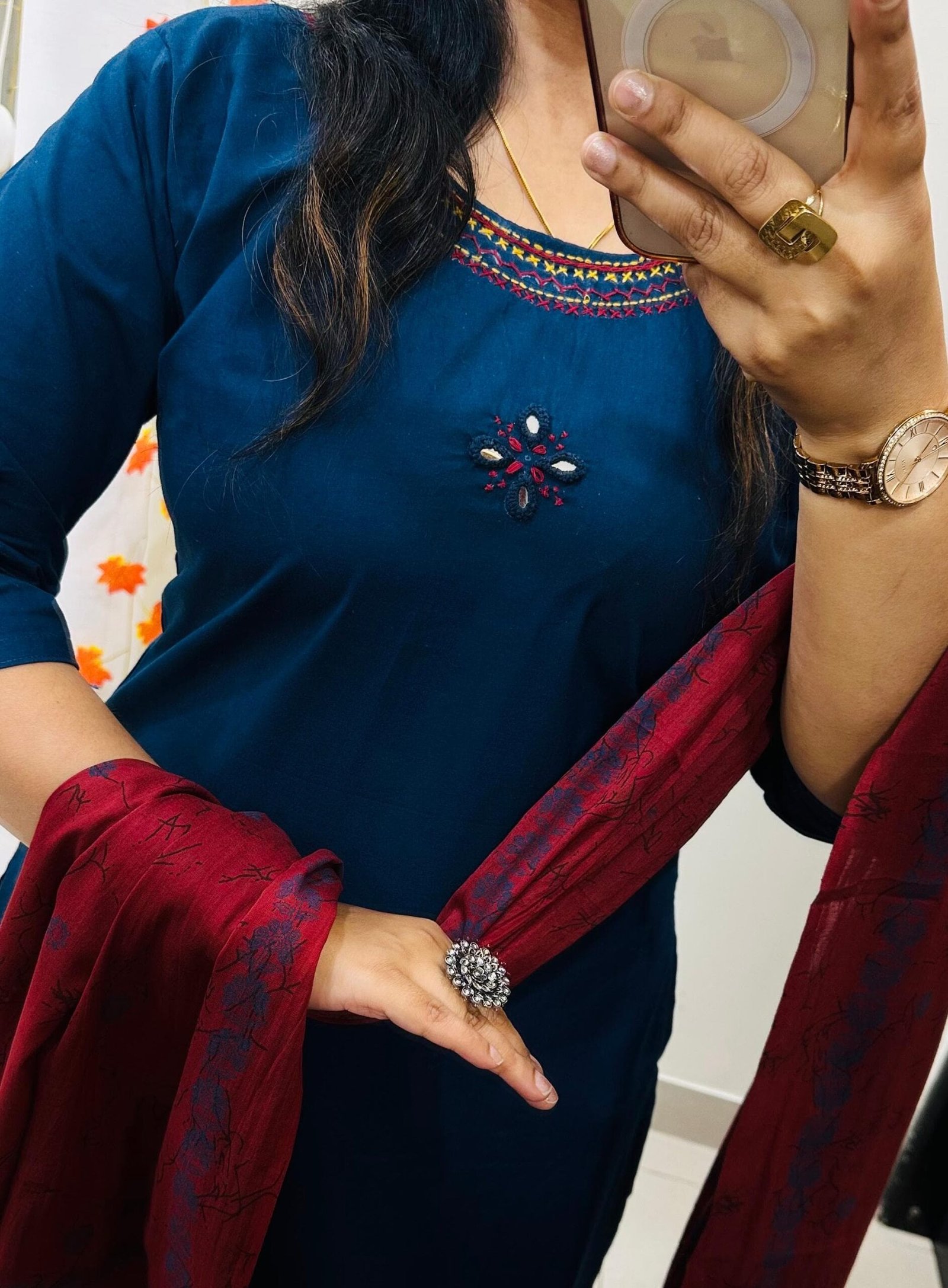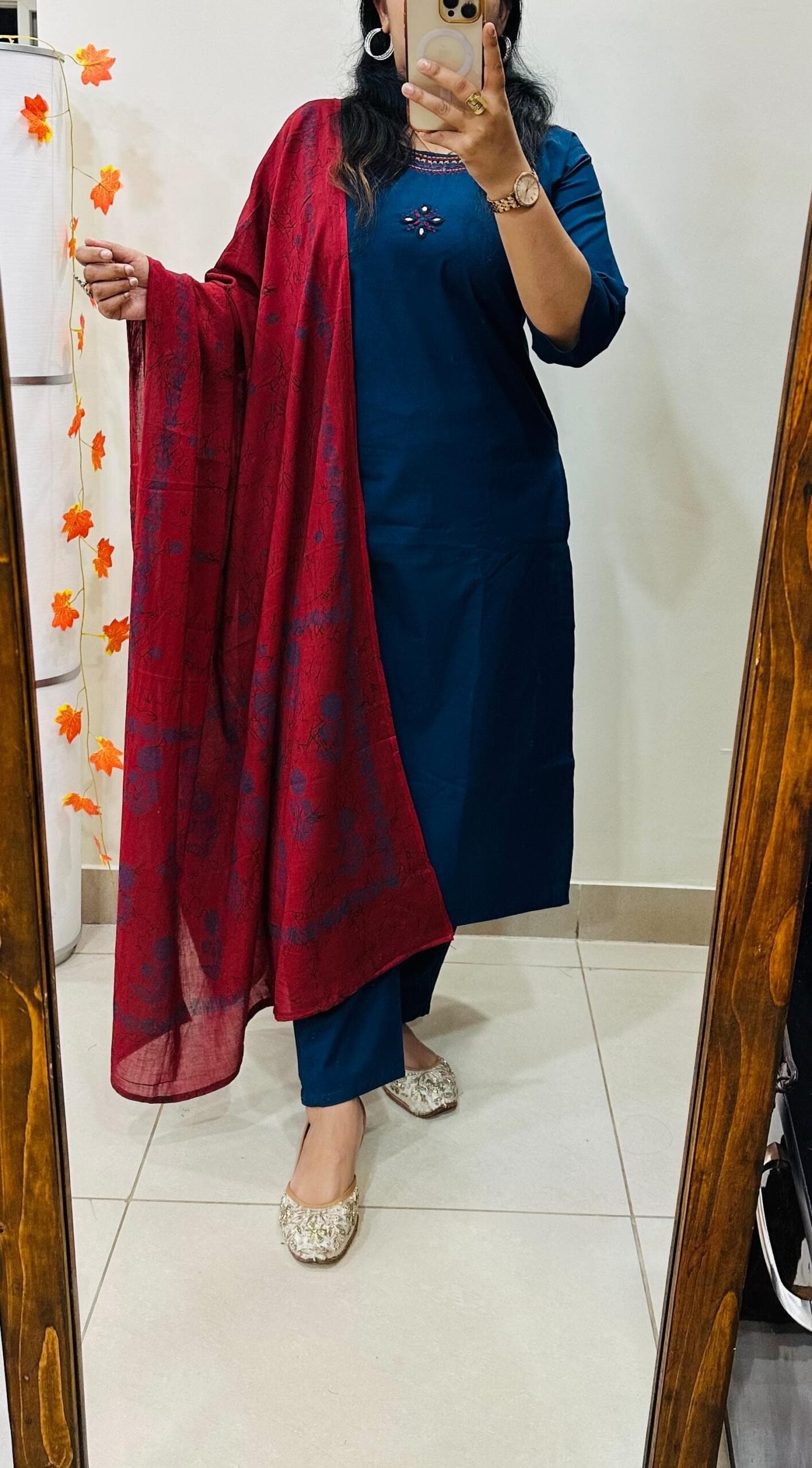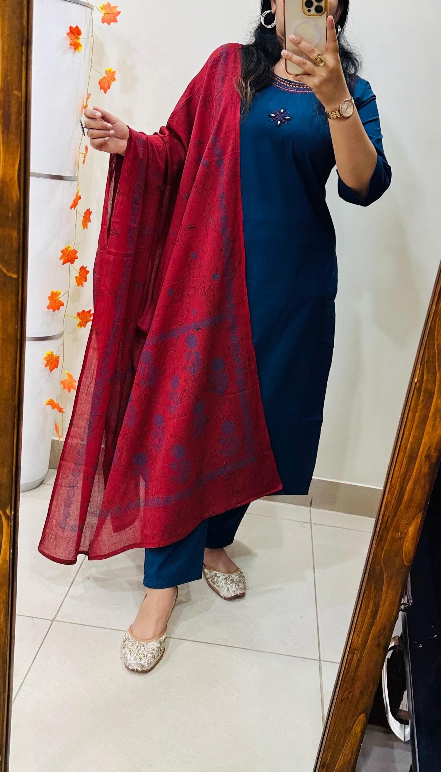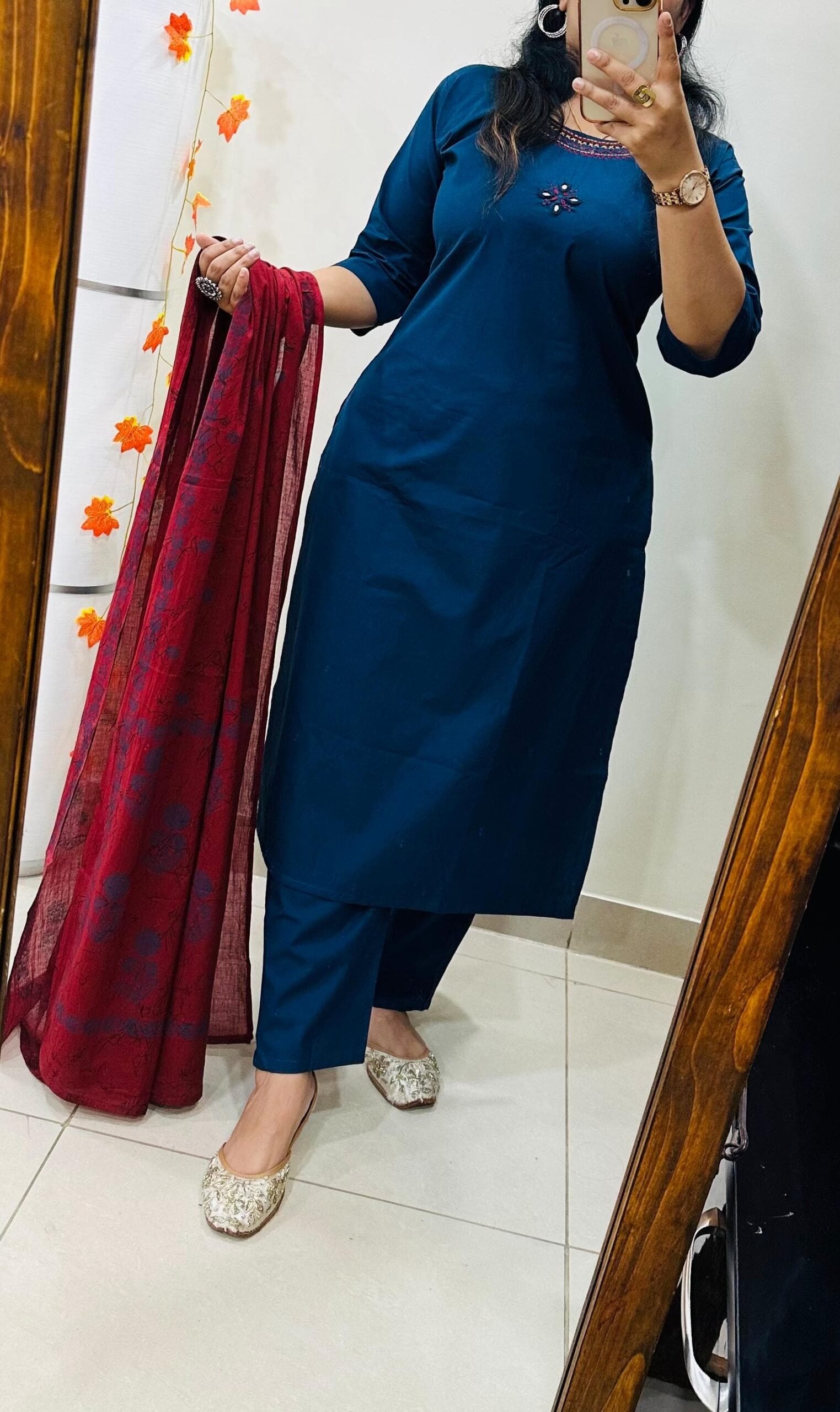 Beautiful kurti Pant dupatta set in Premium Dhabu Cotton with heavy embroidery work in neckline with real mirror in yoke paired with cotton dupatta