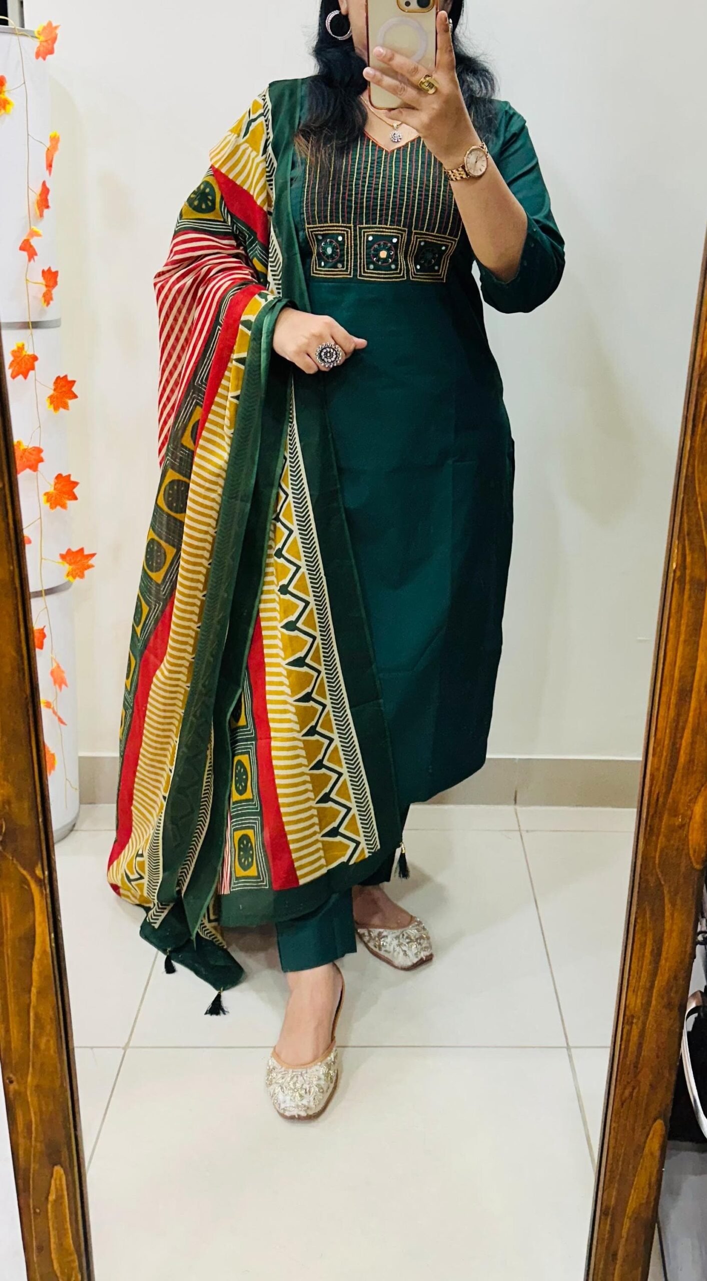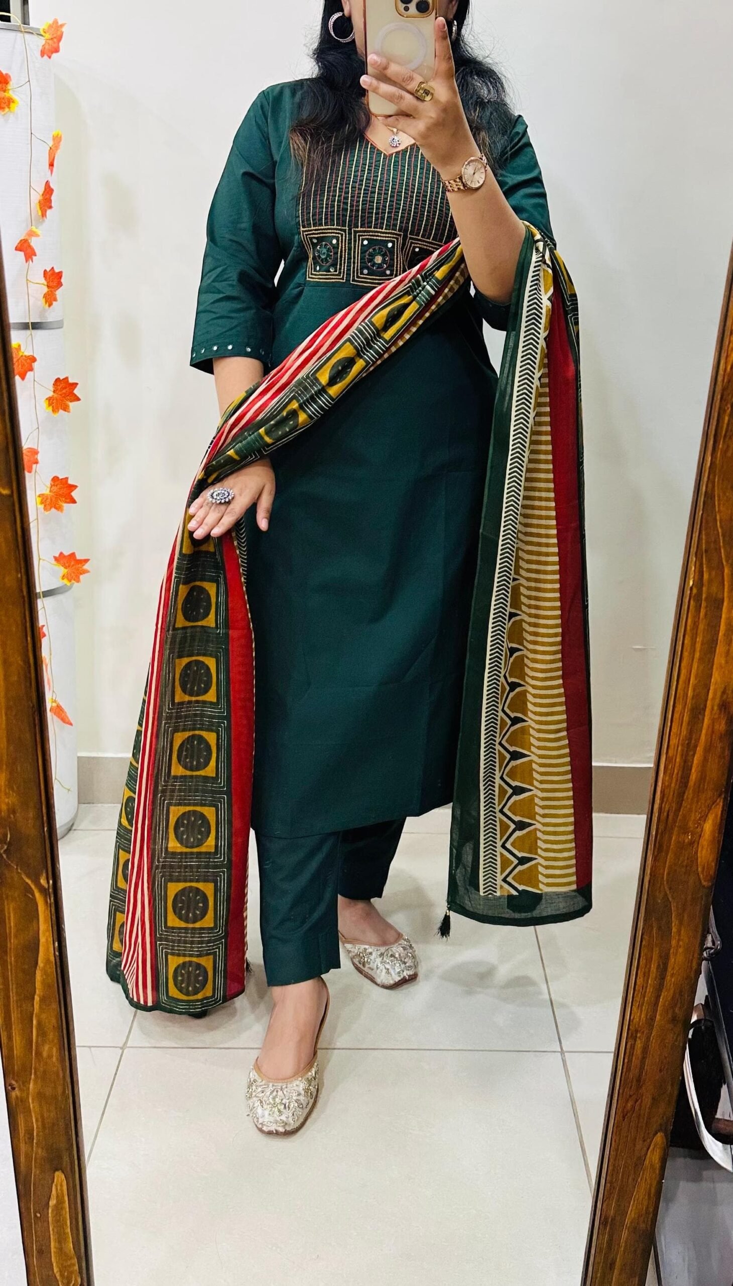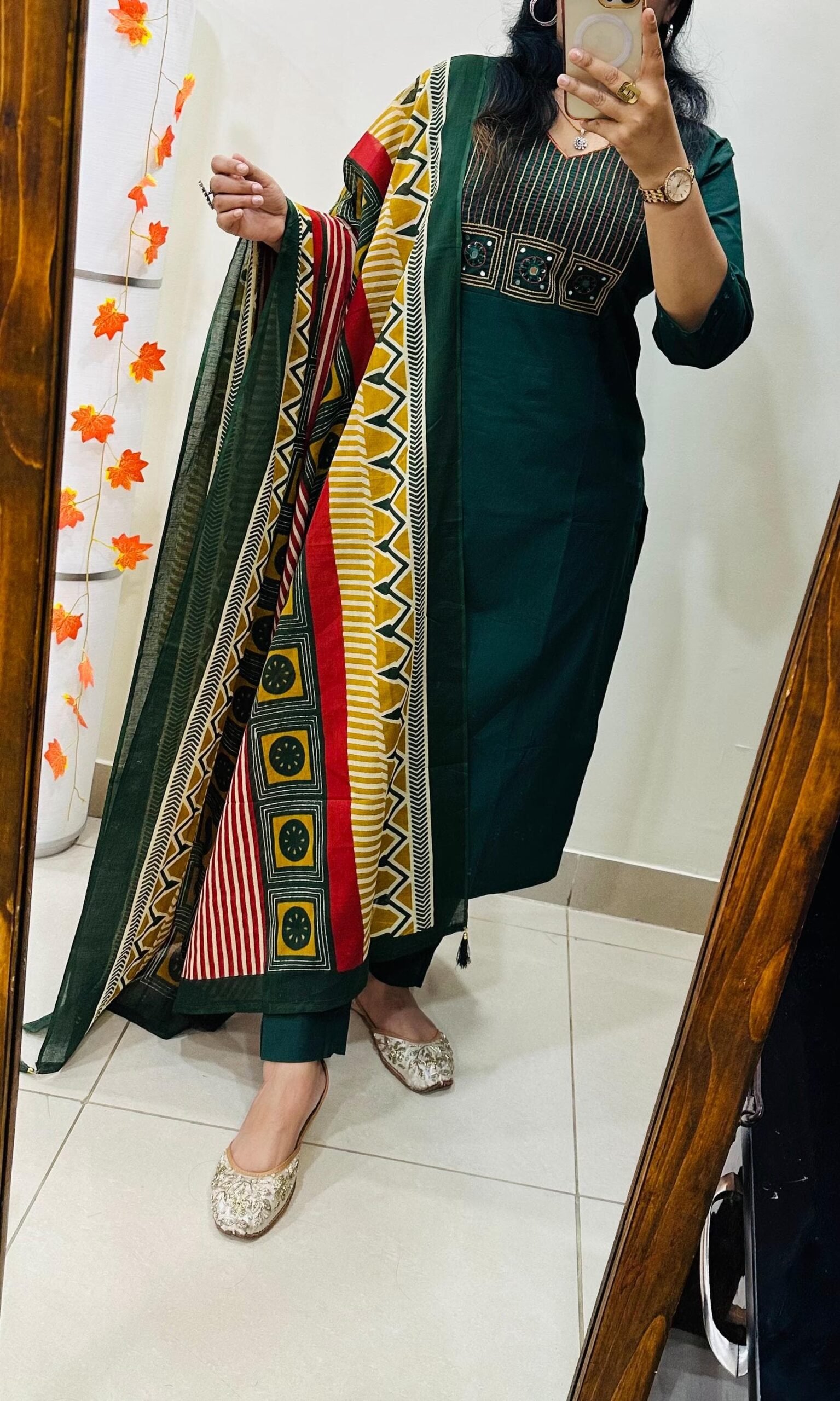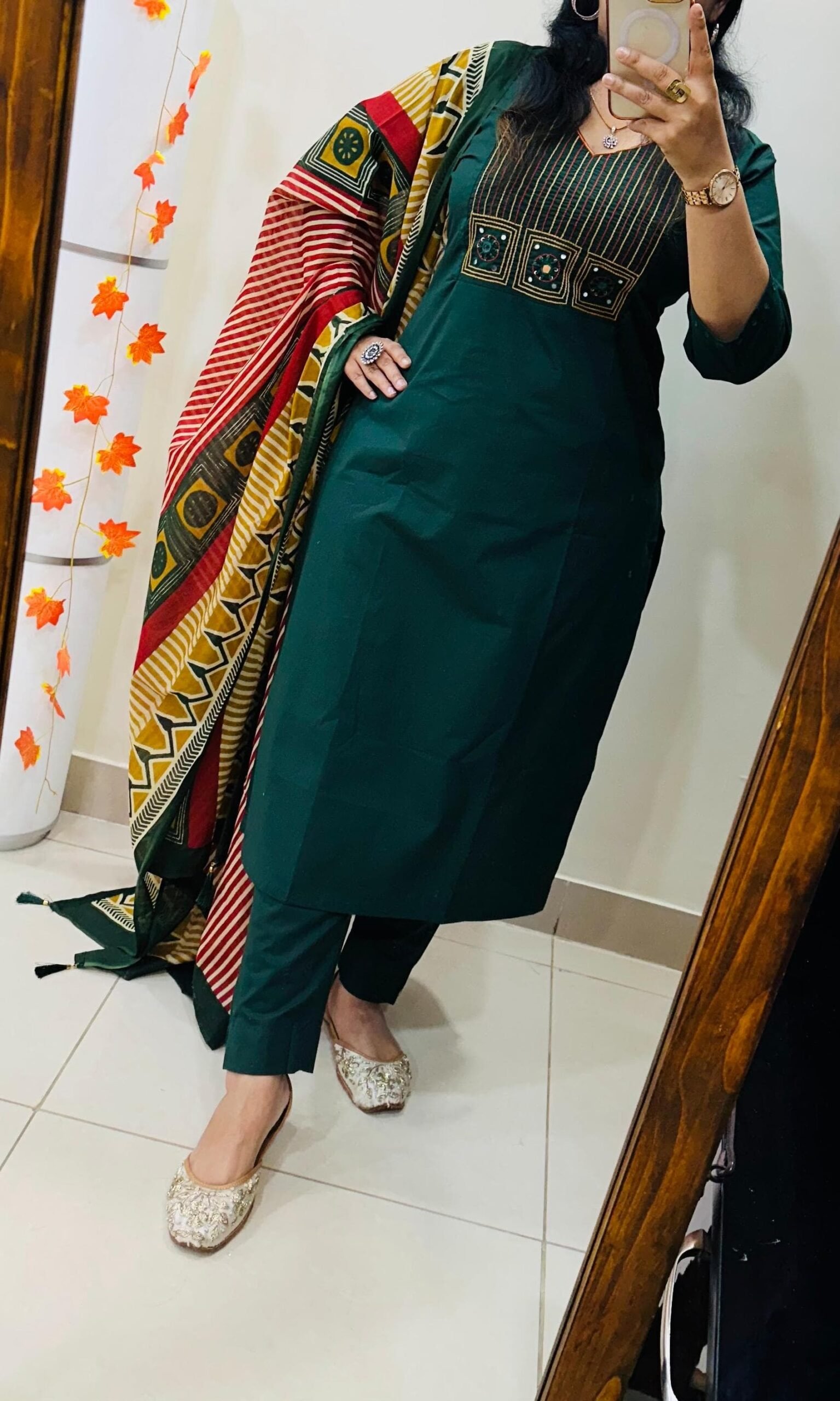 Stylish Ethnic Kurti Pant Set in Rich Cotton with Heavy Embroidery work in yoke with real mirror work paired with cotton duppata with tussels