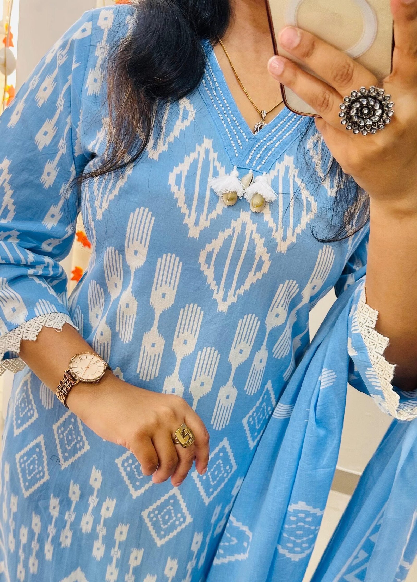 Beautiful Designer kurti pant dupatta set in Premium Fine Cotton with moti detailing in neckline with kodi tussels in yoke…
