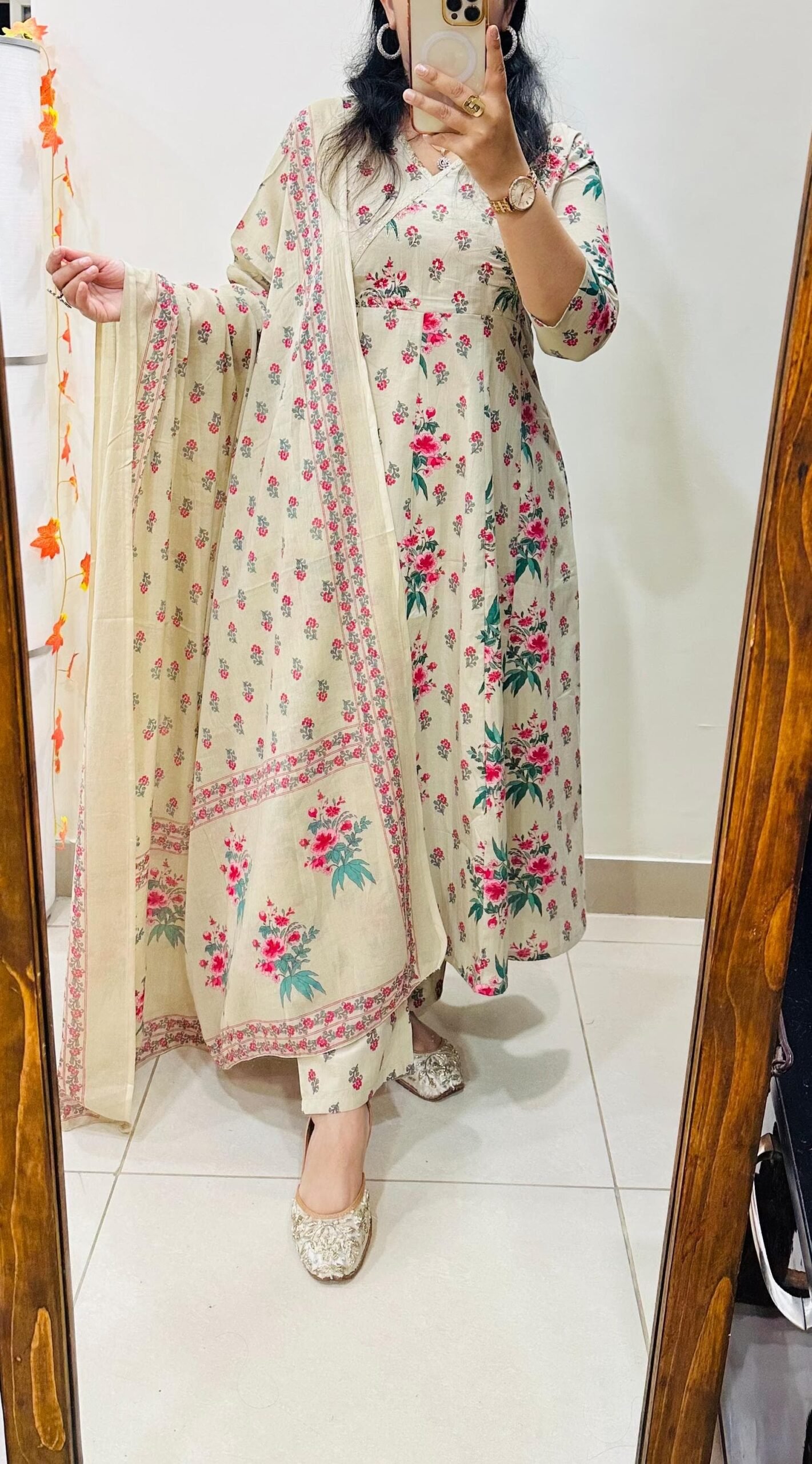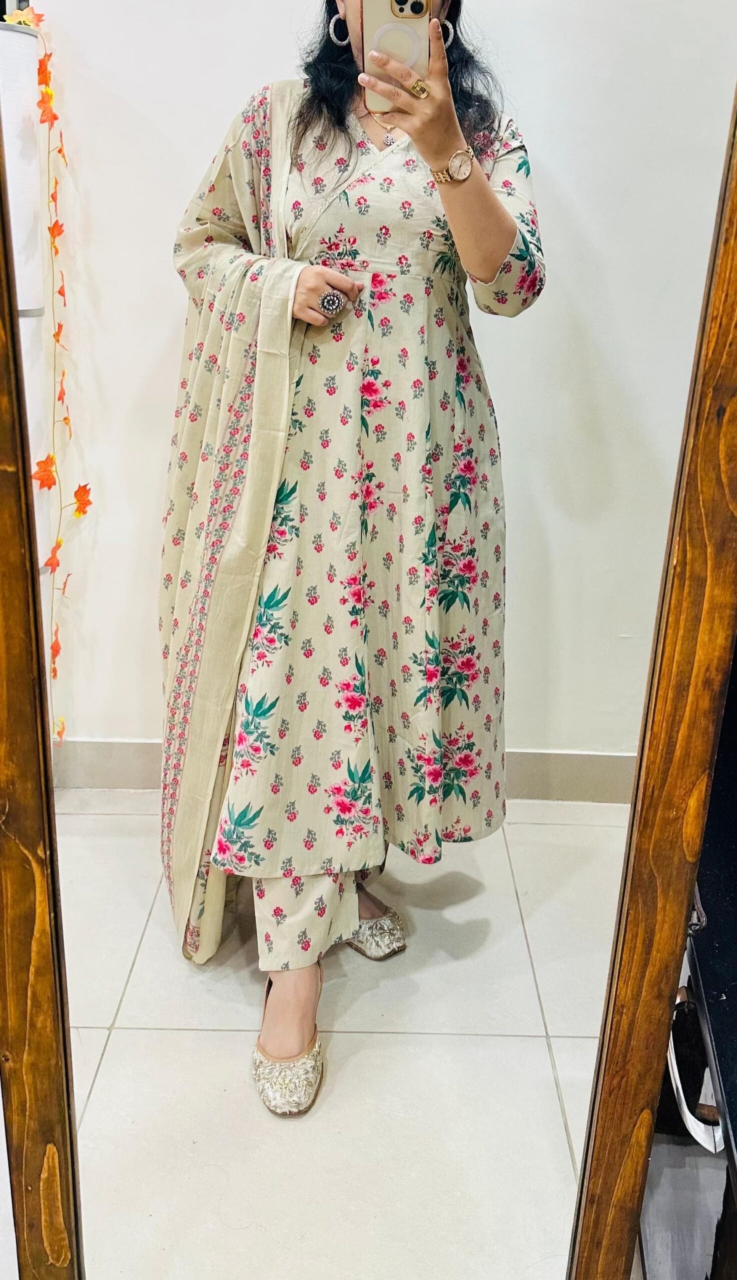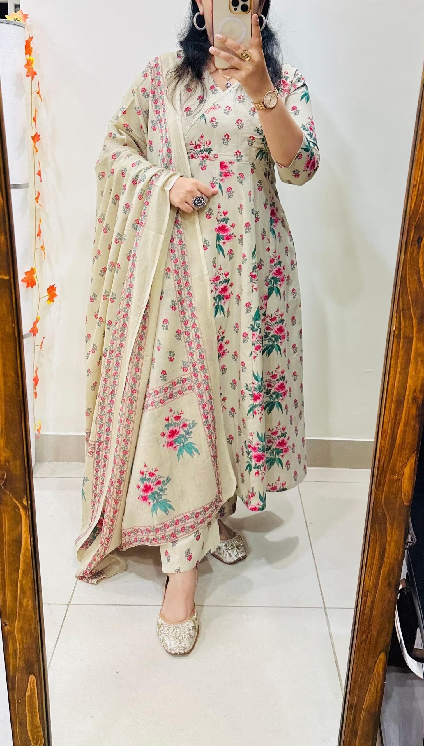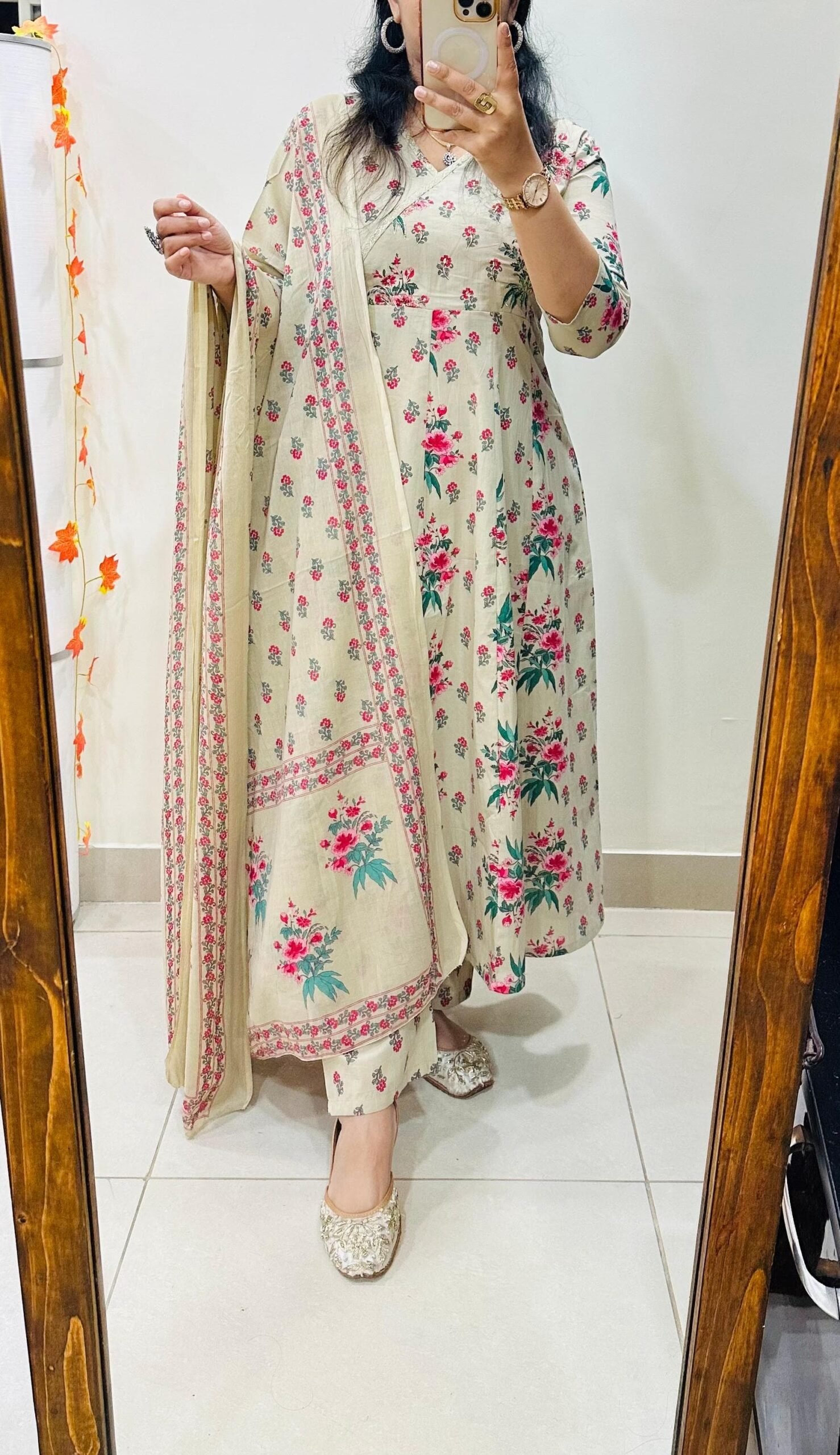 Designer Mughal Theme in Idaho style Floral Kali Kurti Pant dupatta set in Premium fine Cotton Fabric with badla adda work on yoke and side fashion tassels giving gorgeous look… 💥💥