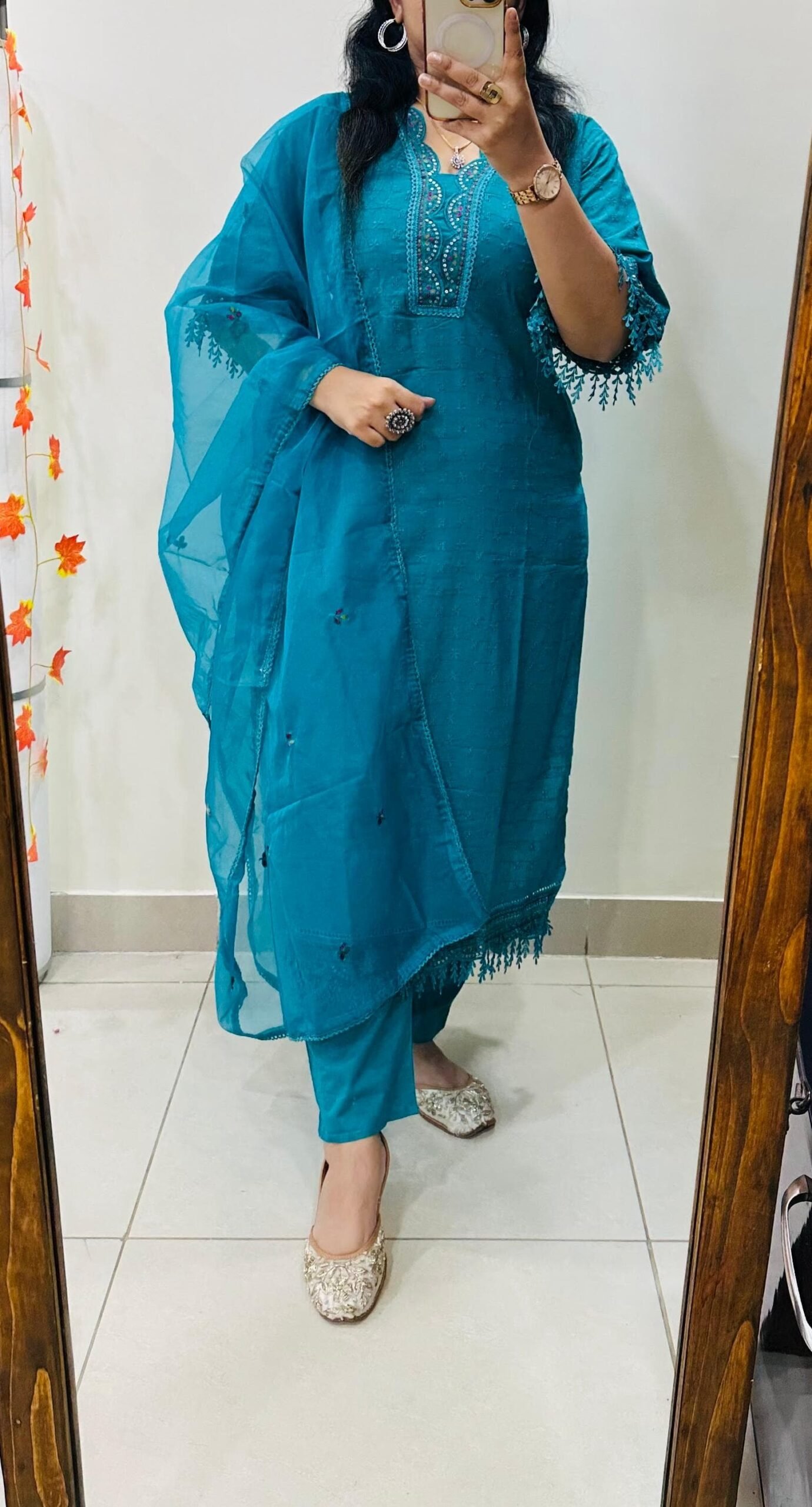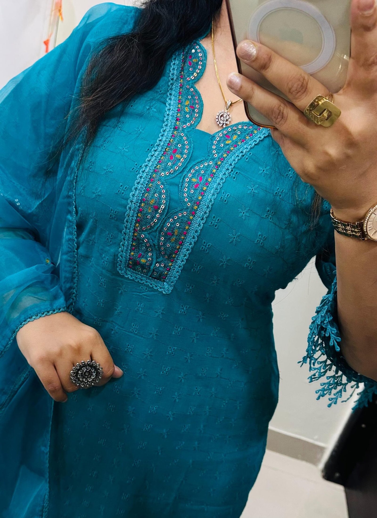 Beautiful Schiffli Kurti Pant dupatta set in Premium fine Cotton Fabric with heavy embroidery work in yoke sleeves and bottom of kurti with designer bell sleeves with organza duppata giving heavy gorgeous look to the outfit..