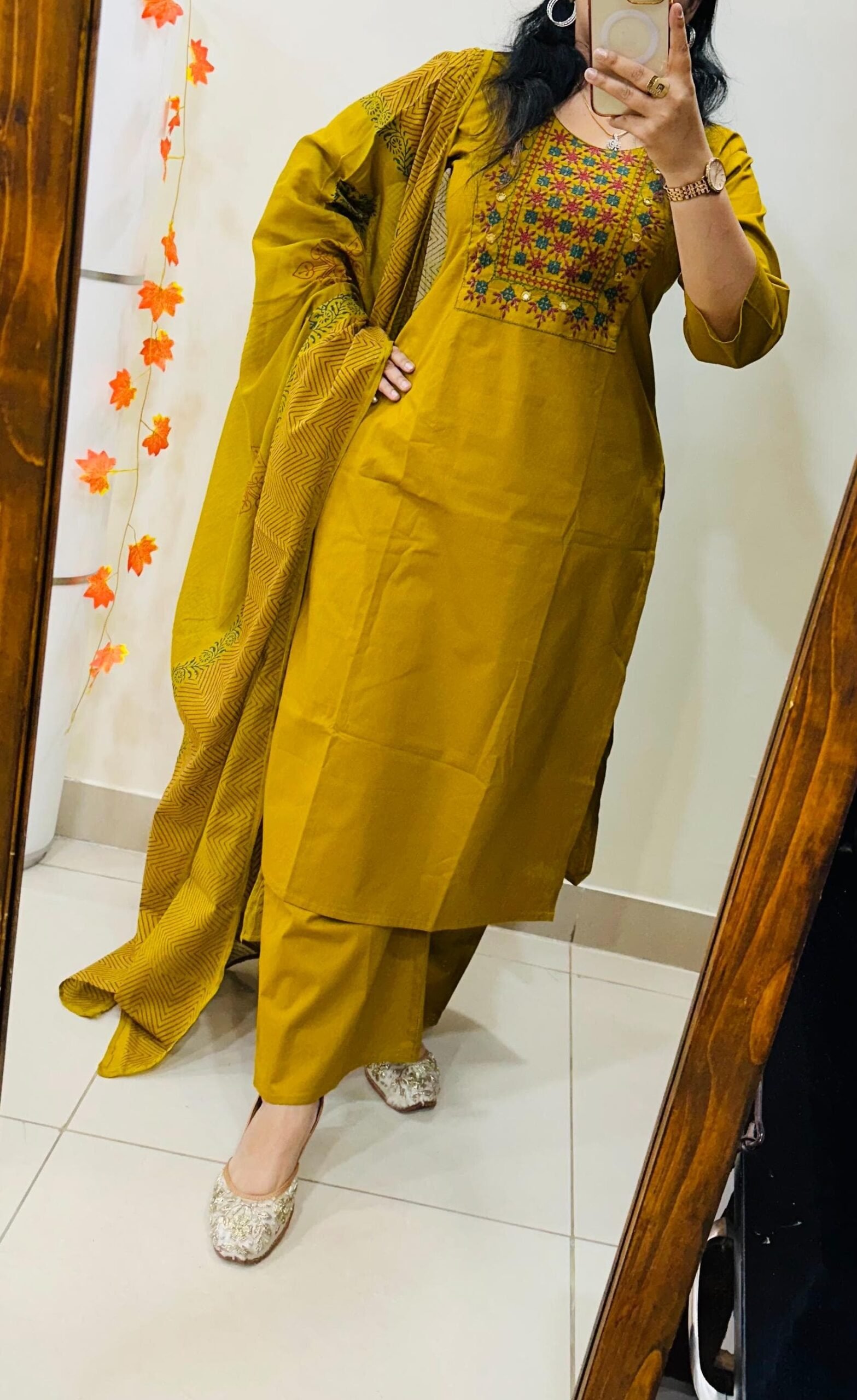 Beautiful kurti Pant dupatta set in Premium Dhabu Cotton with heavy kutch embroidery work in yoke with real mirror paired with cotton dupatta