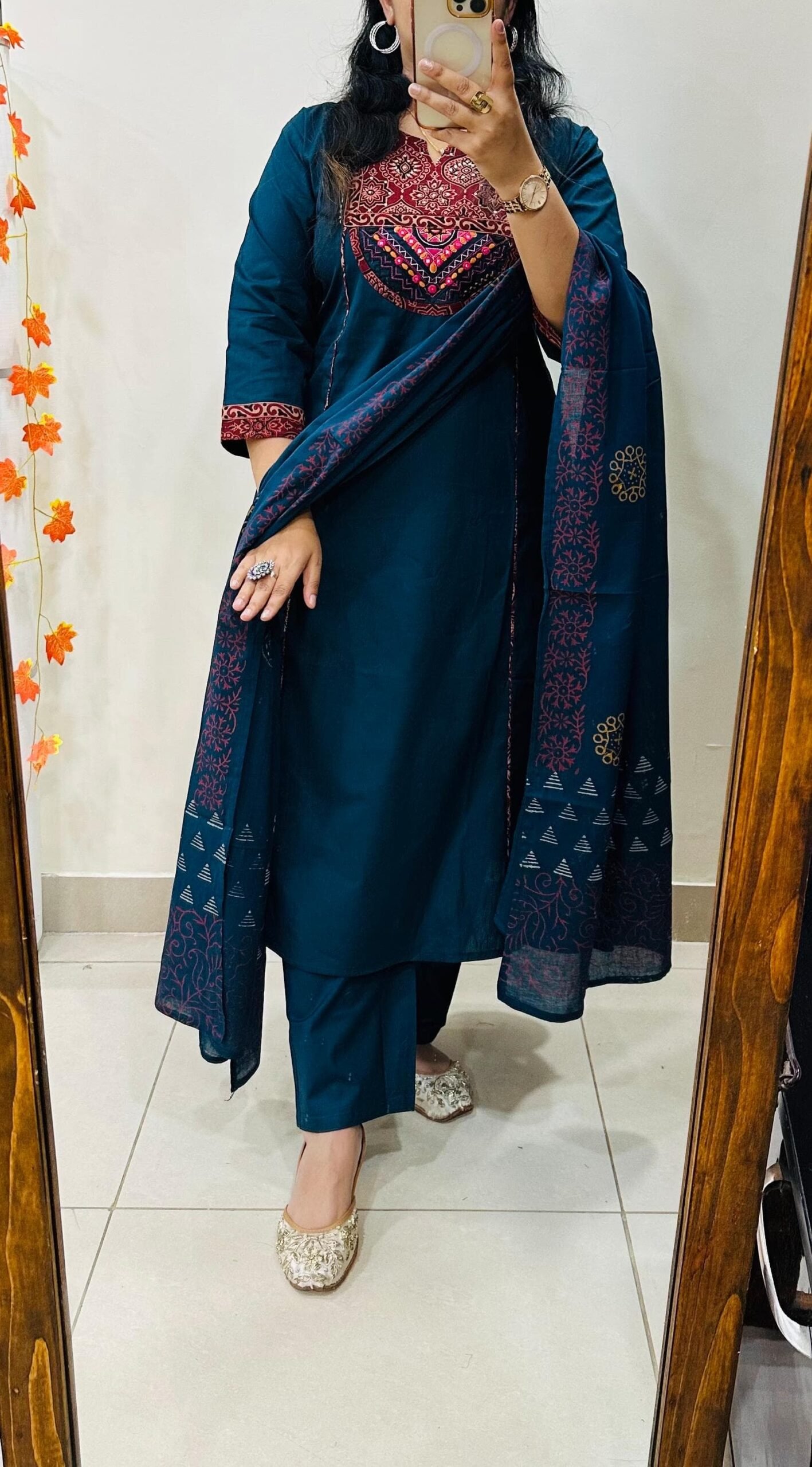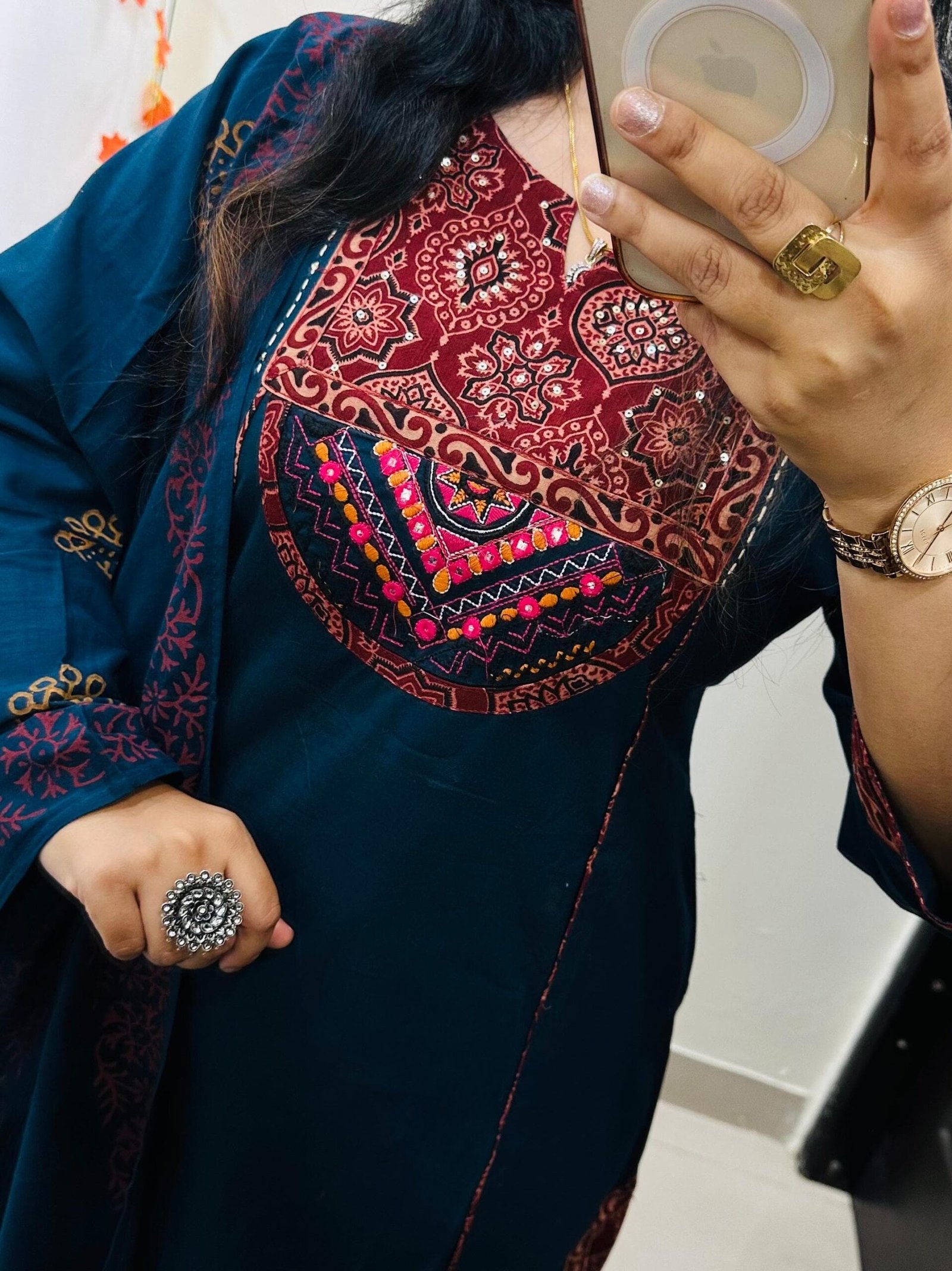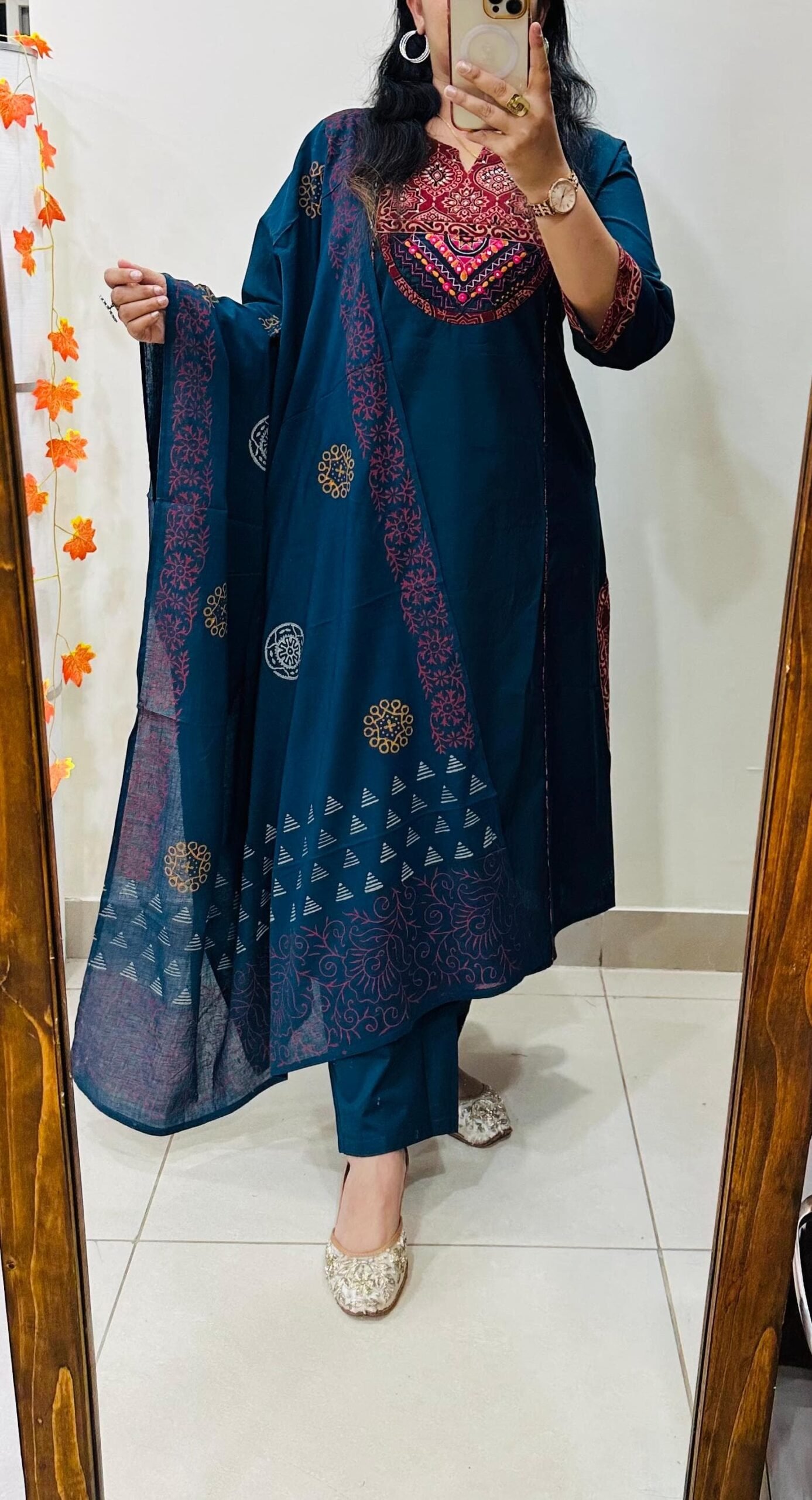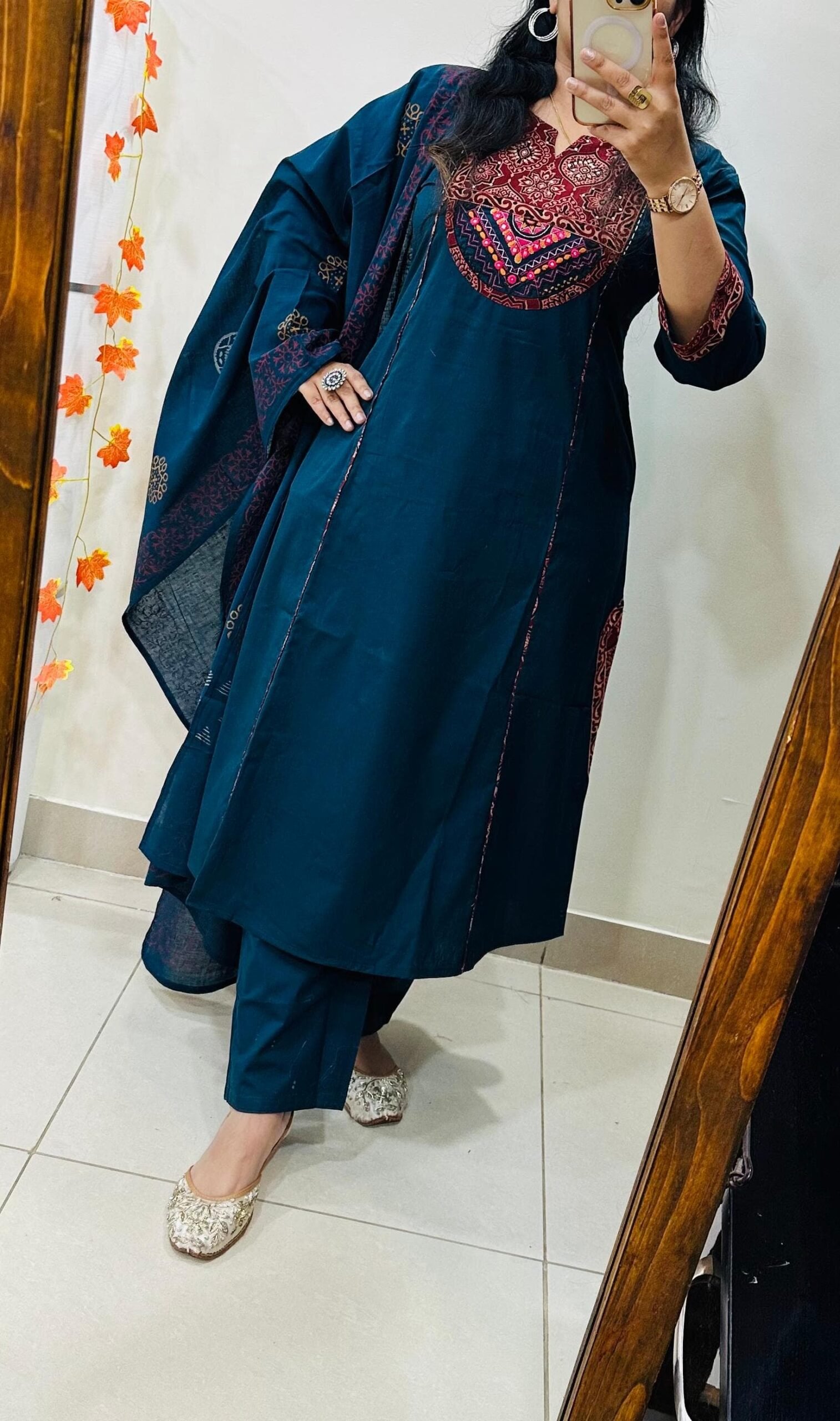 Beautiful kurti Pant dupatta set in Premium Dhabu Cotton with azrakh patch and heavy kutch embroidery work in yoke and also back side with sequin detailing paired with cotton dupatta