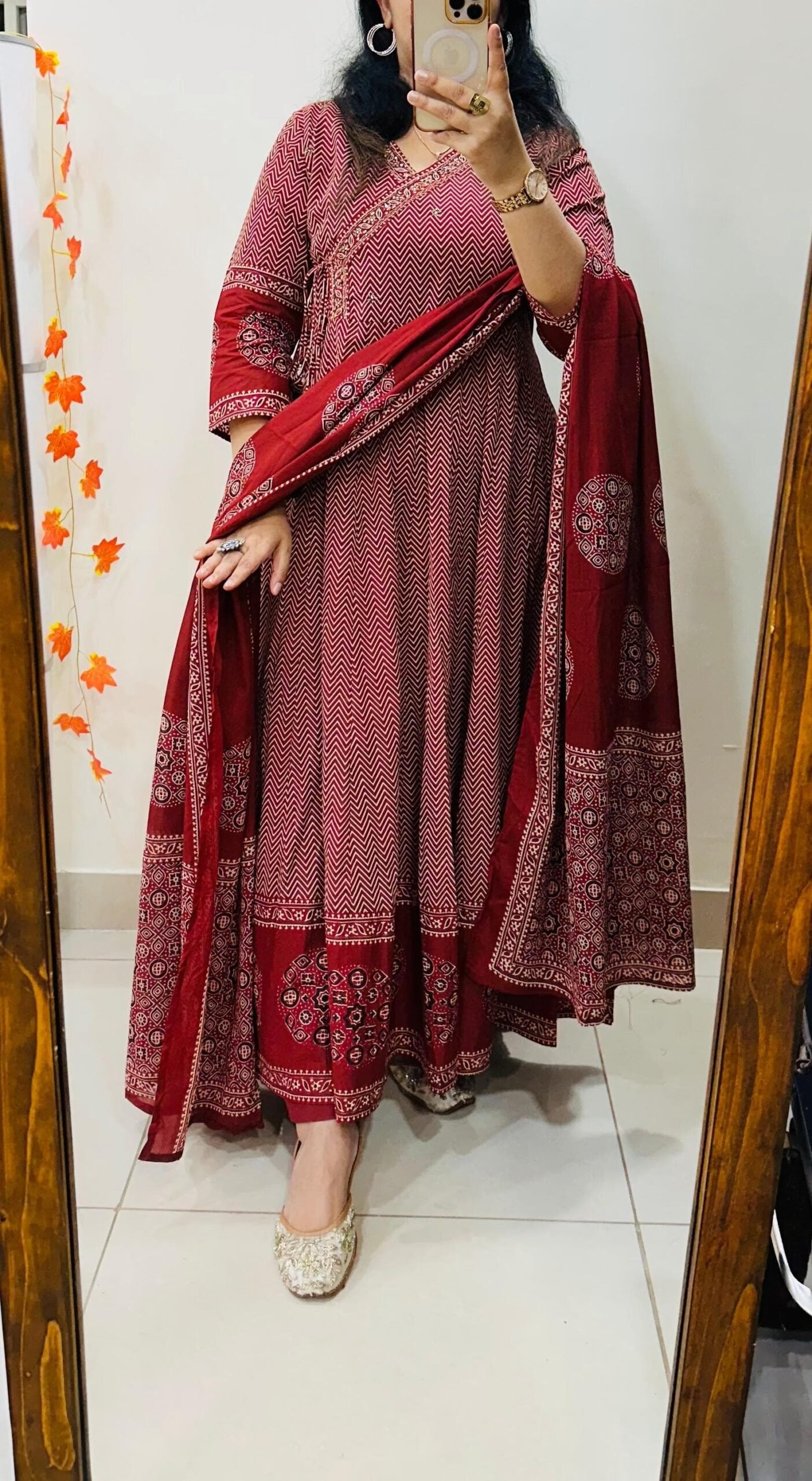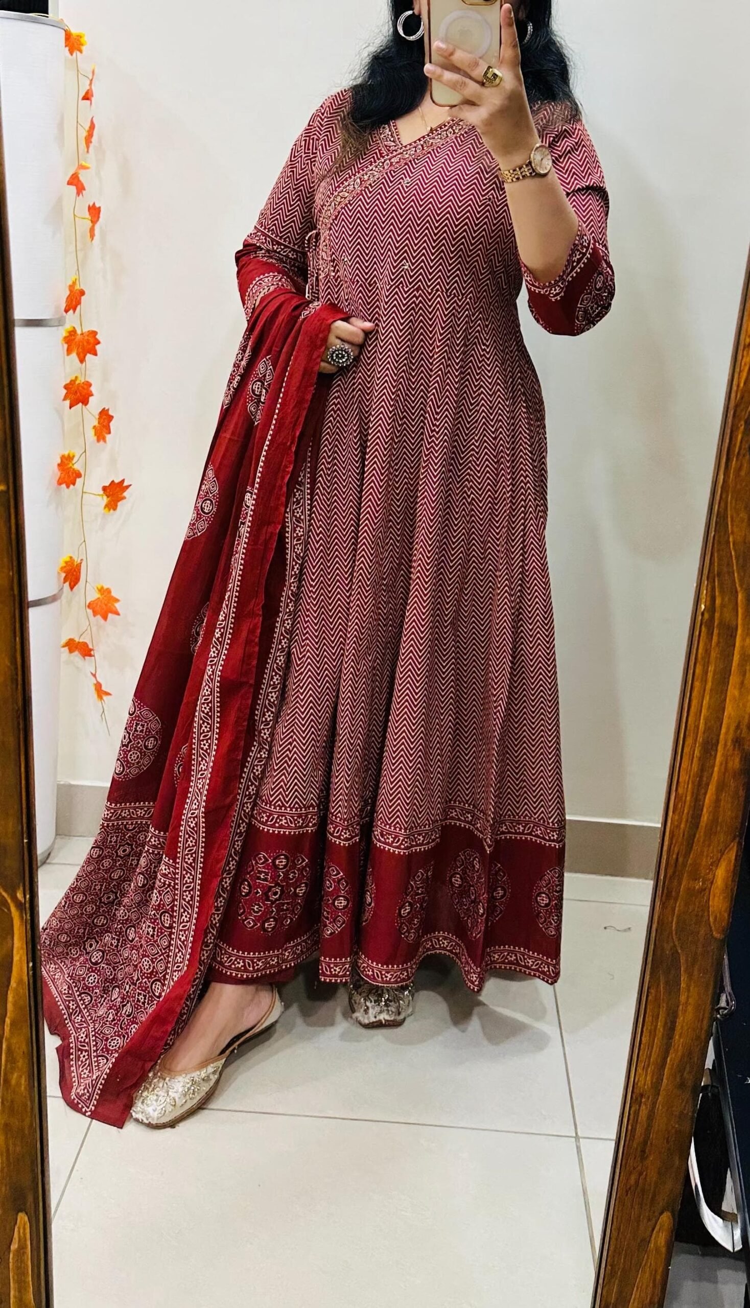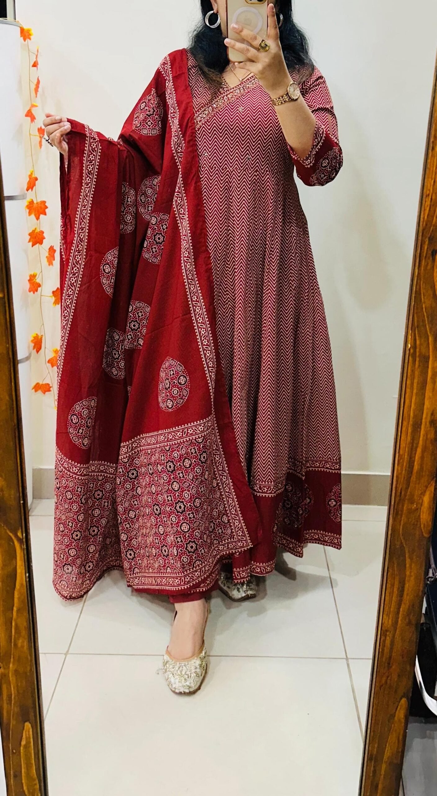 Famous Cotton Azrakh Anarkali Suit With pant duppata Set with heavy work in yoke with side fitting dori…..