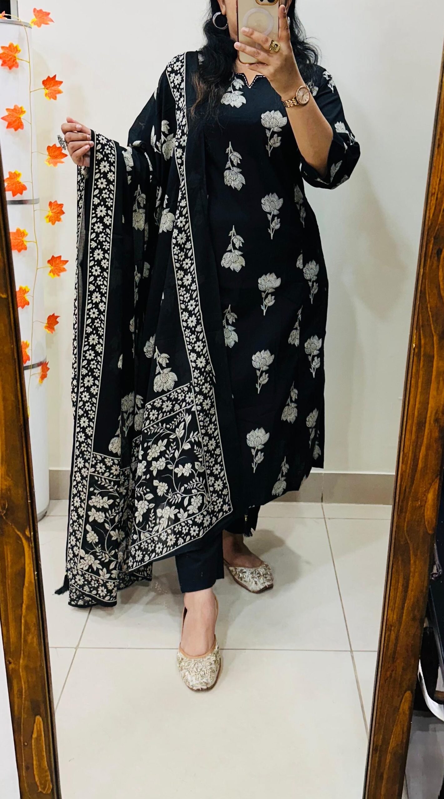 Beautiful kurti Pant dupatta set in Premium Cotton Slub in Princesss cut Aline kurti with sequin detailing in neckline with mulmul cotton dupatta with tussels