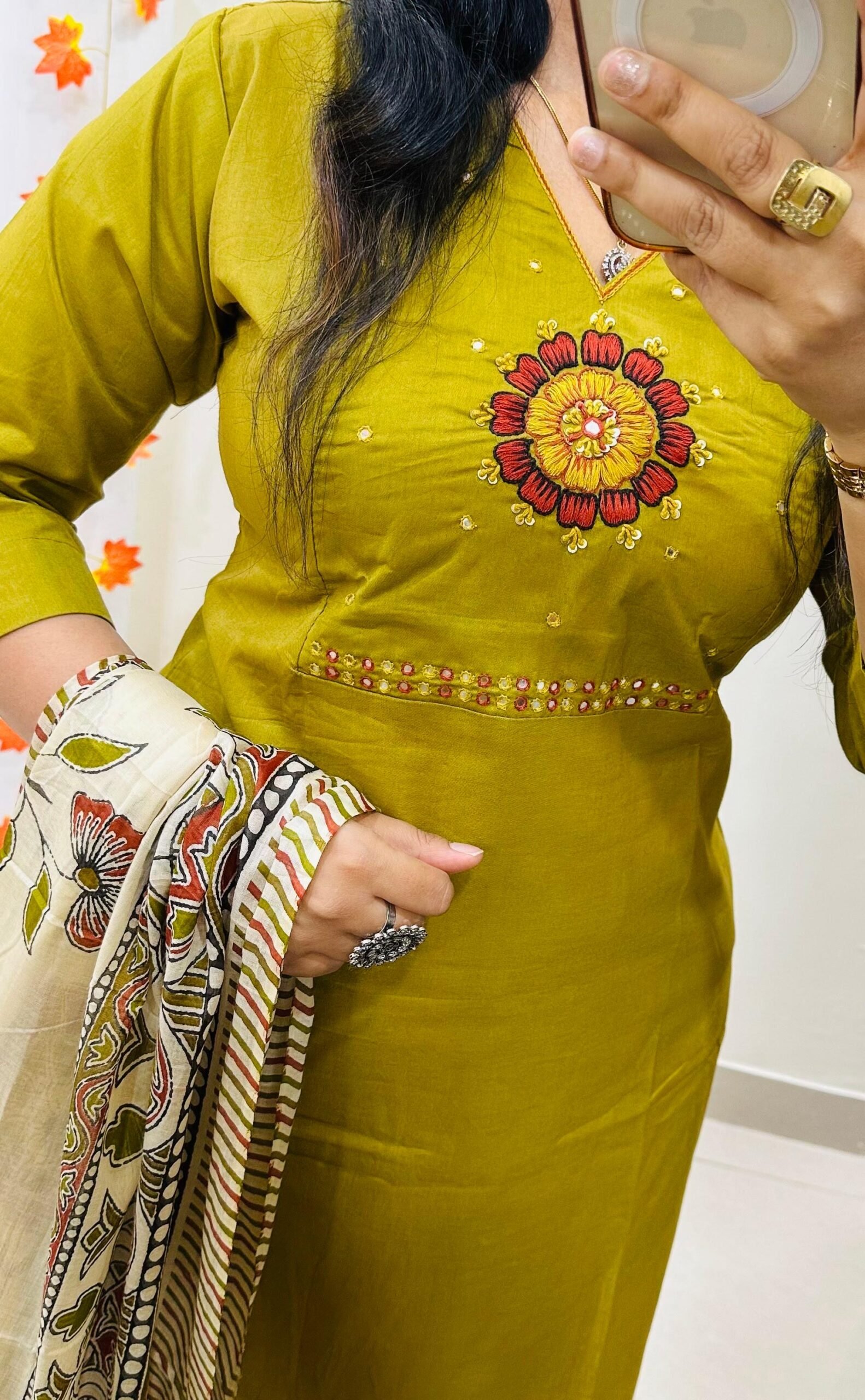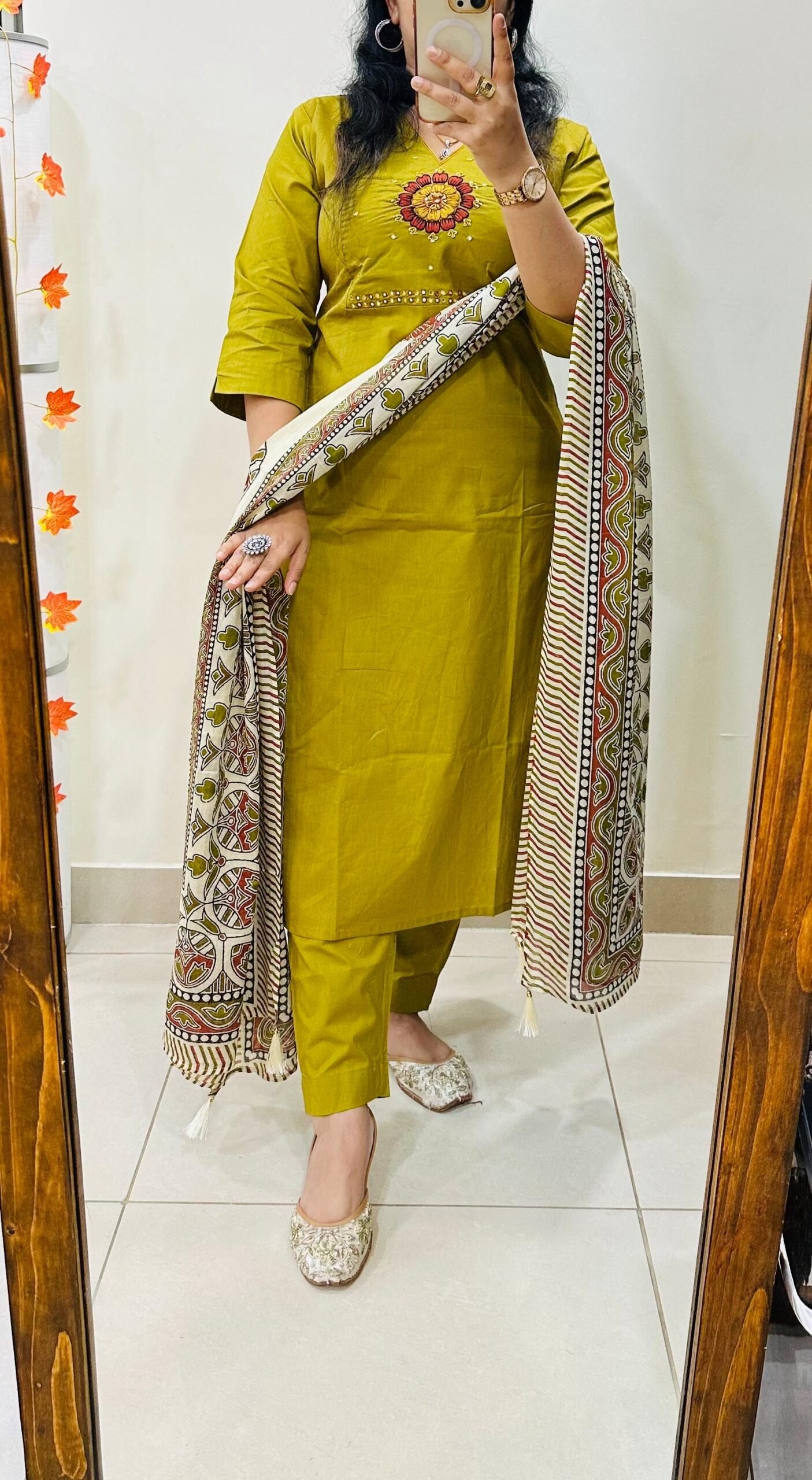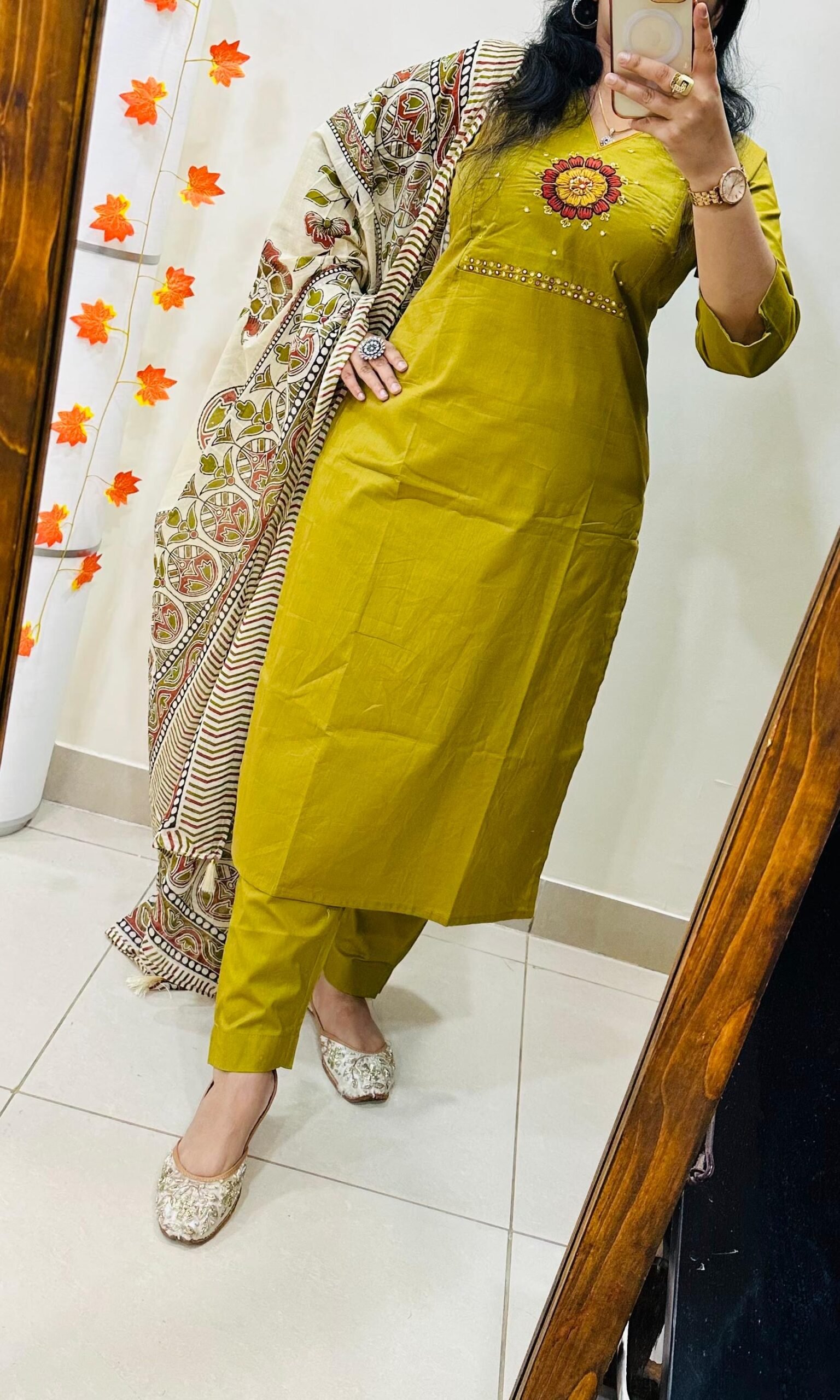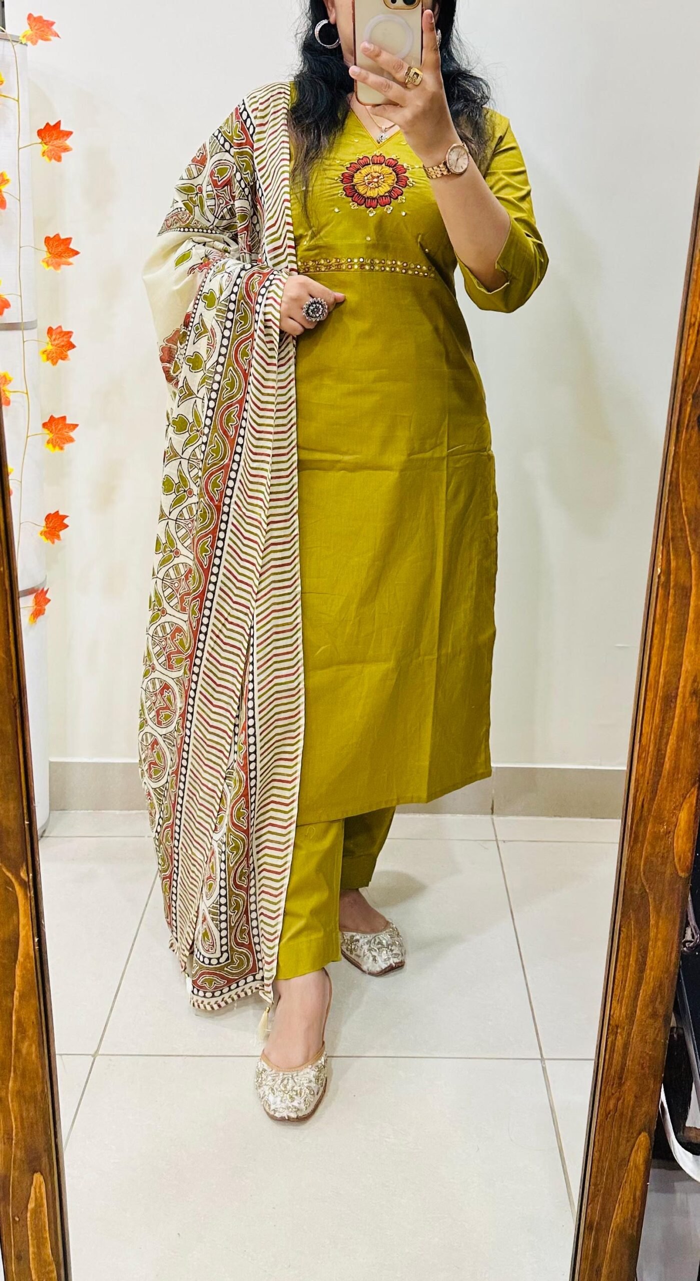 Beautiful kurti Pant dupatta set in Premium Cotton Slub in Princesss cut Aline kurti with sequin detailing in neckline with mulmul cotton dupatta with tussels